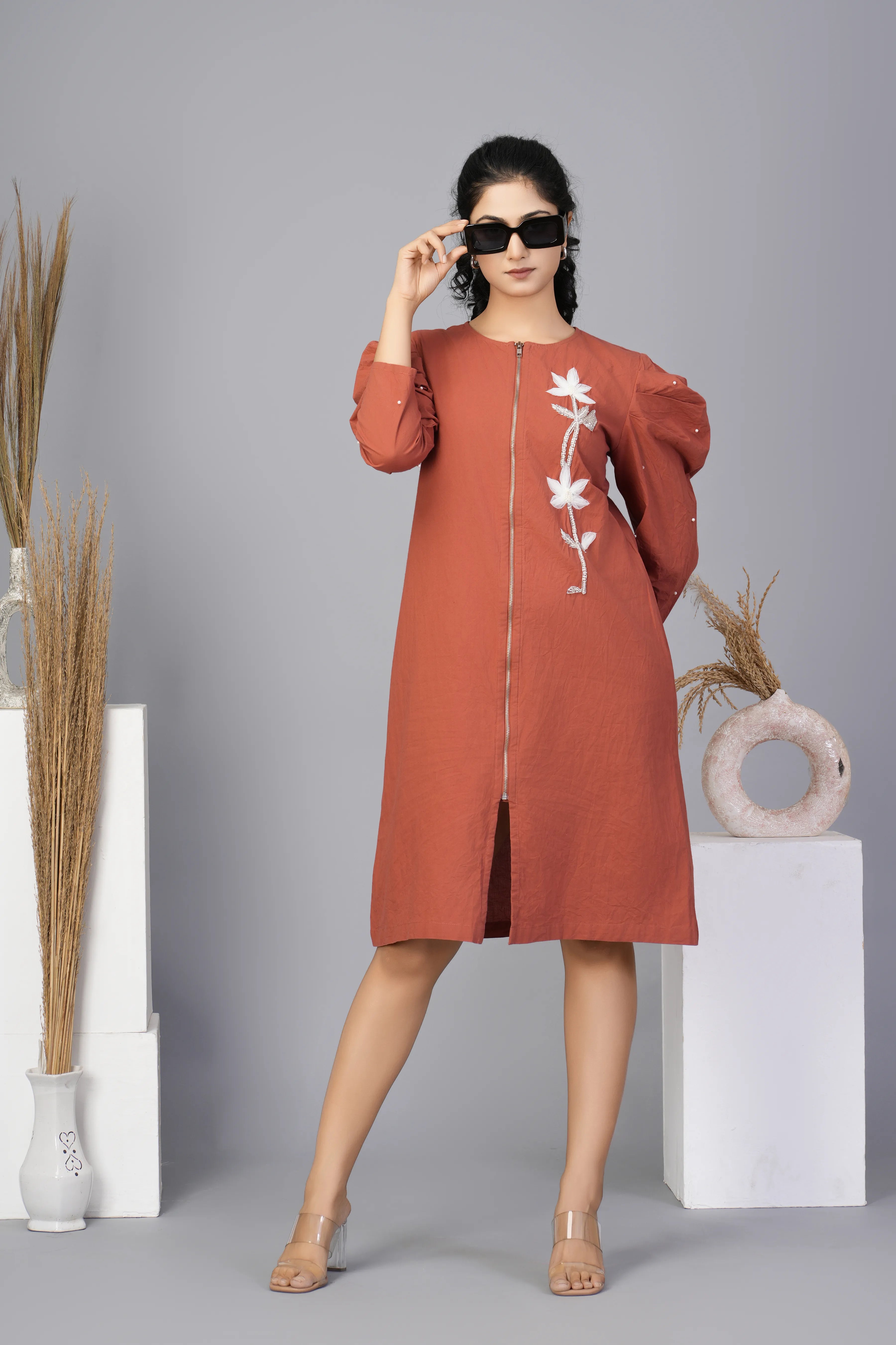 Add a touch of effortless style to your wardrobe with this rust orange midi dress, designed to combine comfort with modern sophistication. Featuring an net flower motif , this dress stands out with its vibrant color and contemporary charm. The round neck, 3/4th sleeves & zip front detailed, and flattering silhouette make it a versatile piece for casual outings or relaxed occasions.