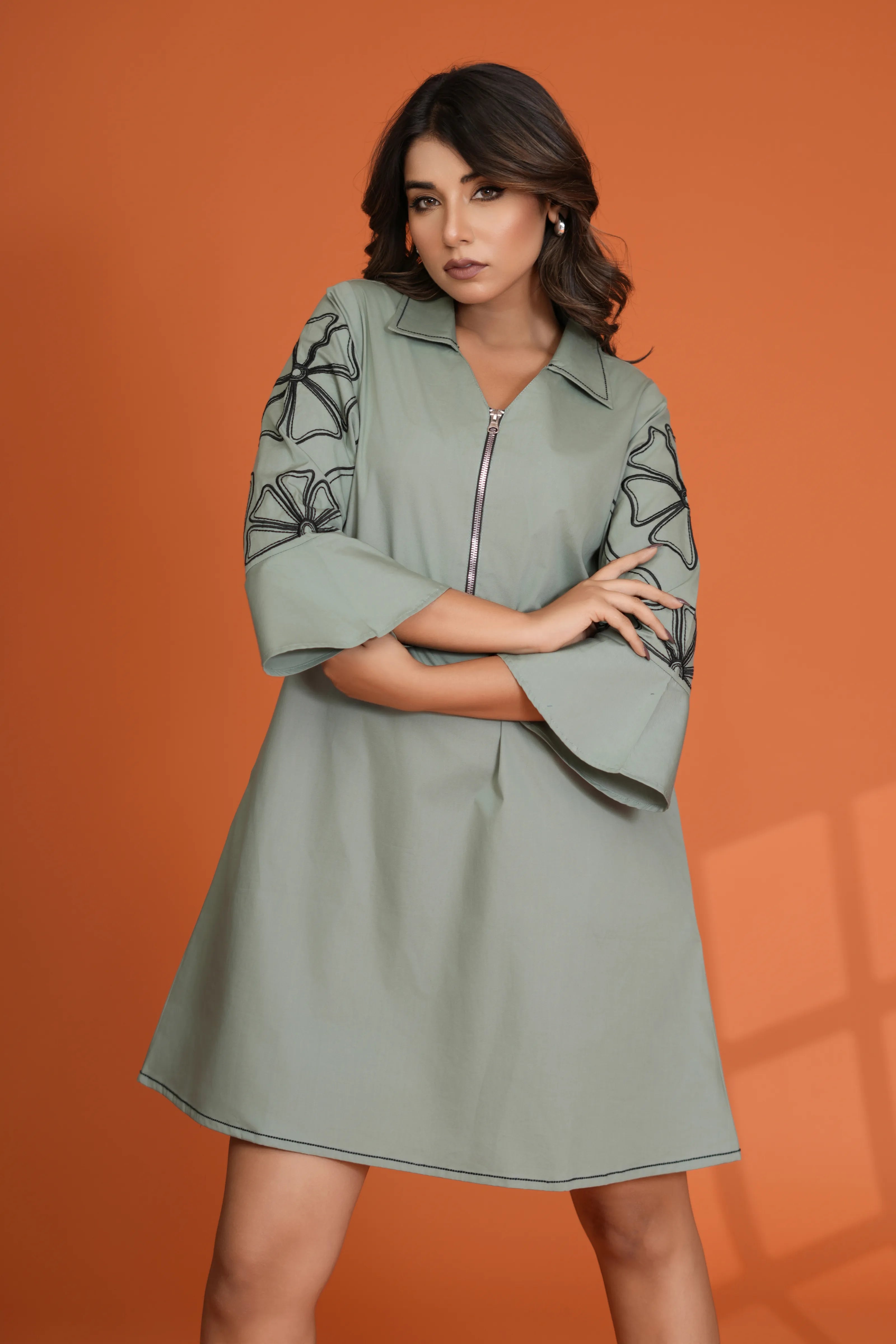 Featuring a sharp shirt collar and front zipper detail, the dress flows into an easy A-line cut that flatters the body without clinging. Voluminous bell sleeves steal the spotlight, adorned with oversized floral motif embroidery that adds texture, femininity, and just the right amount of edge.