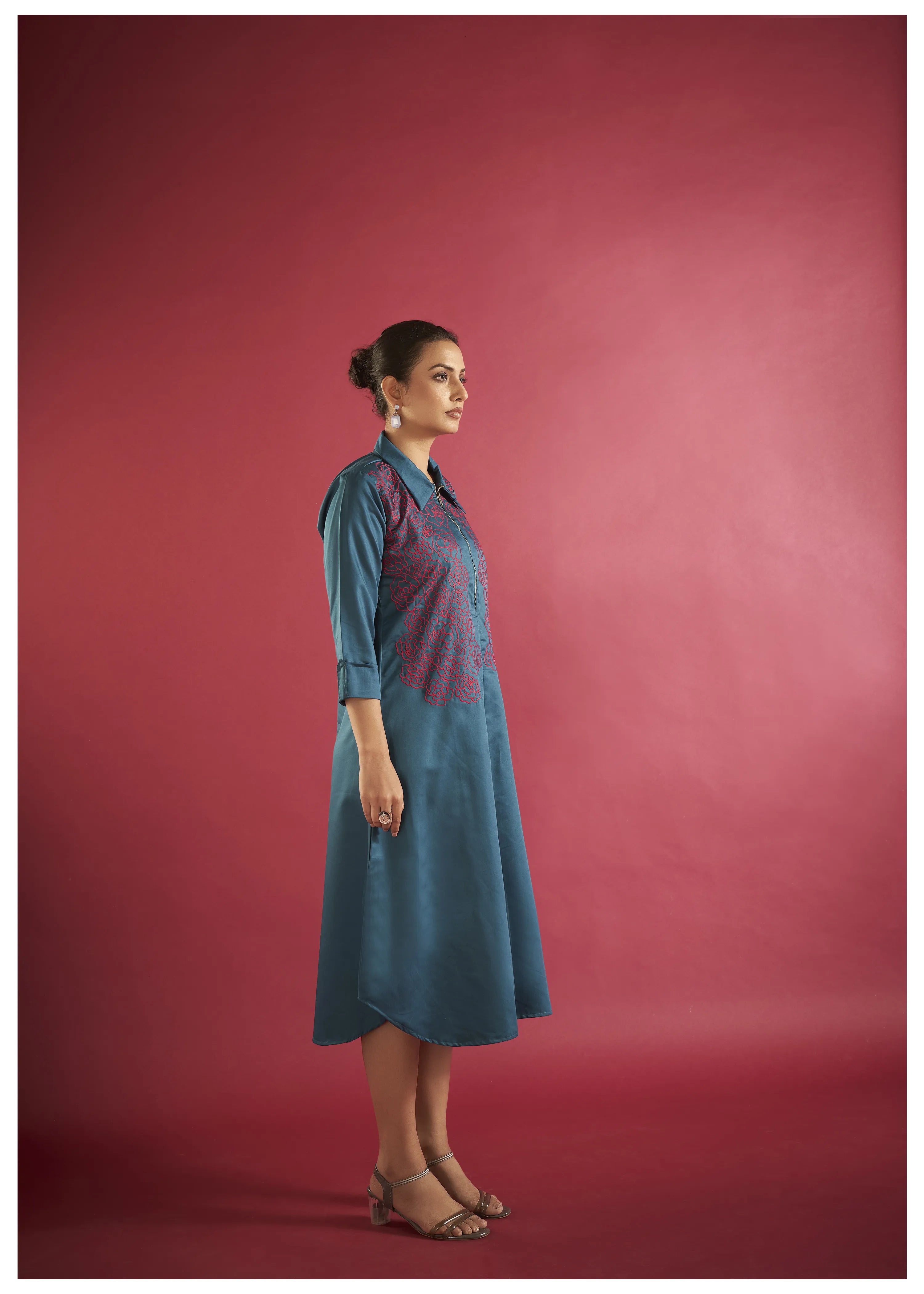Step into effortless elegance with the Teal Blue Embroidered Thread Work Poplin Dress, a perfect fusion of sophistication and comfort. Crafted from premium poplin fabric, this A-line long dress features intricate thread embroidery that enhances its refined appeal. The structured collar, front zipper closure, and 3/4th sleeves with single-fold cuffs add a tailored yet graceful touch.