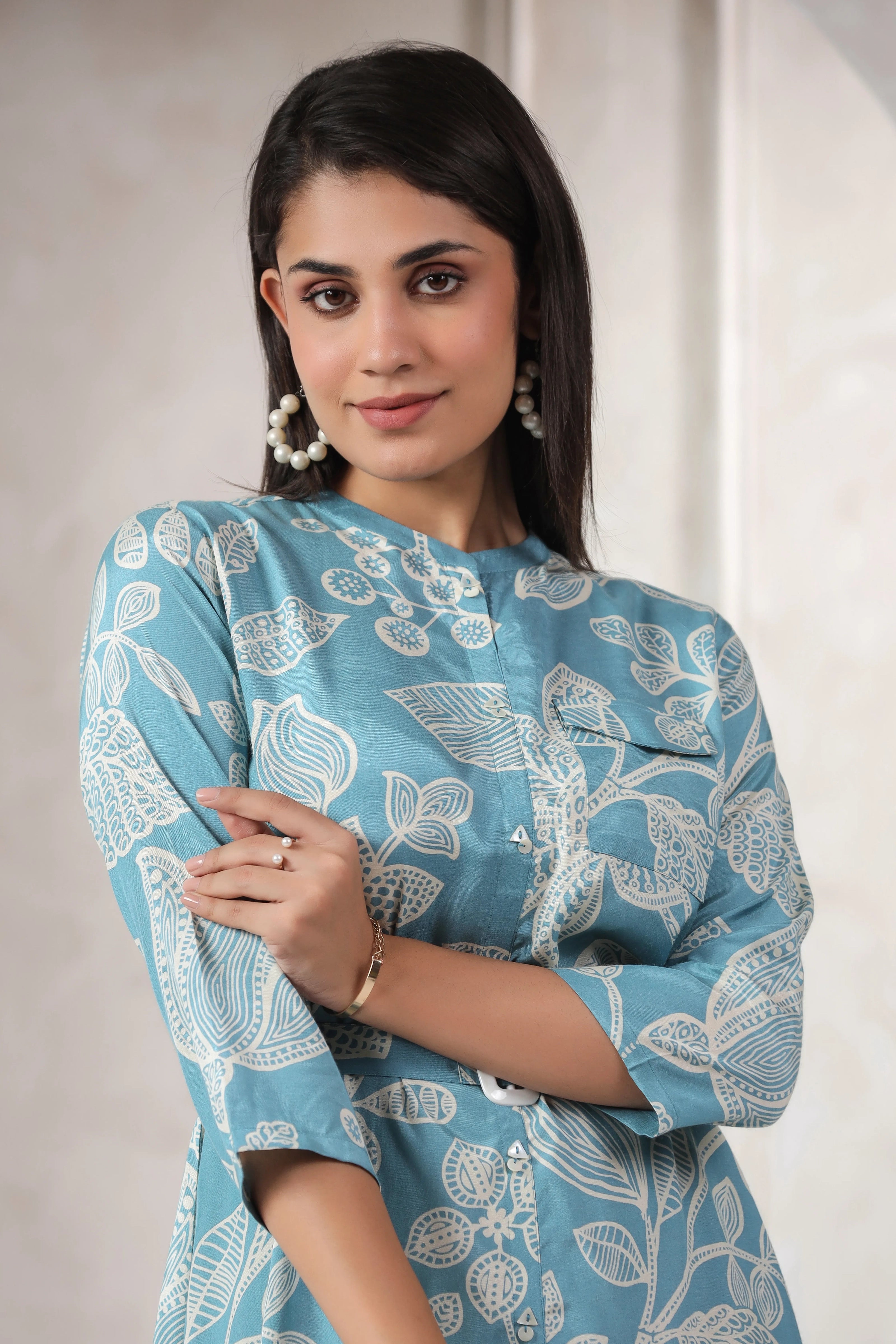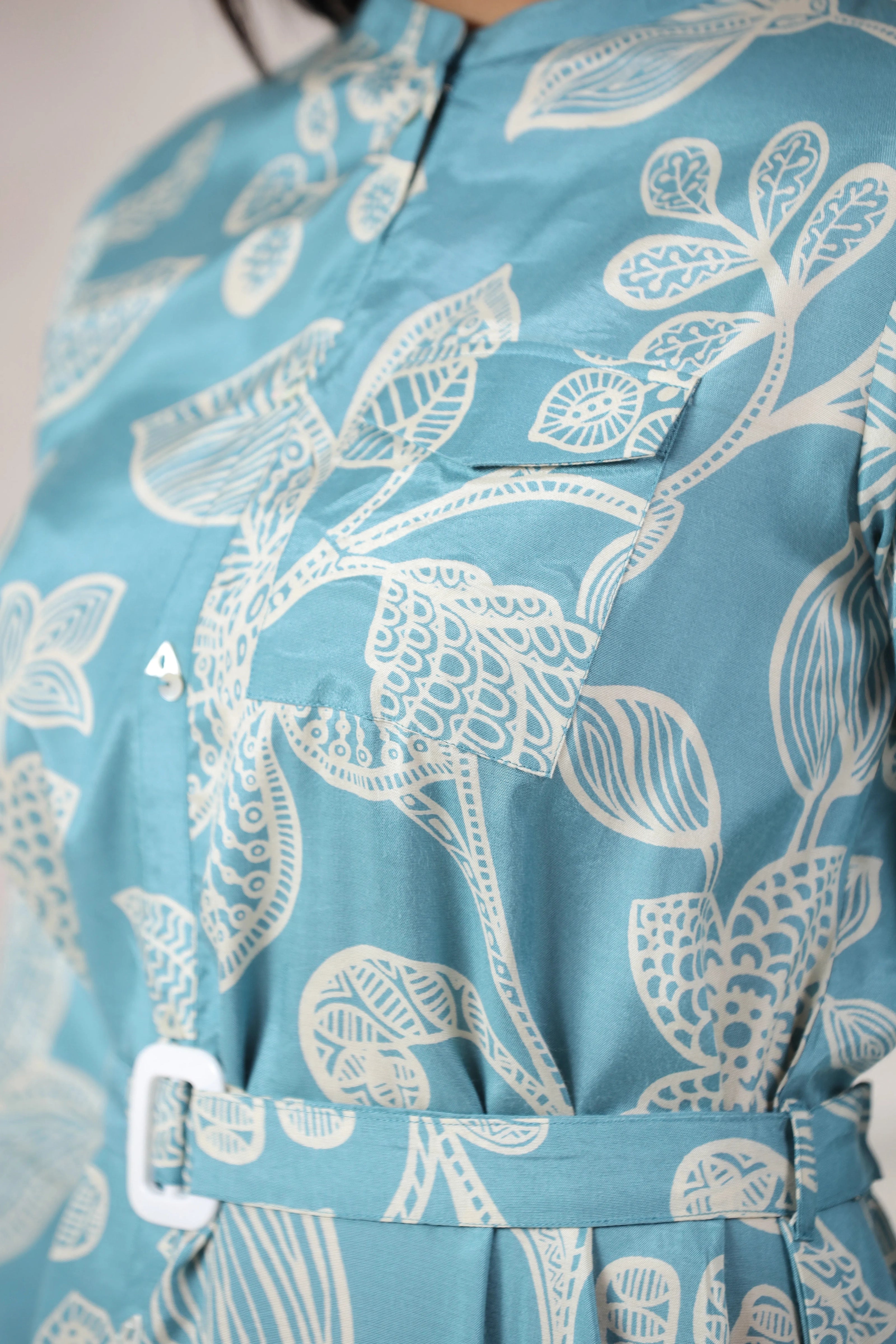 Turquoise Blue Russian Silk Floral Print Mini Dress with Belt: Chic & Vibrant