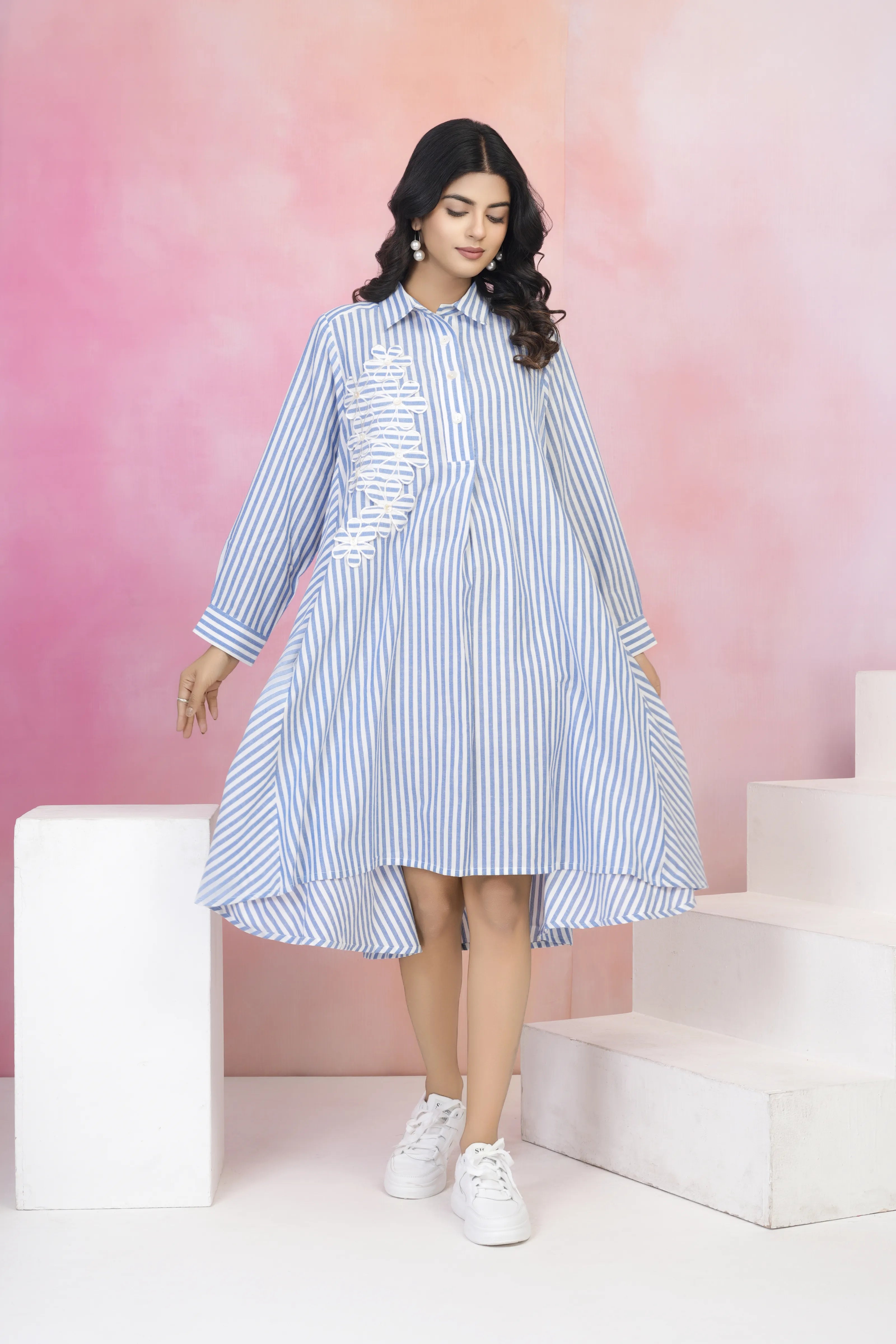 White & Blue Stripe Embroidered Cotton Shirt Dress