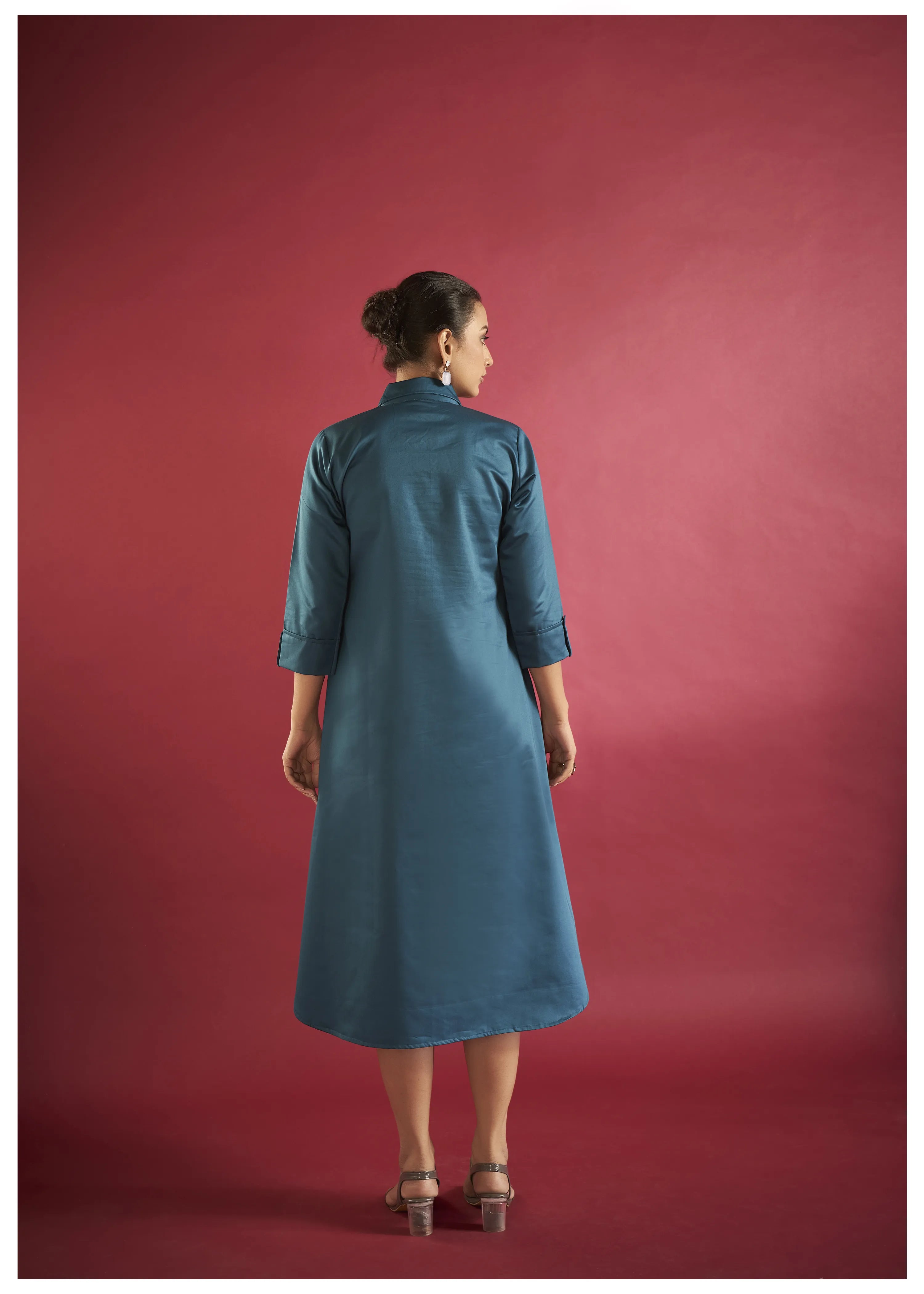 Teal Blue Russian Silk Bold Floral Printed Midi Dress