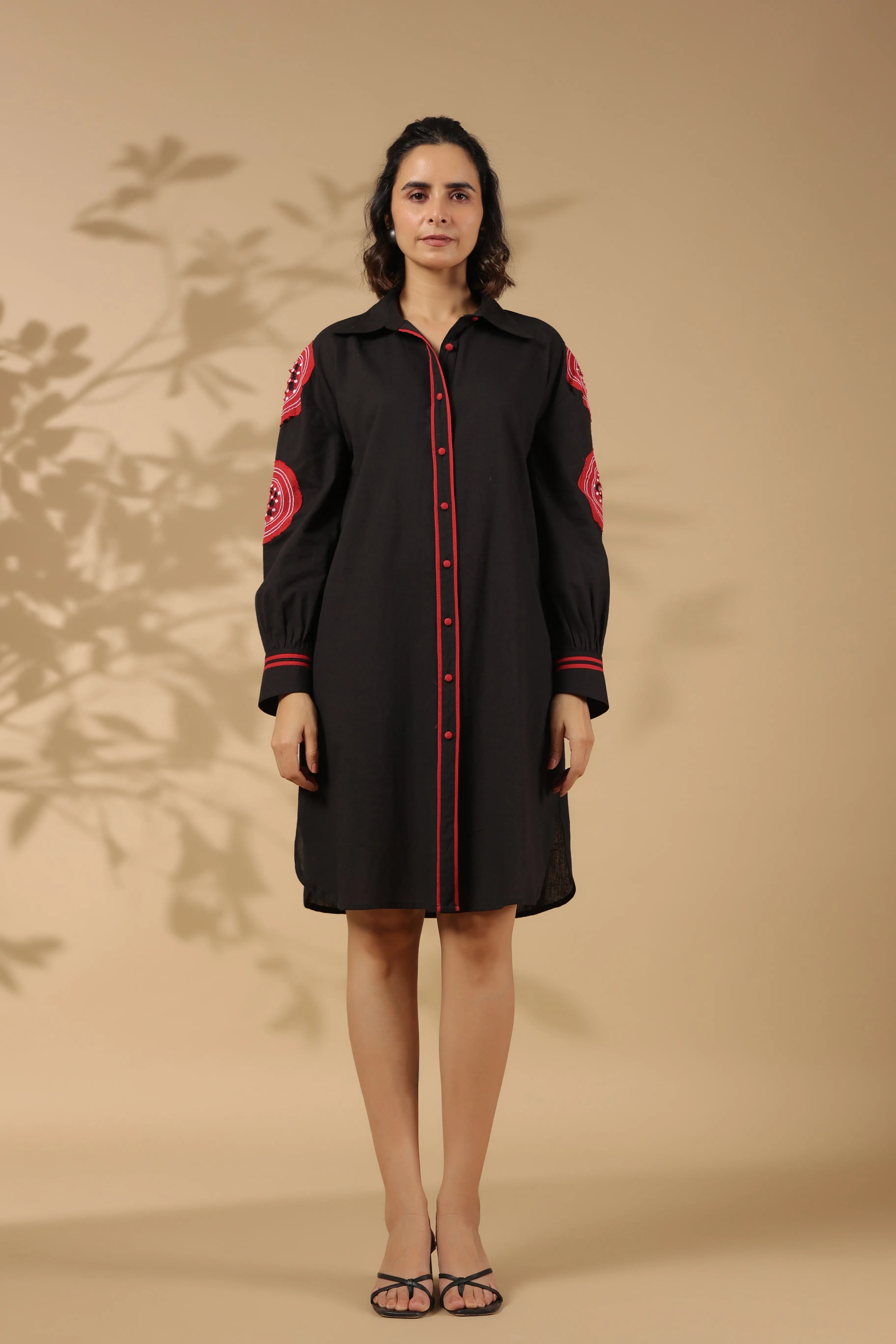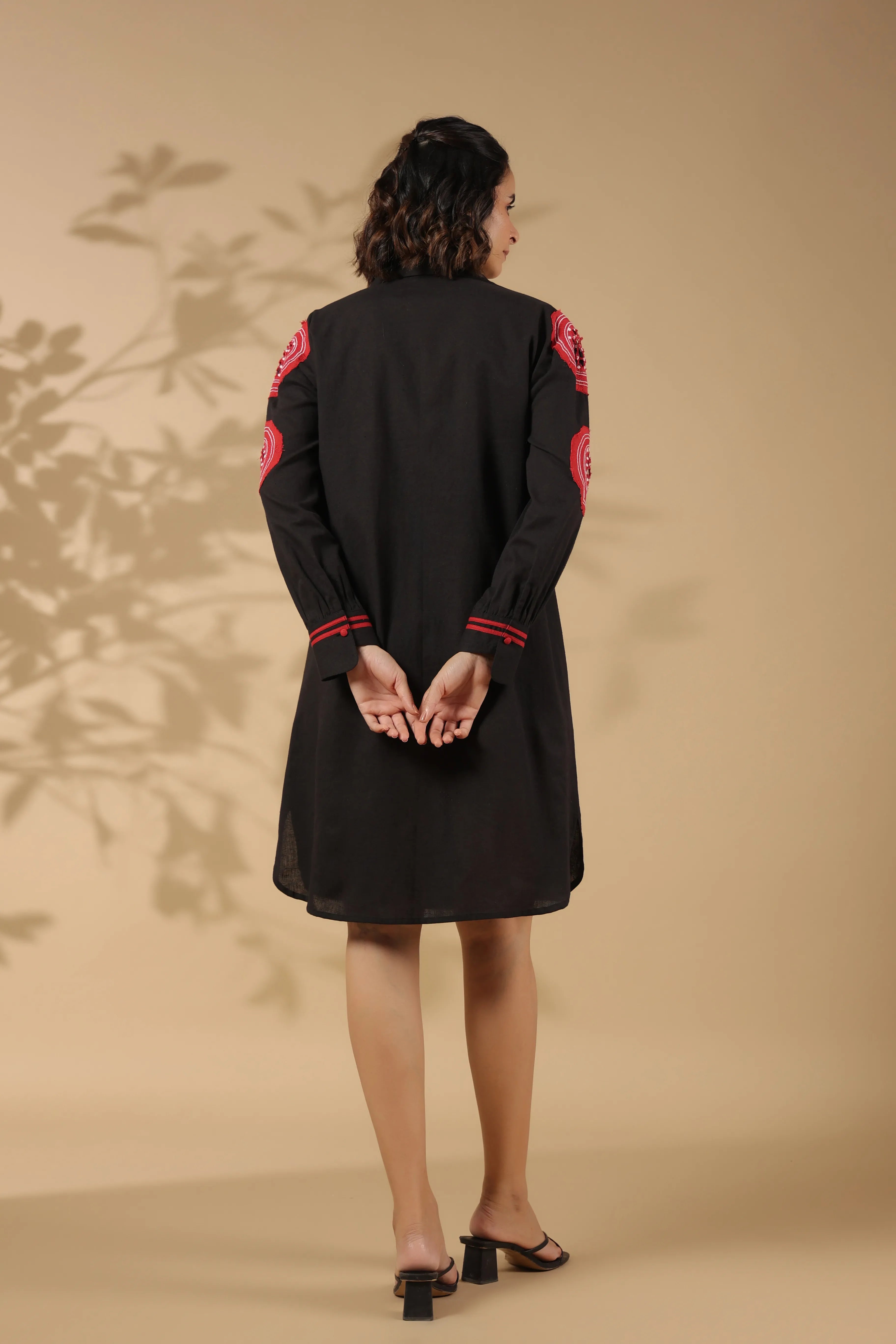 Black Floral Multi-Thread Embroidered Cotton Shirt Dress