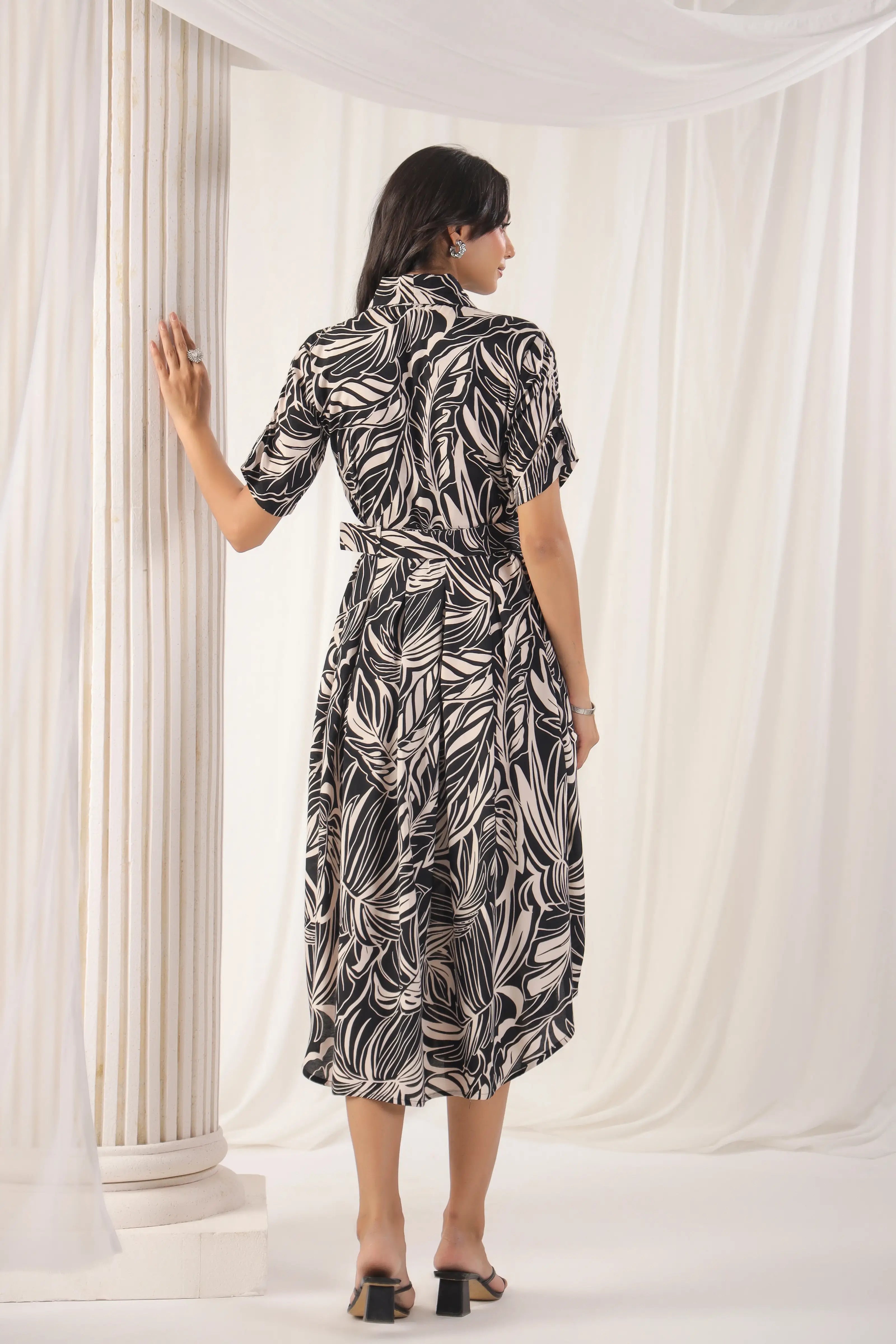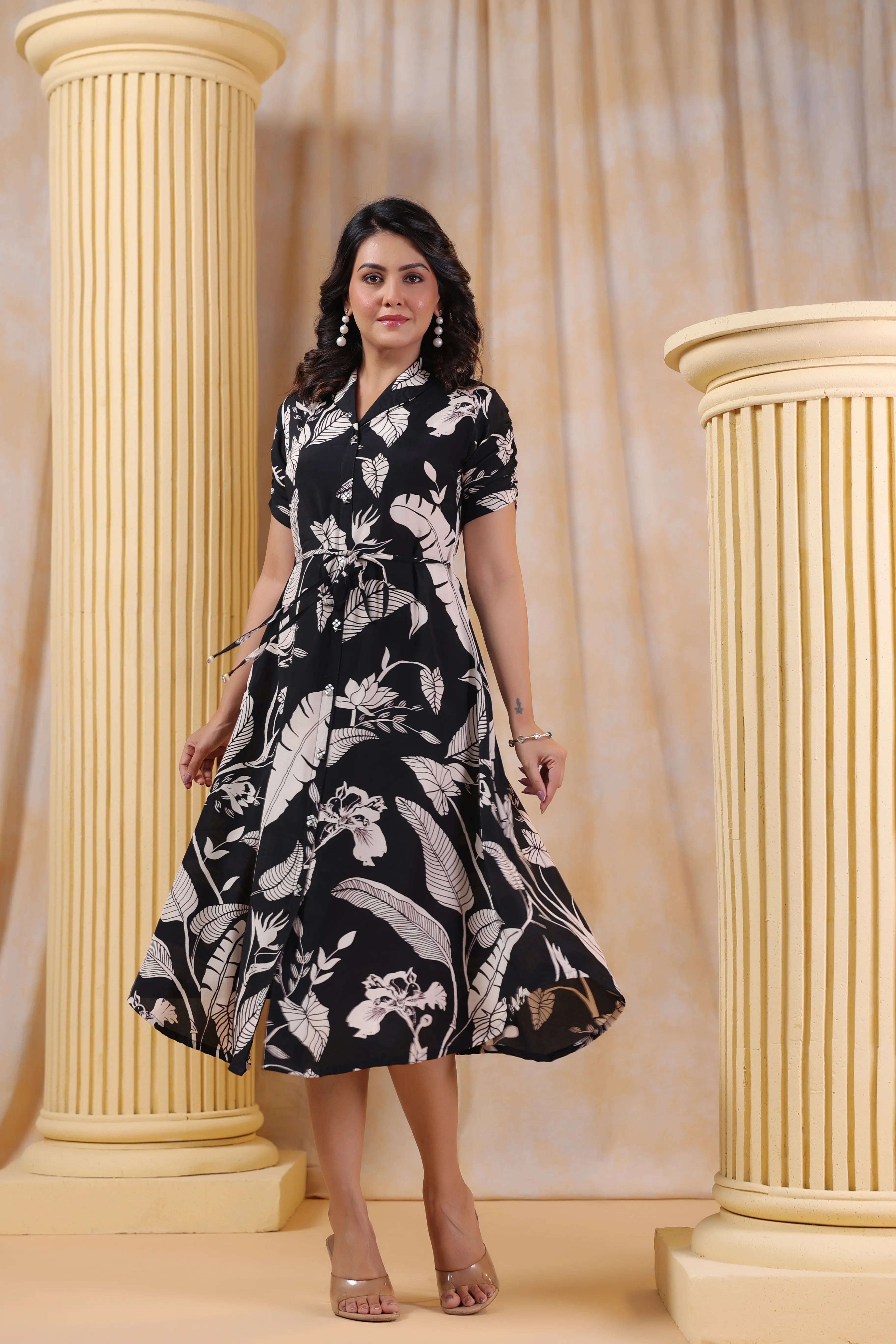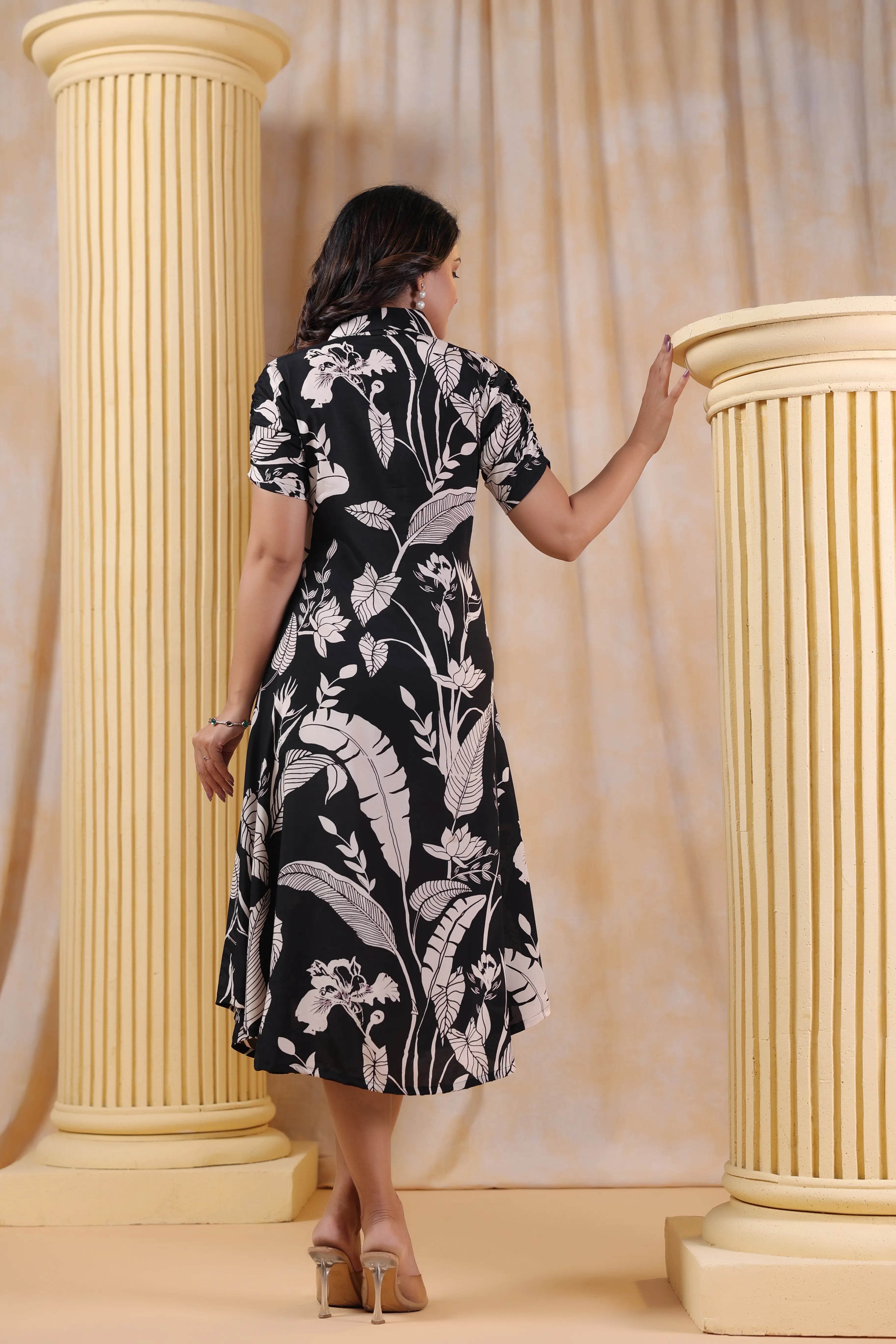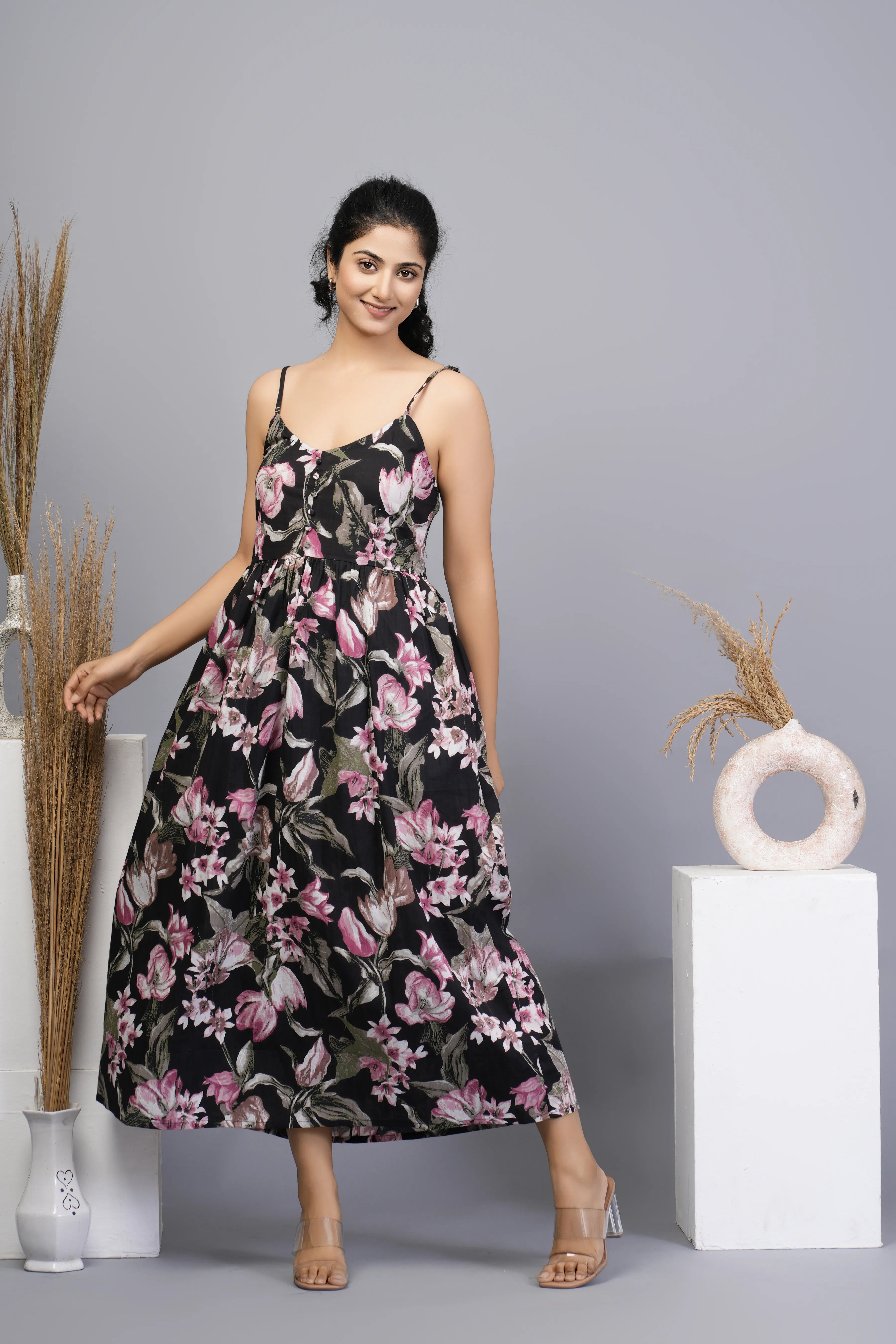 Black Base with Pink Floral Printed Cotton Midi Dress