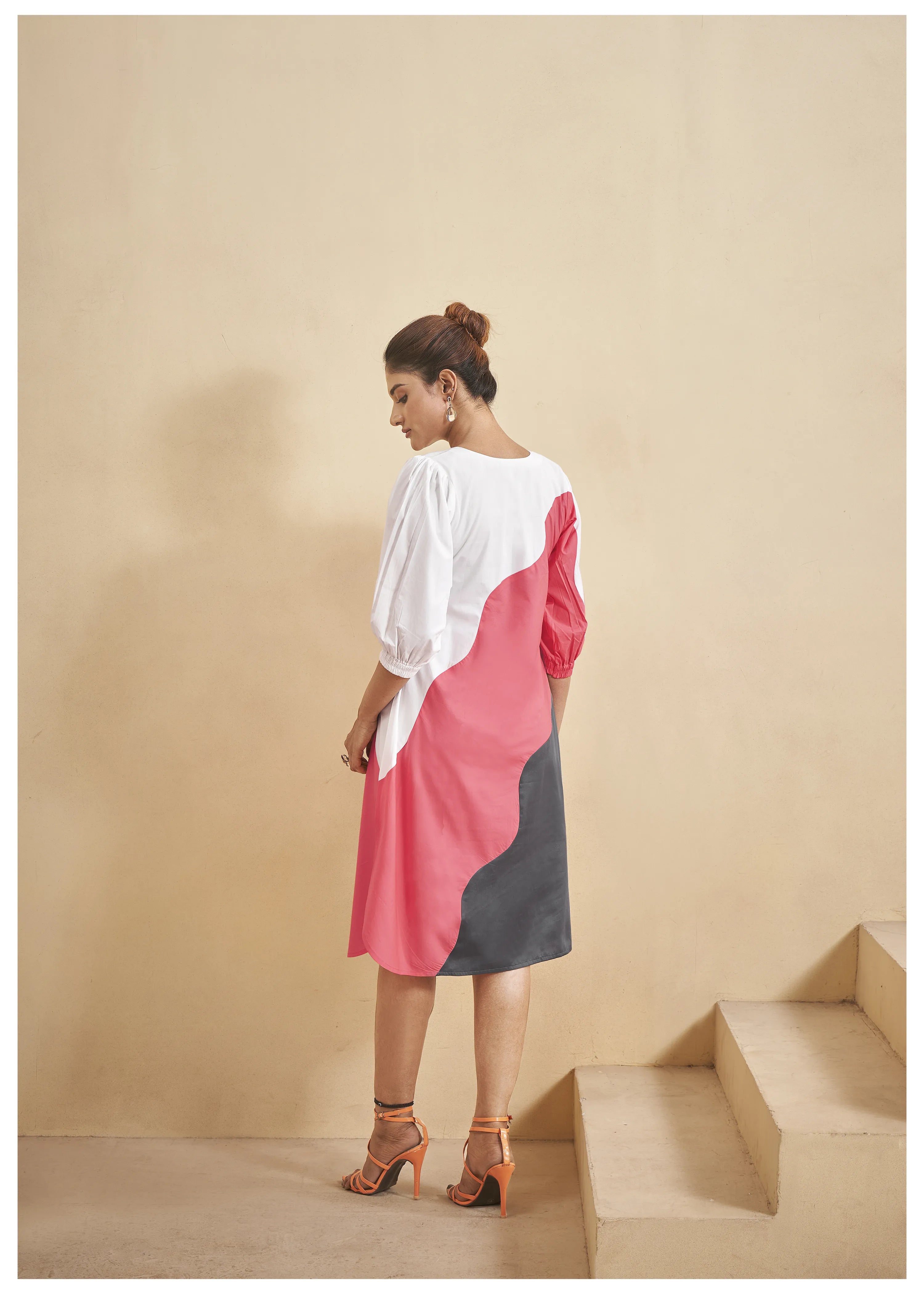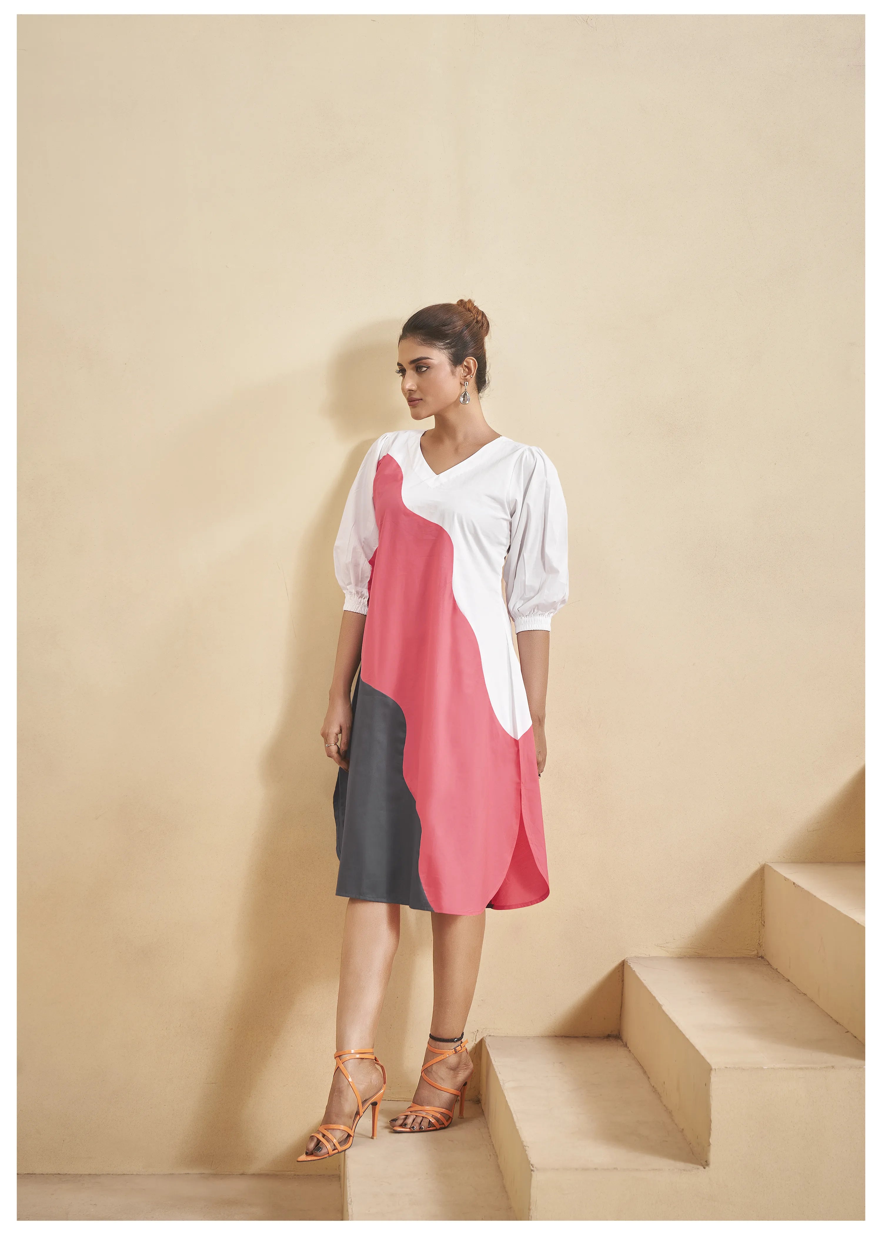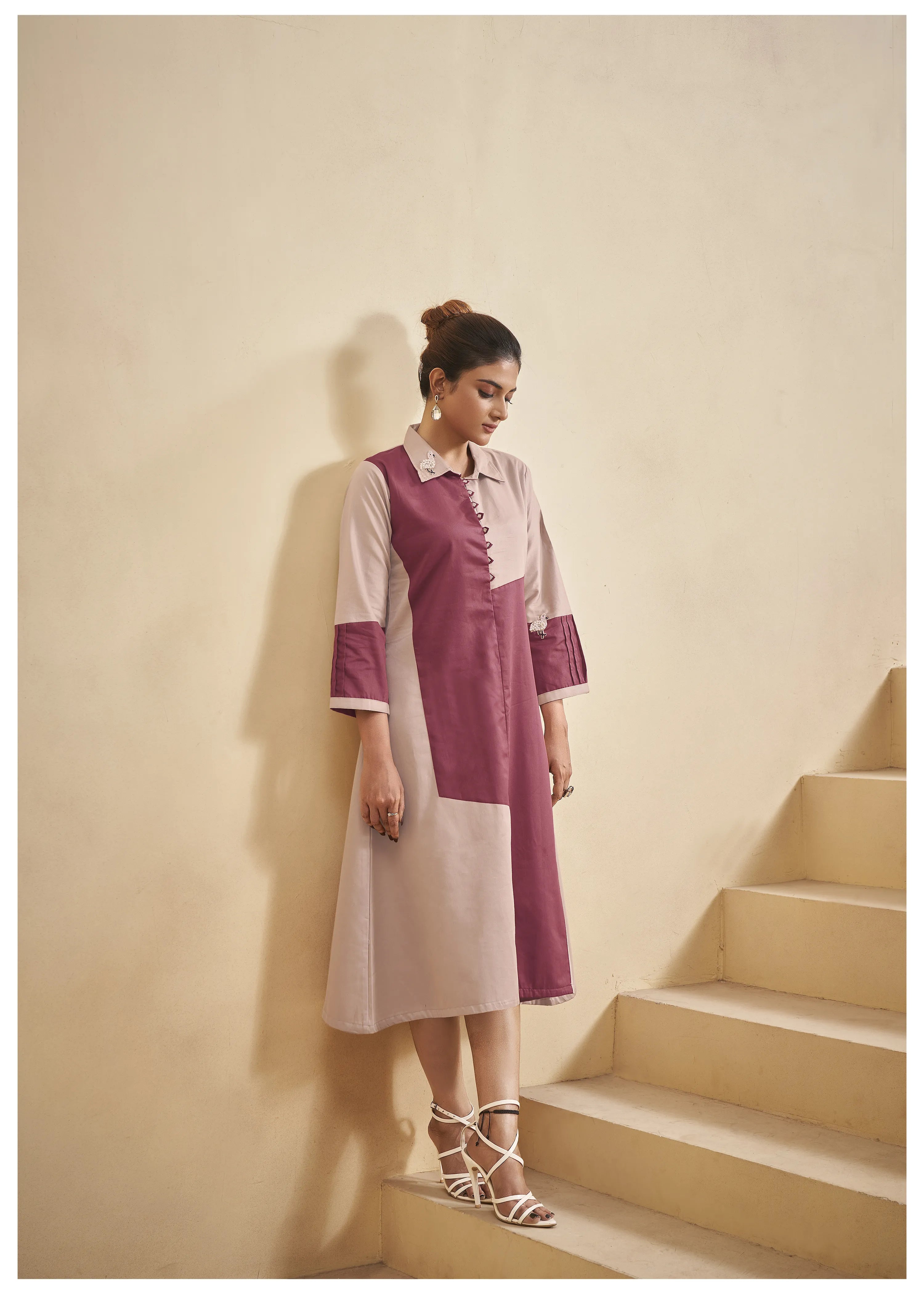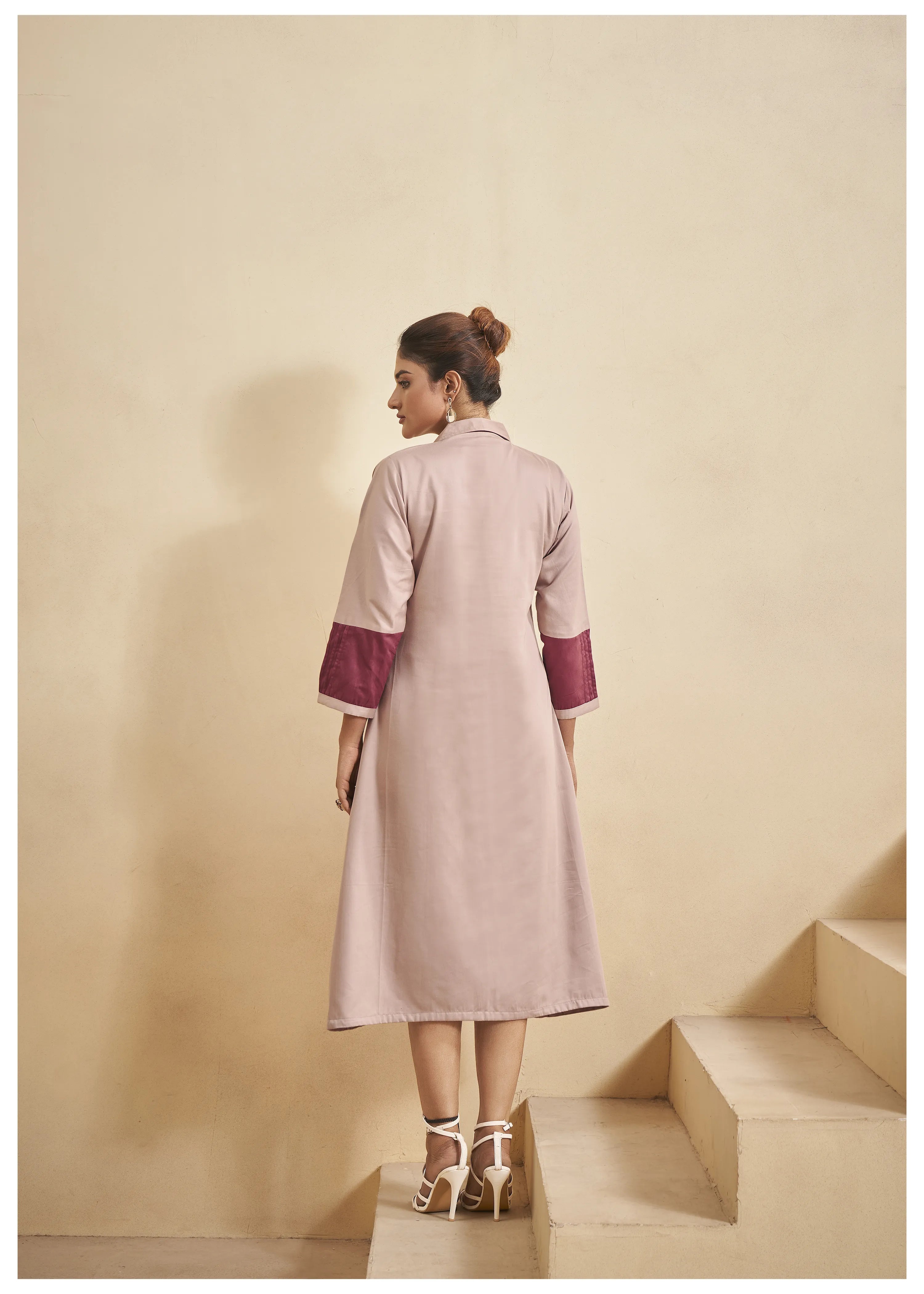 Dusty Rose and Khaki Color-Blocked Poplin A-Line Dress