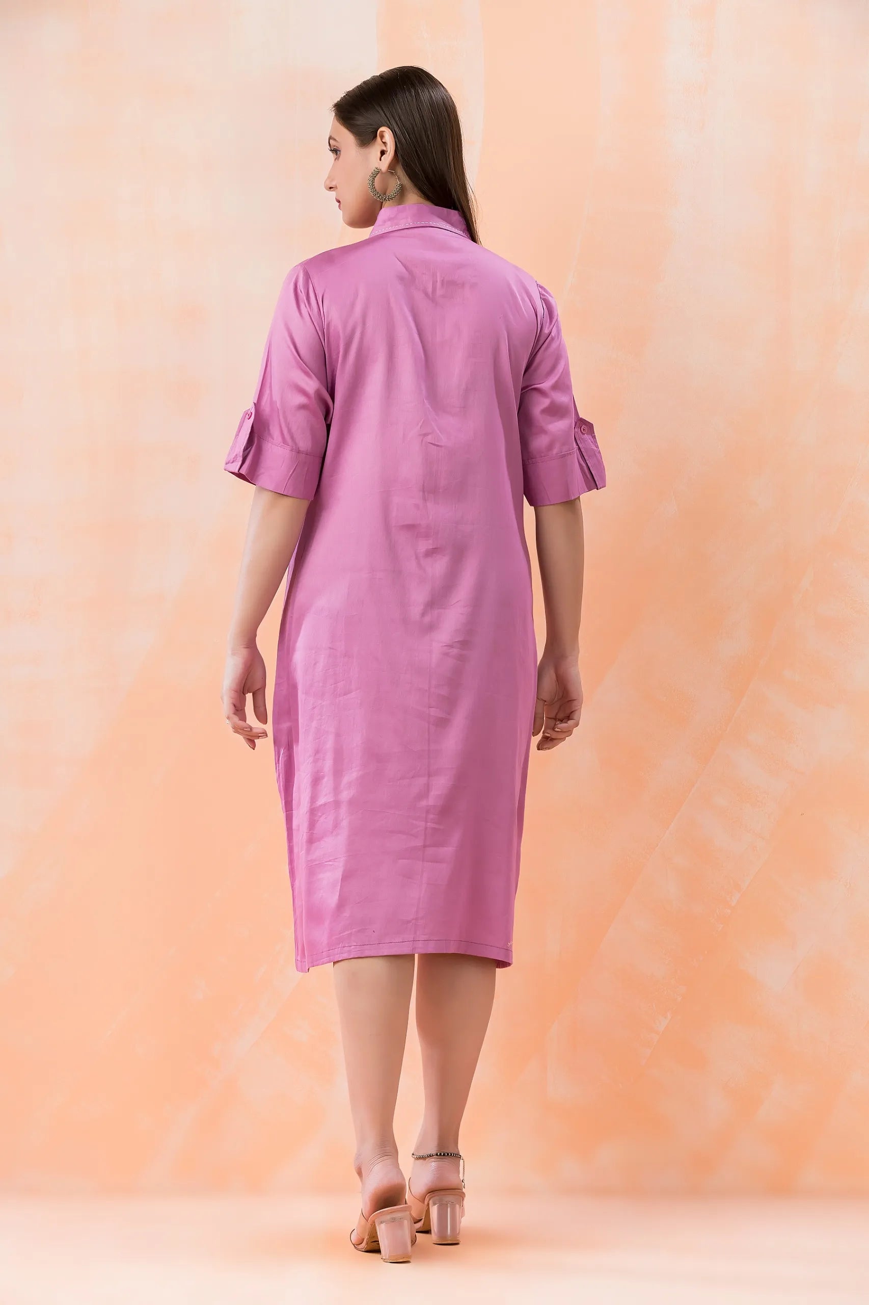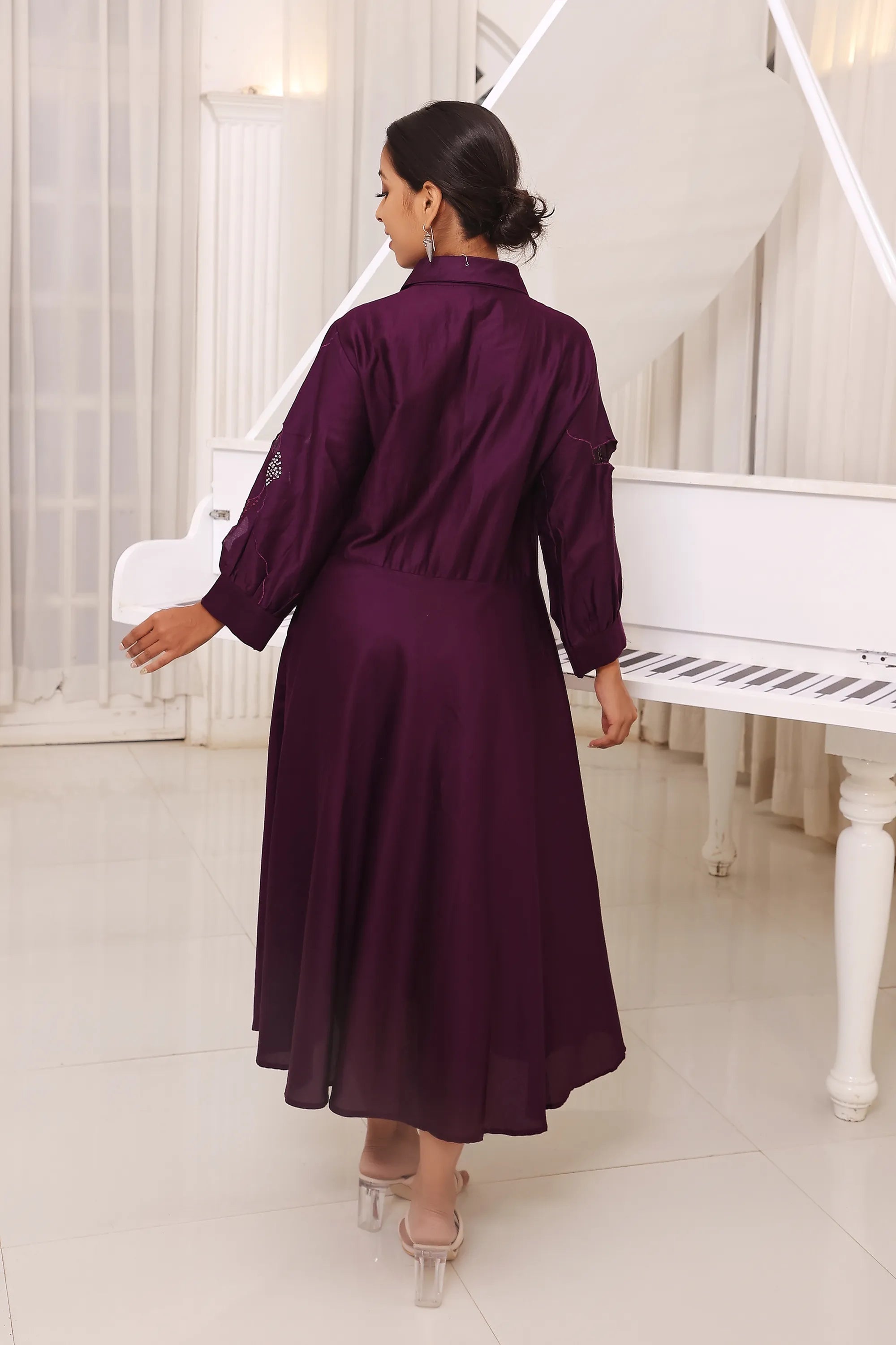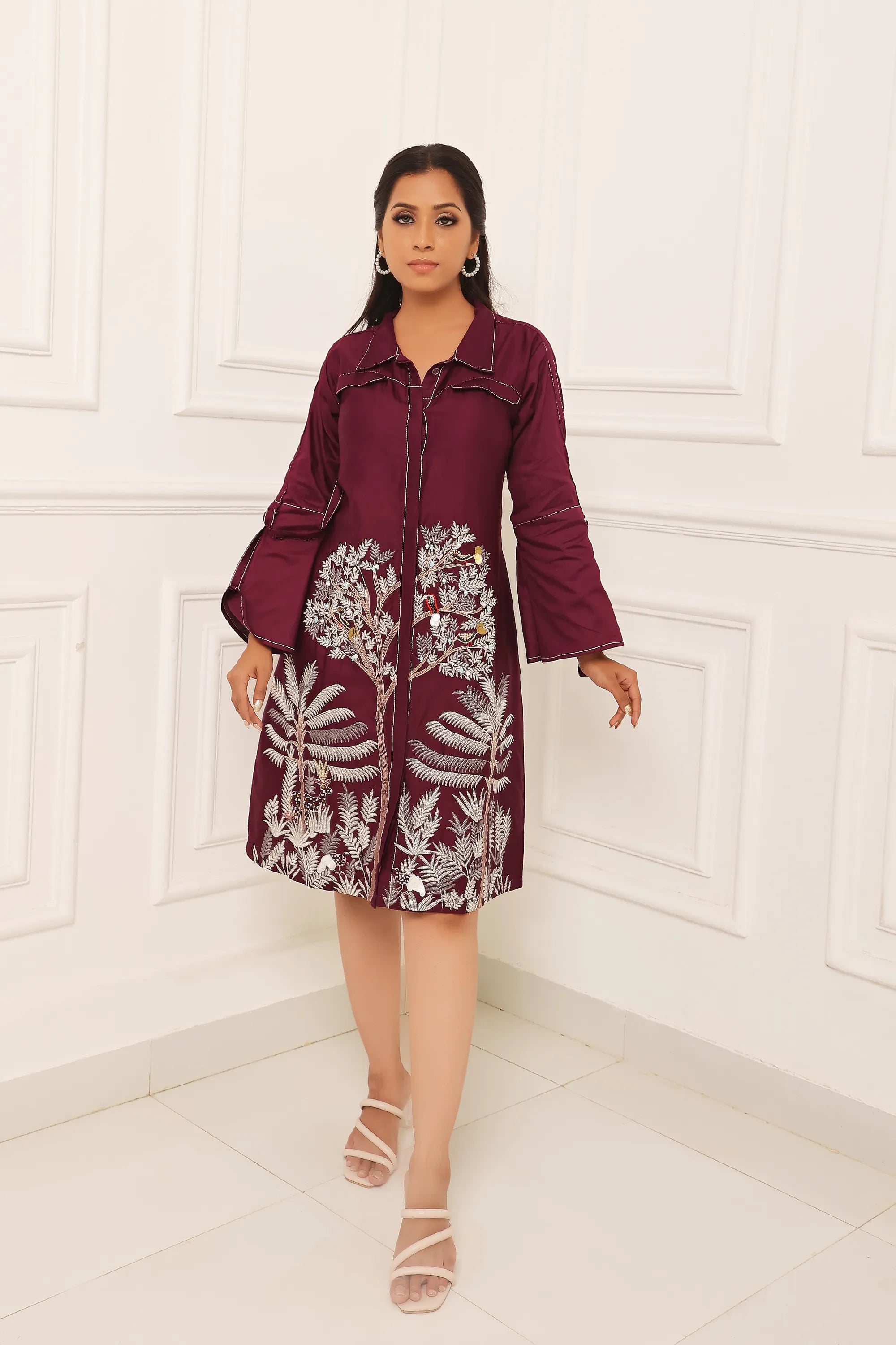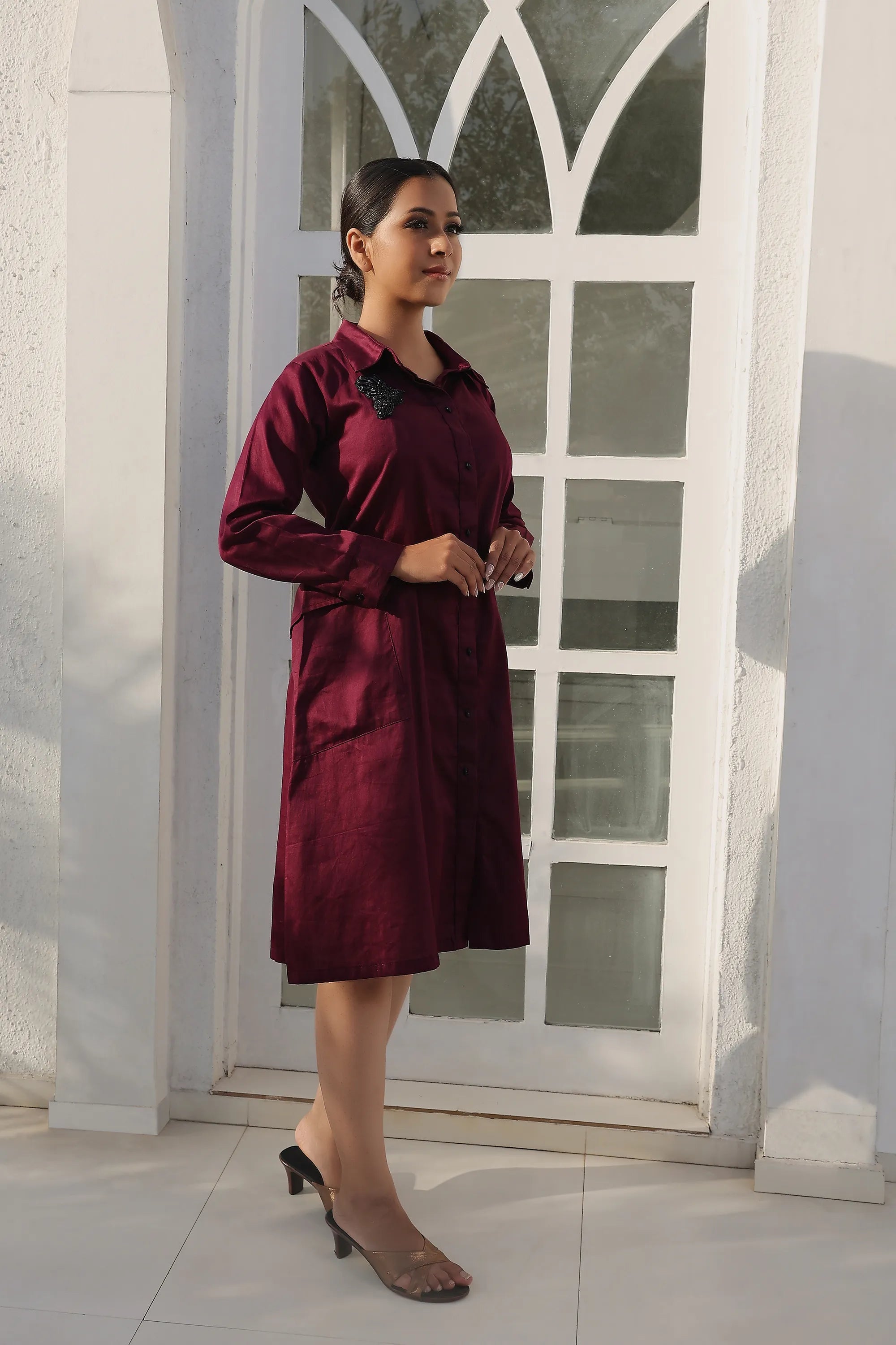 Maroon Cotton Flex Embroidered Mini Shirt Dress