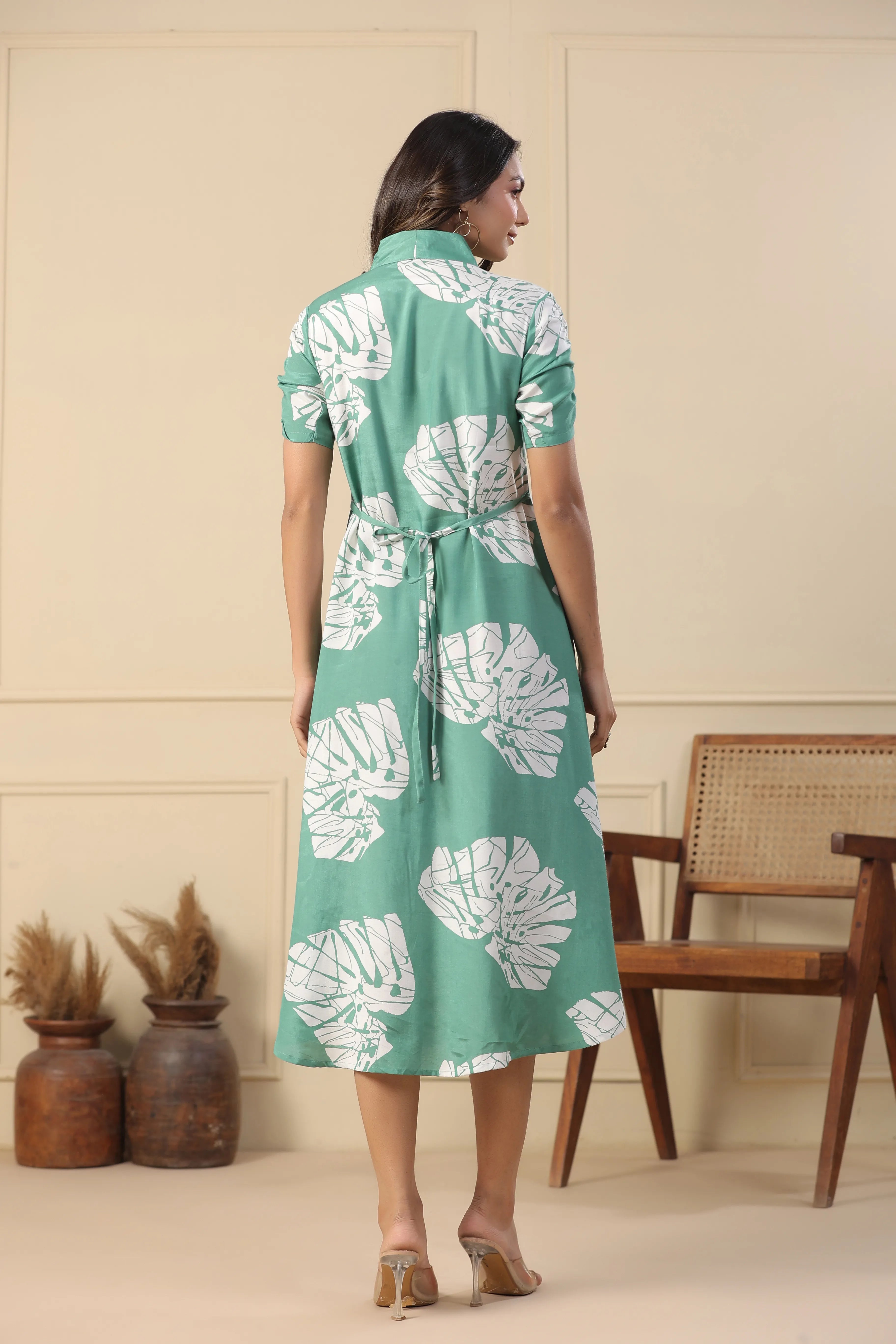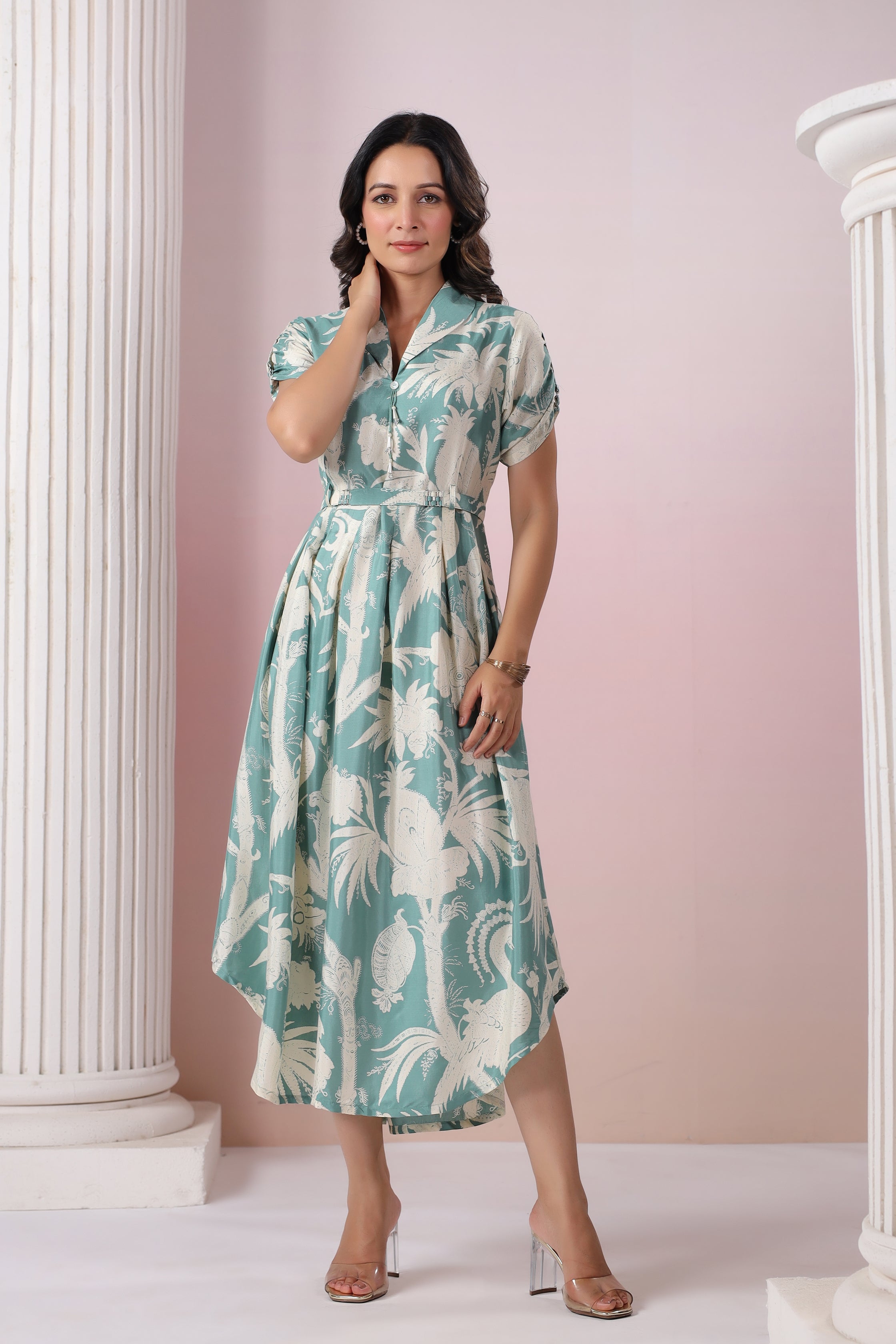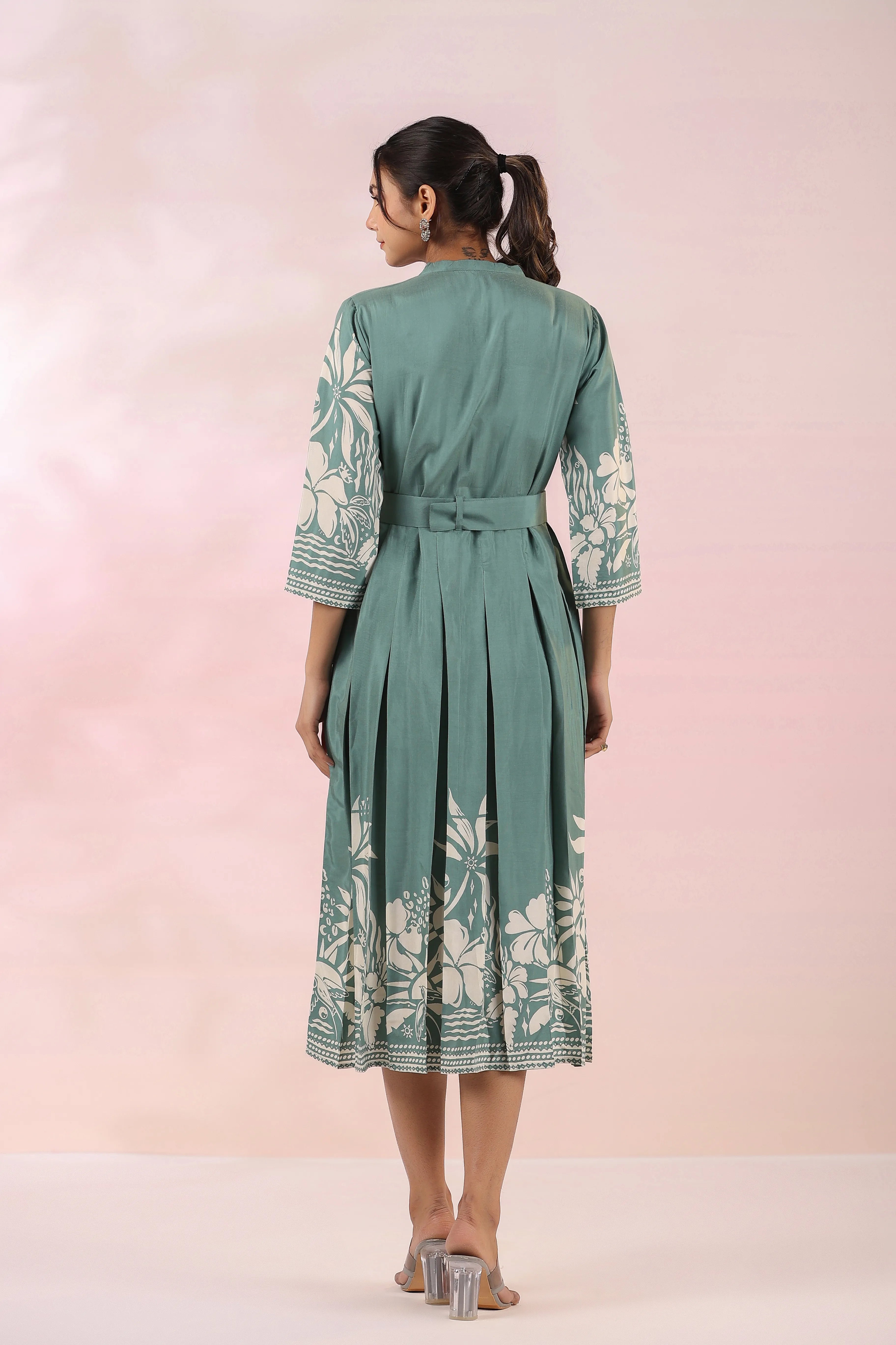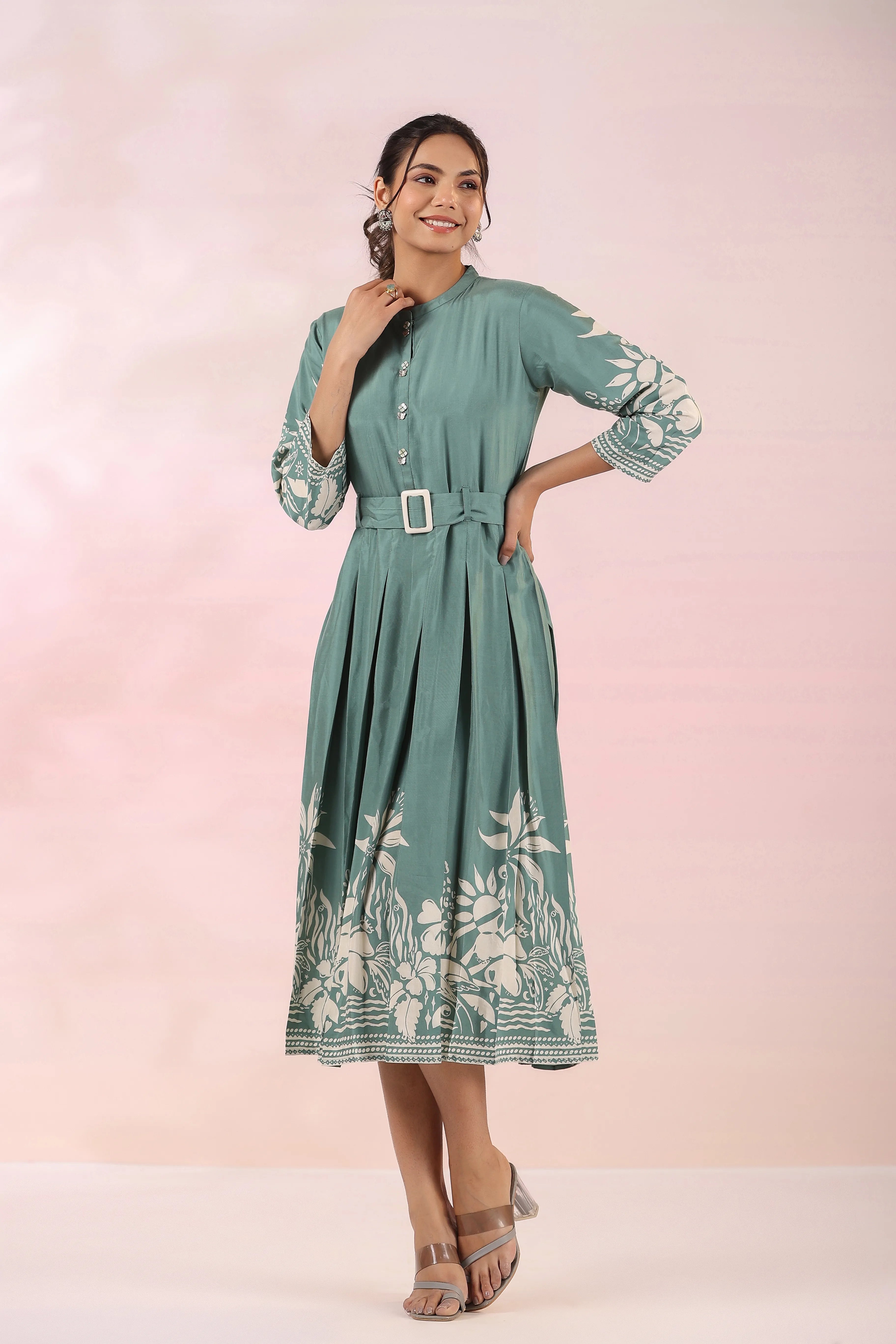 Aqua Green Russian Silk Floral Print Mini Dress With Belt