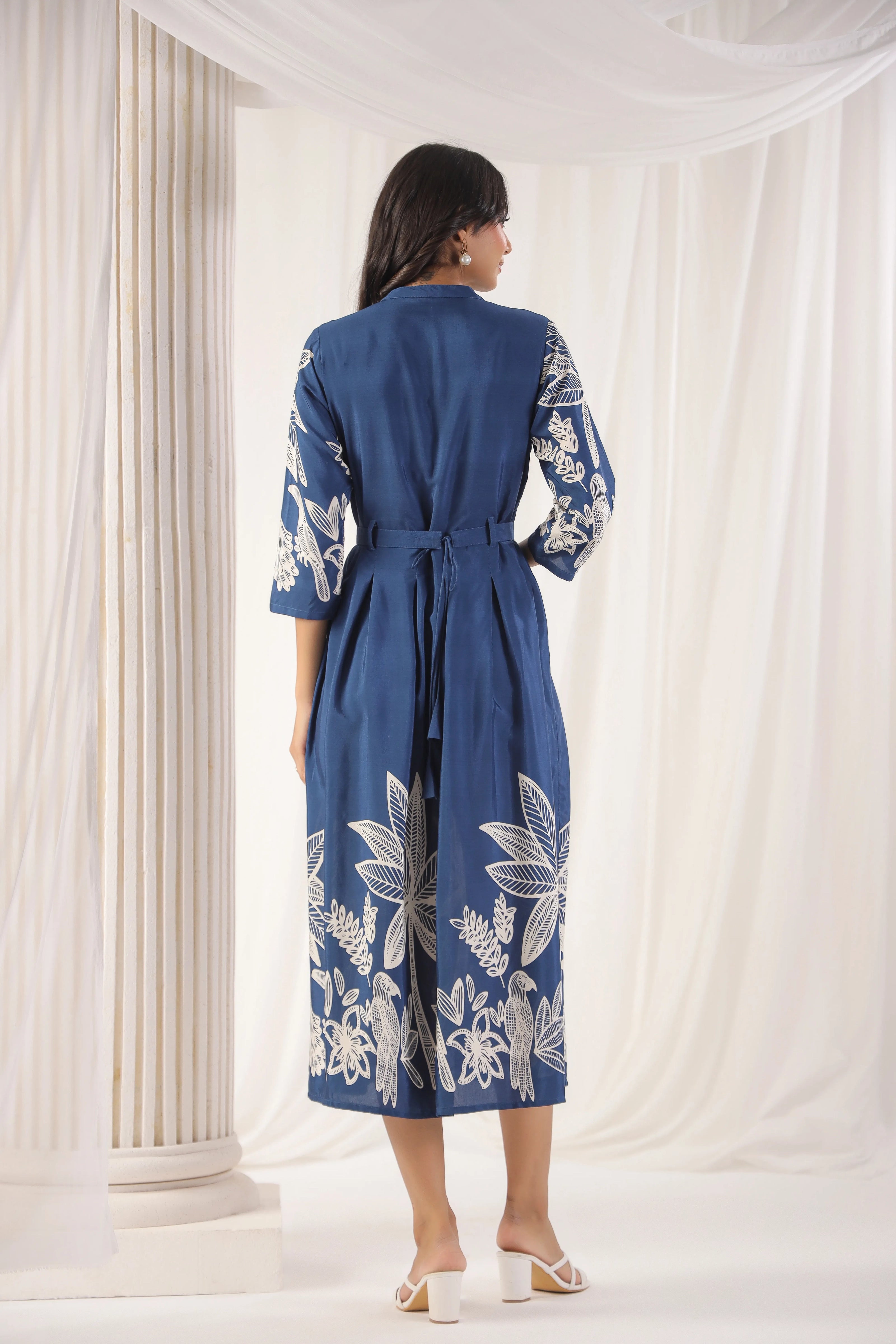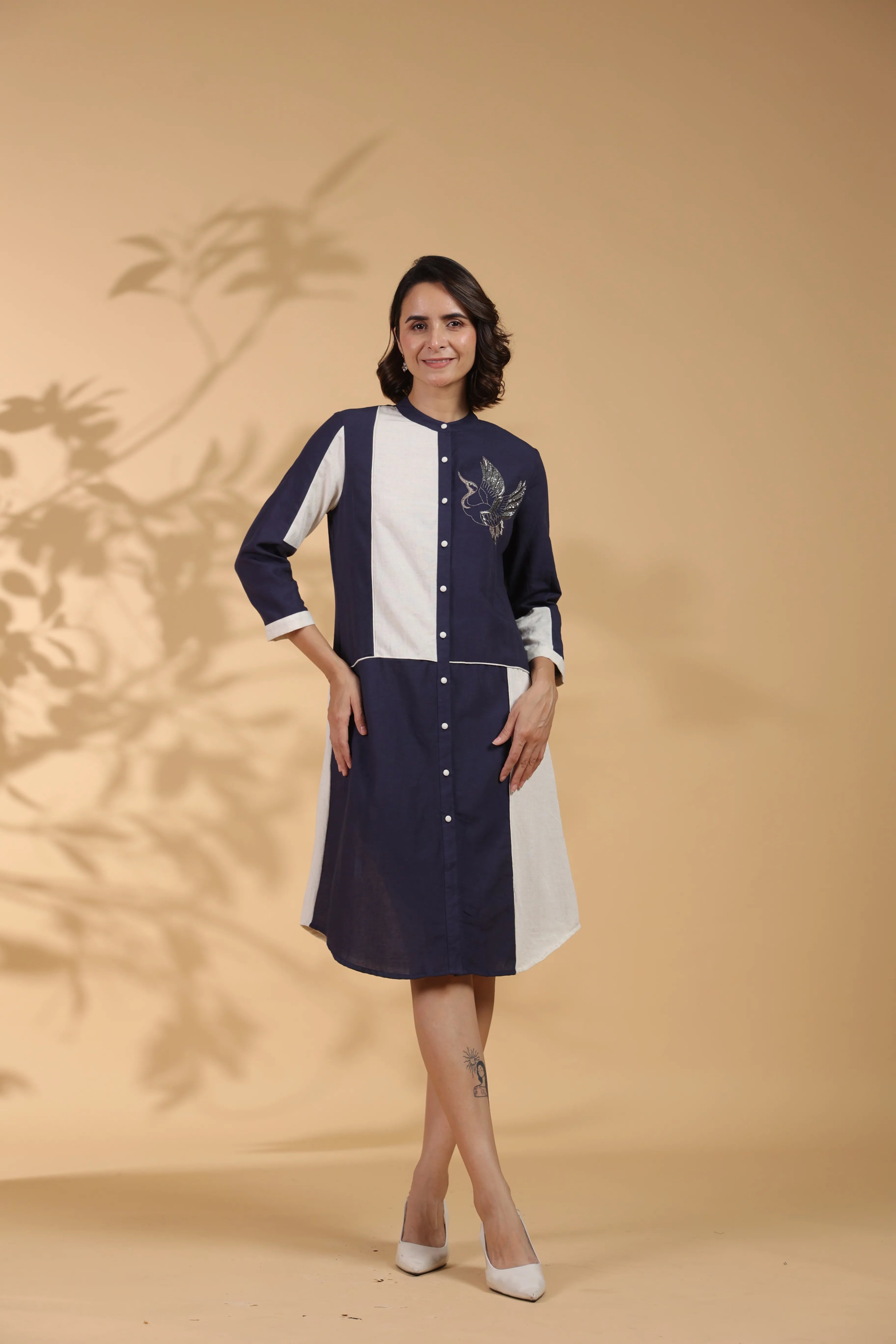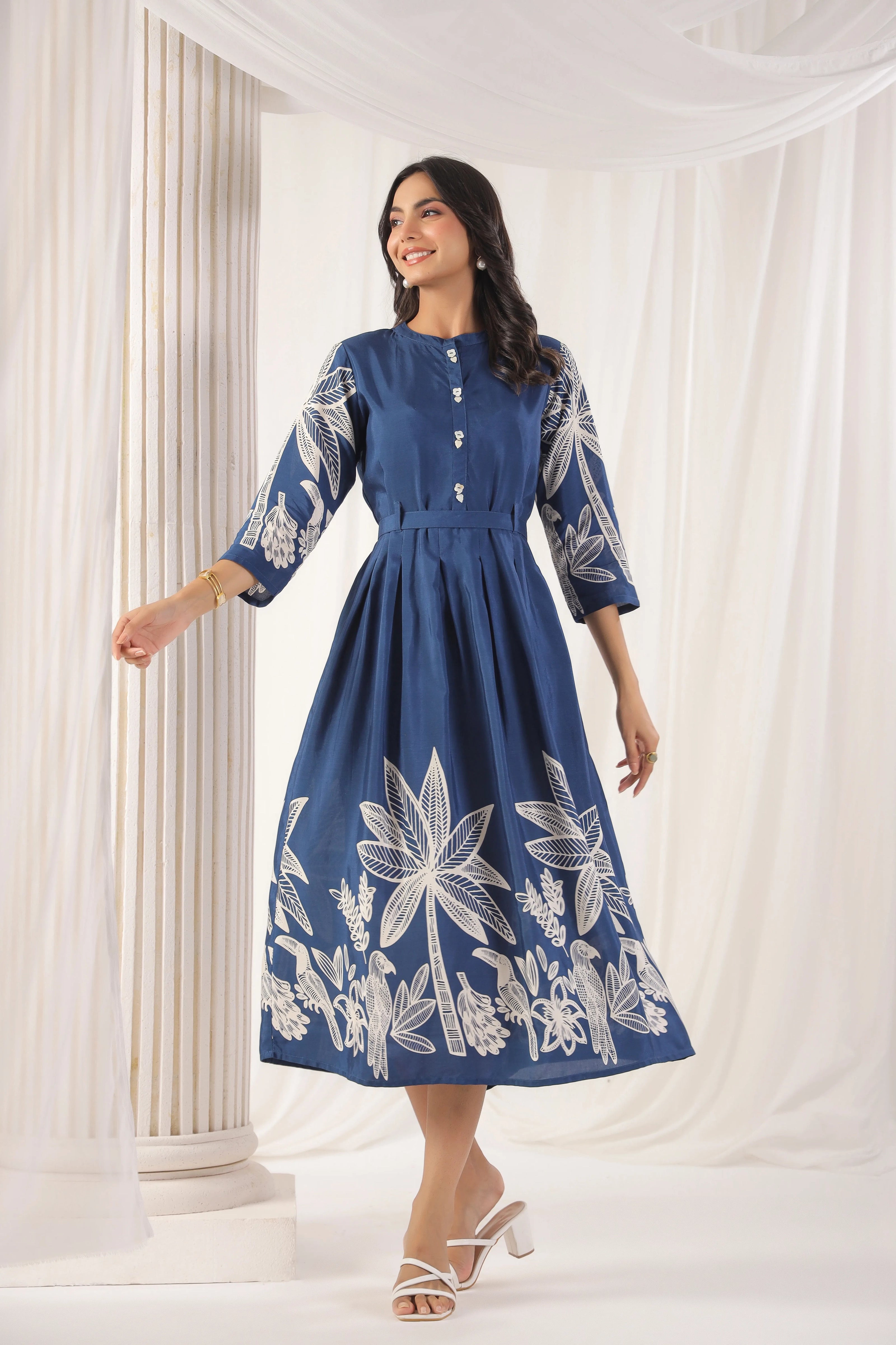 Navy Blue & White Cotton Bird Motif Embroidered Rayon Dress