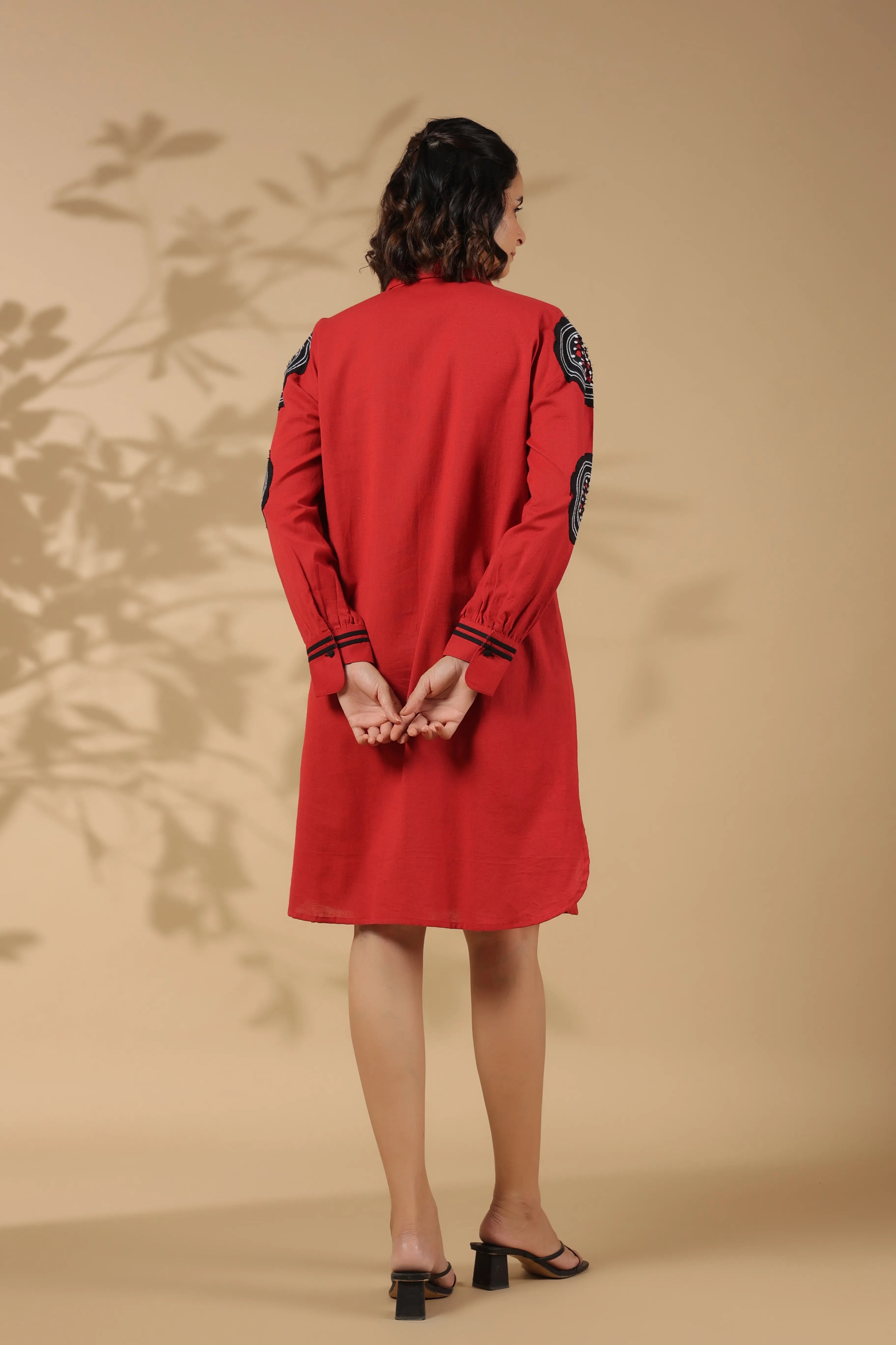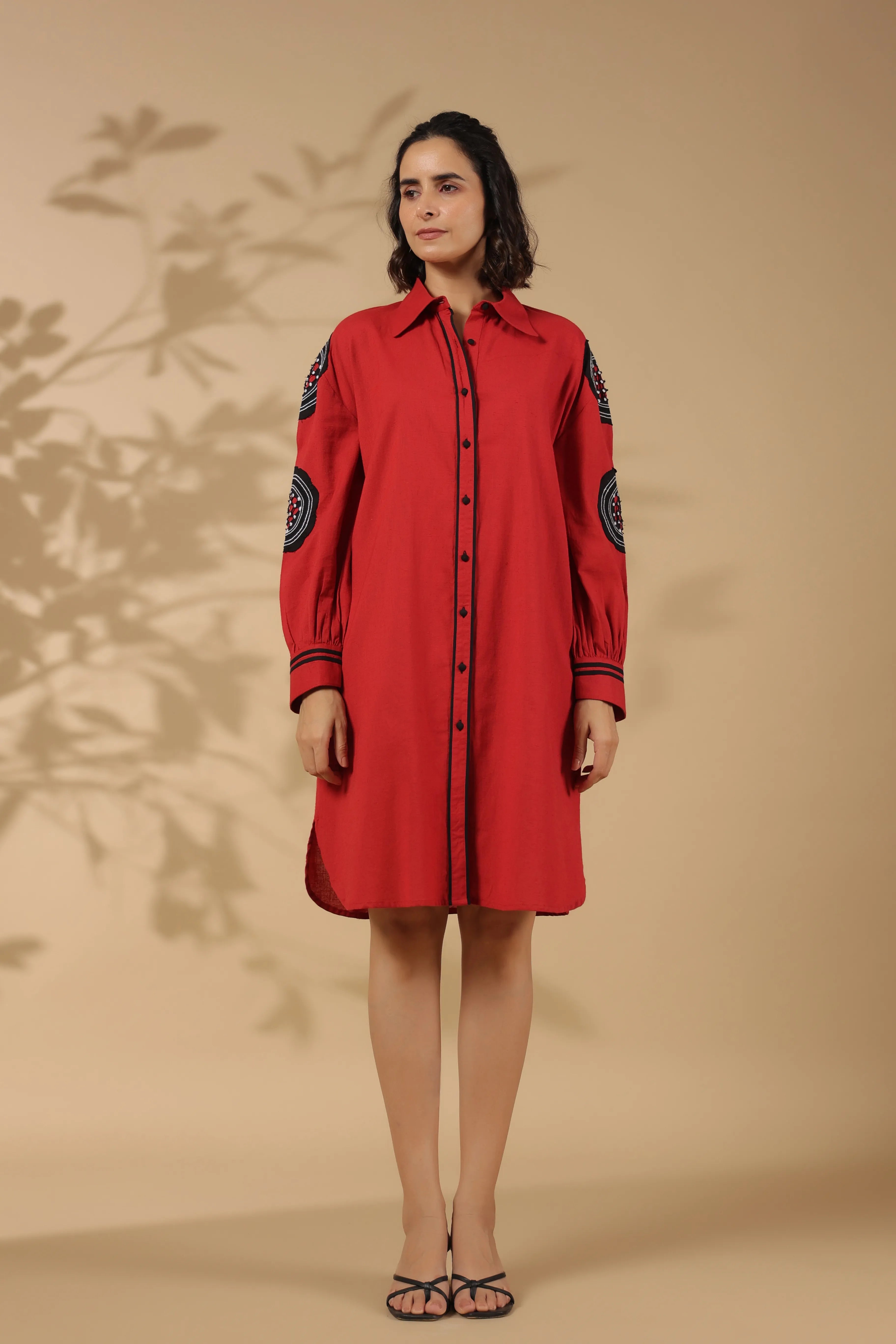 Red Cotton Flex Embroidered Mini Shirt Dress