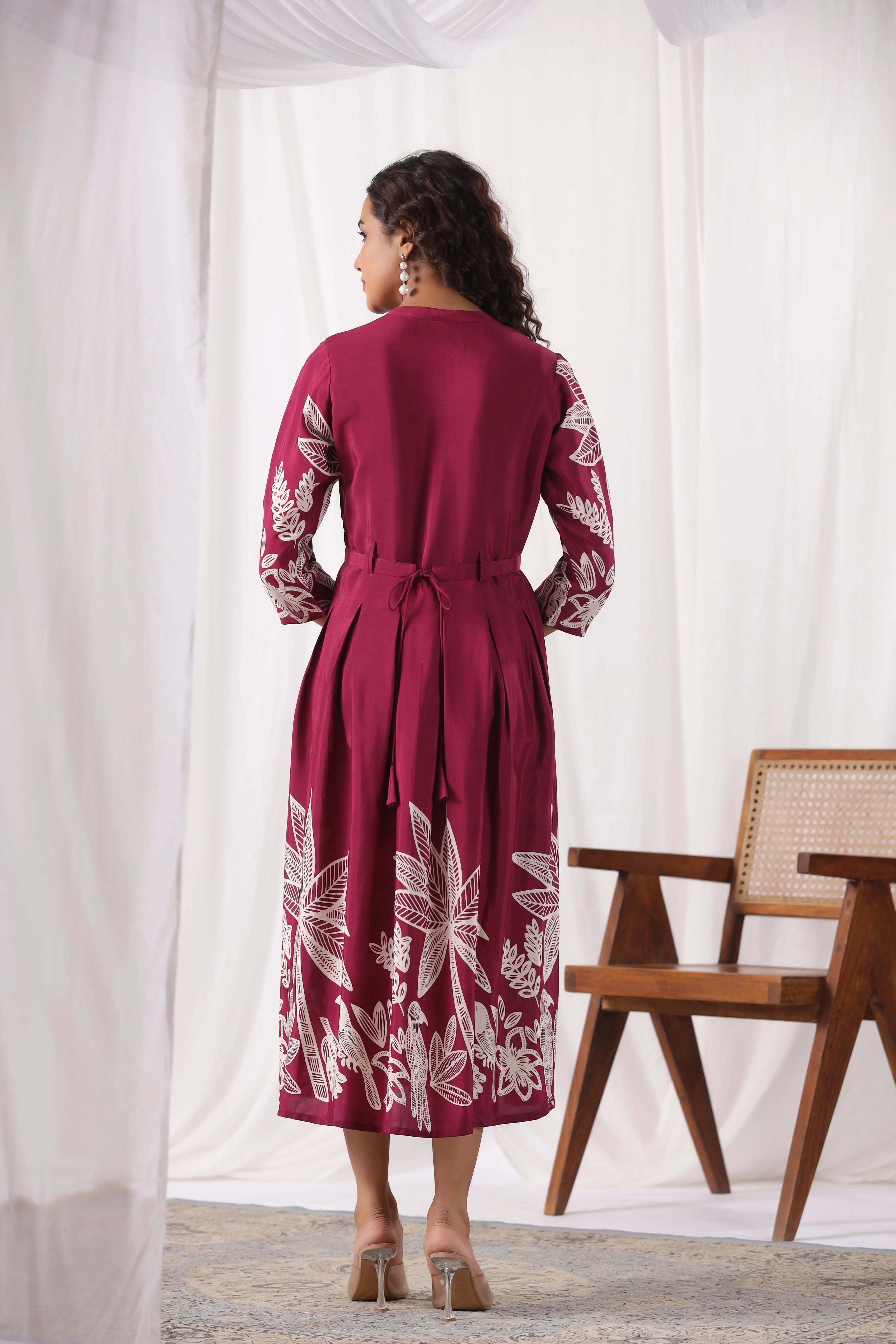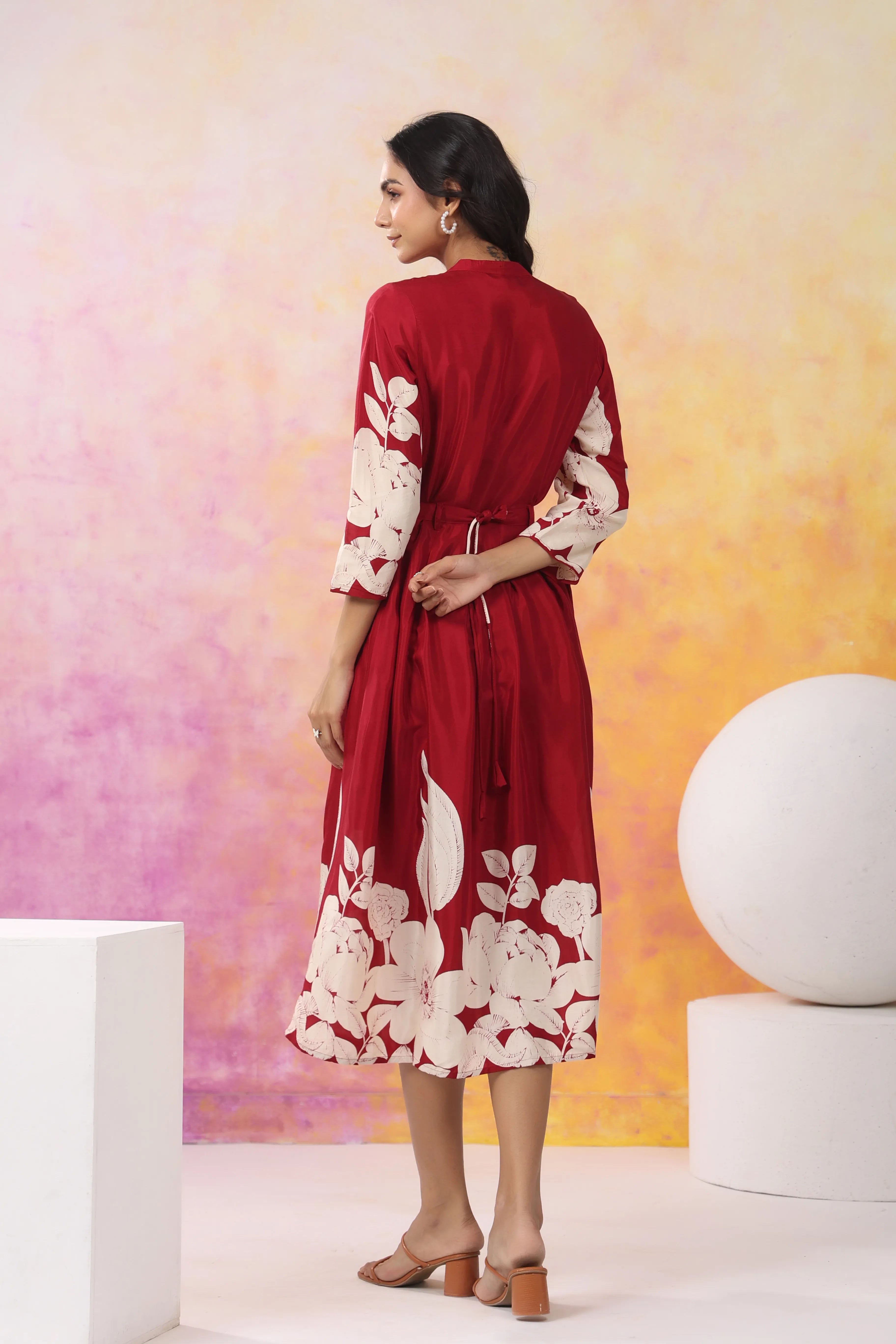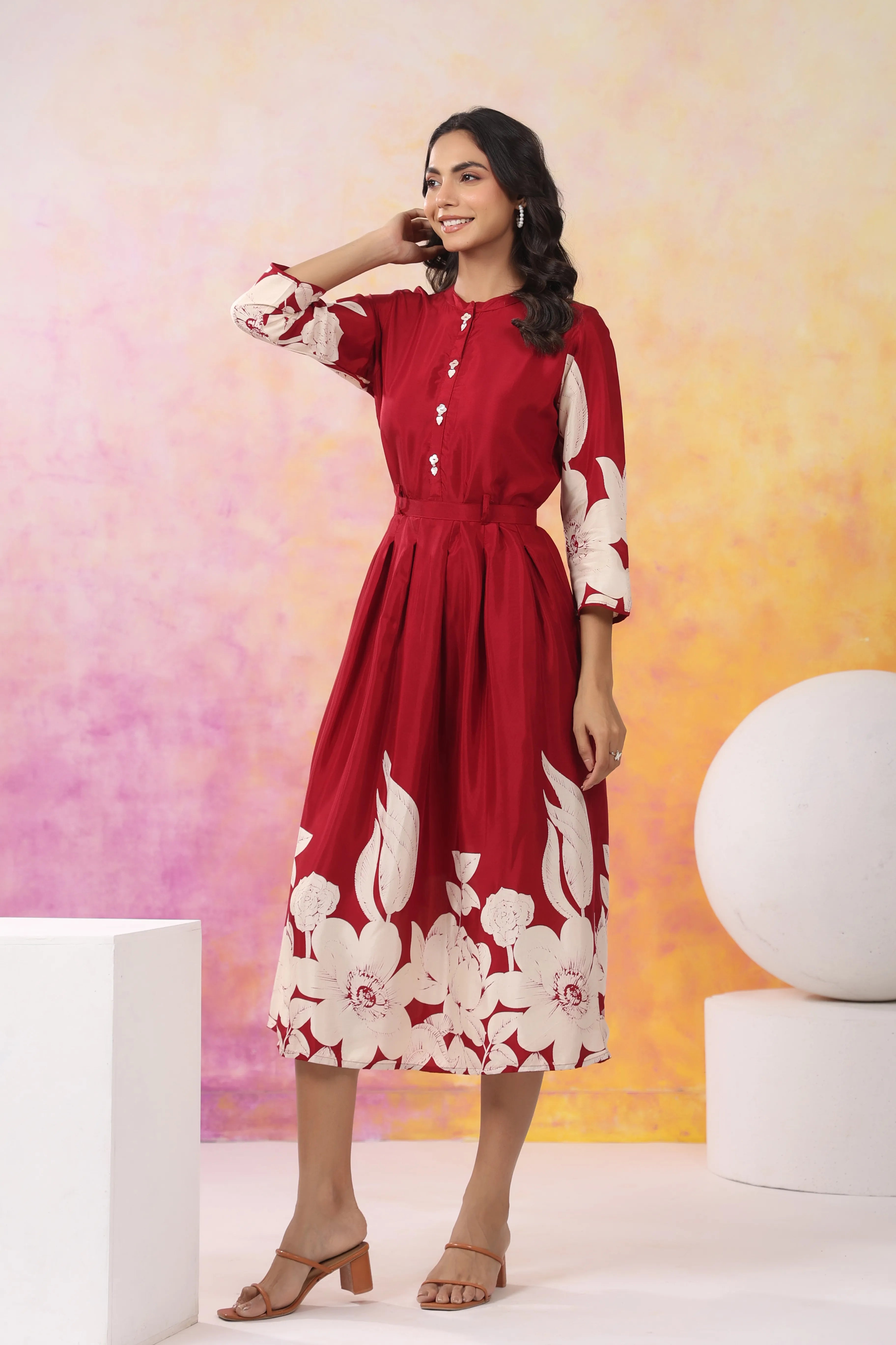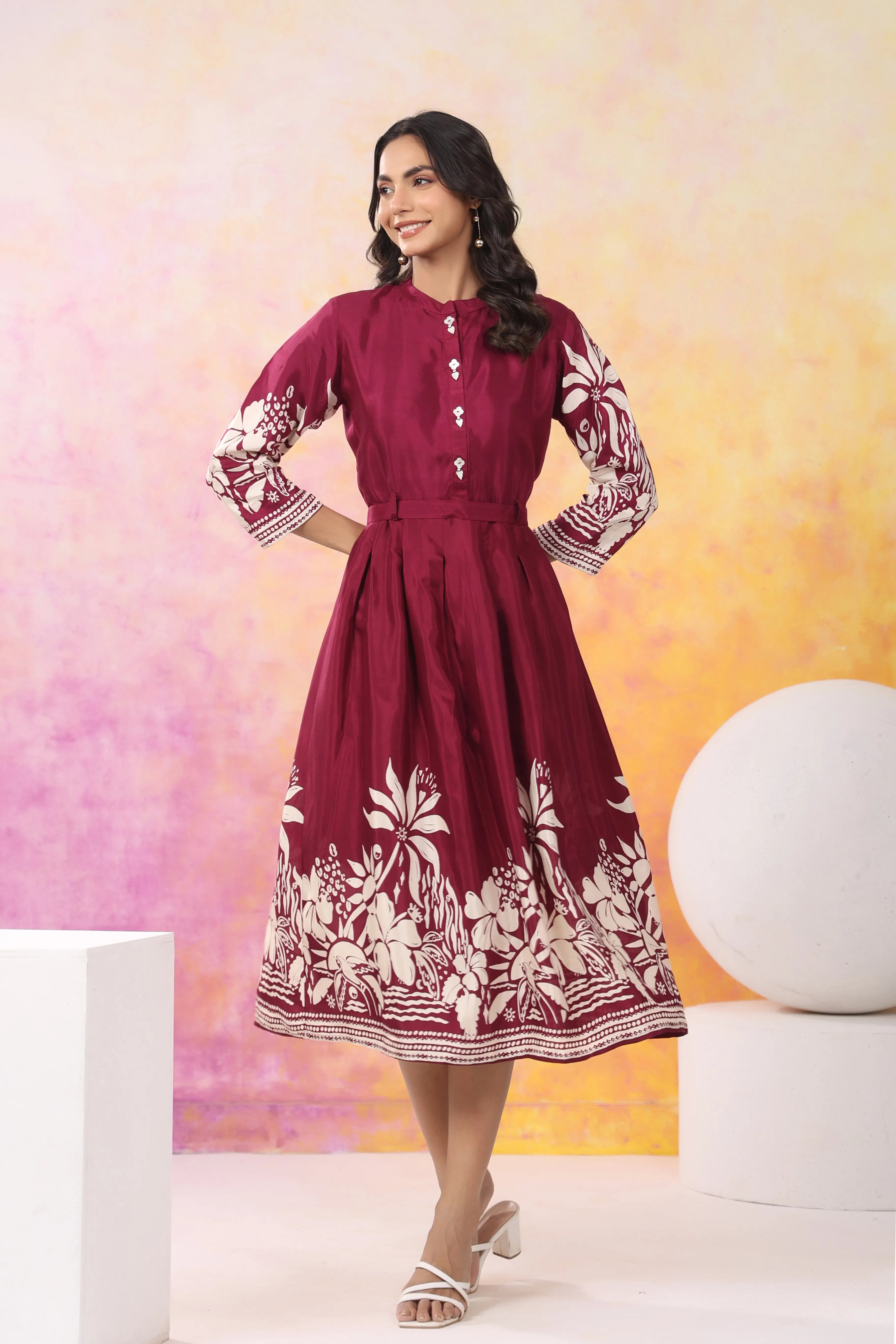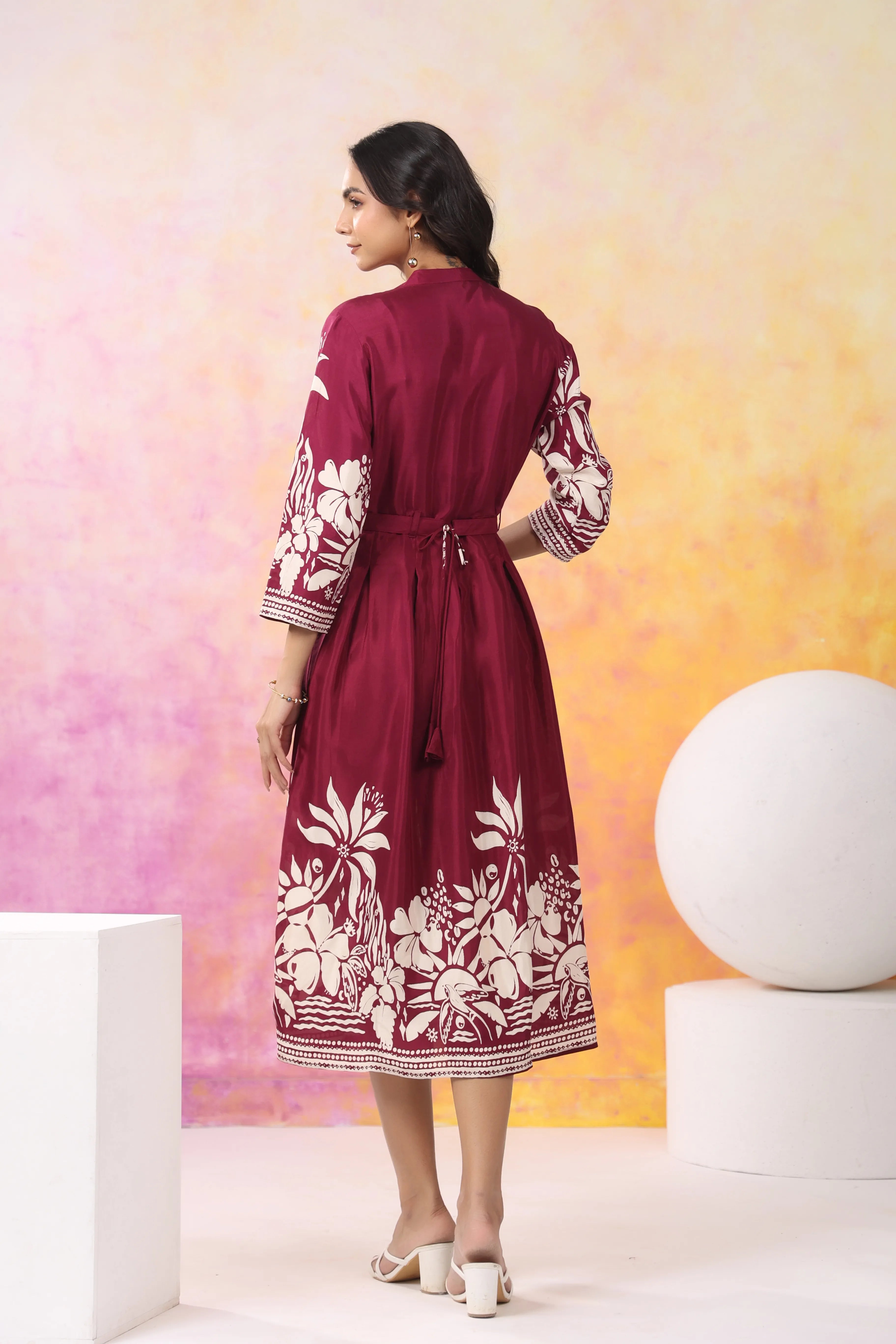 Maroon Base With Cream Color Bold Flower Motif Midi Dress