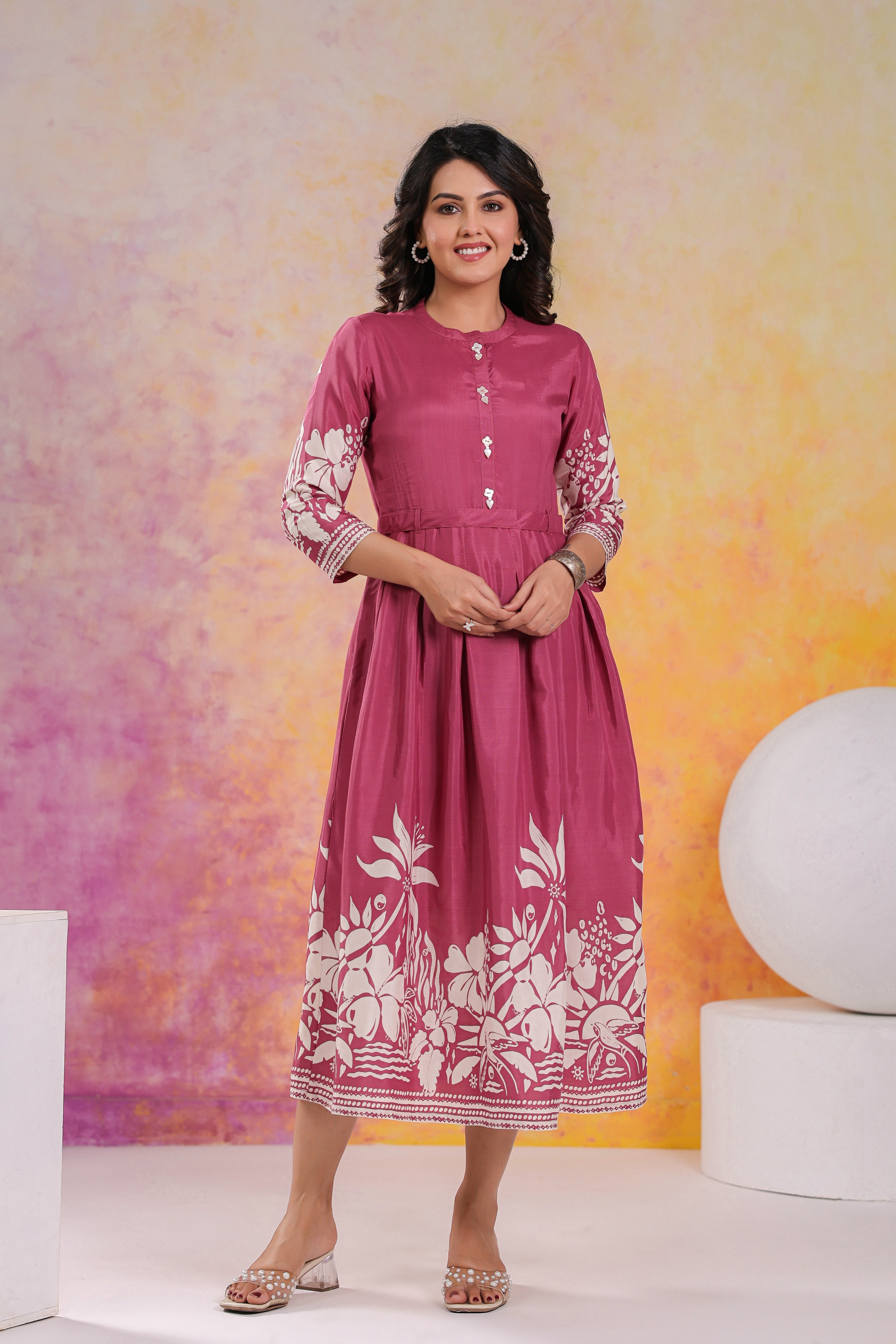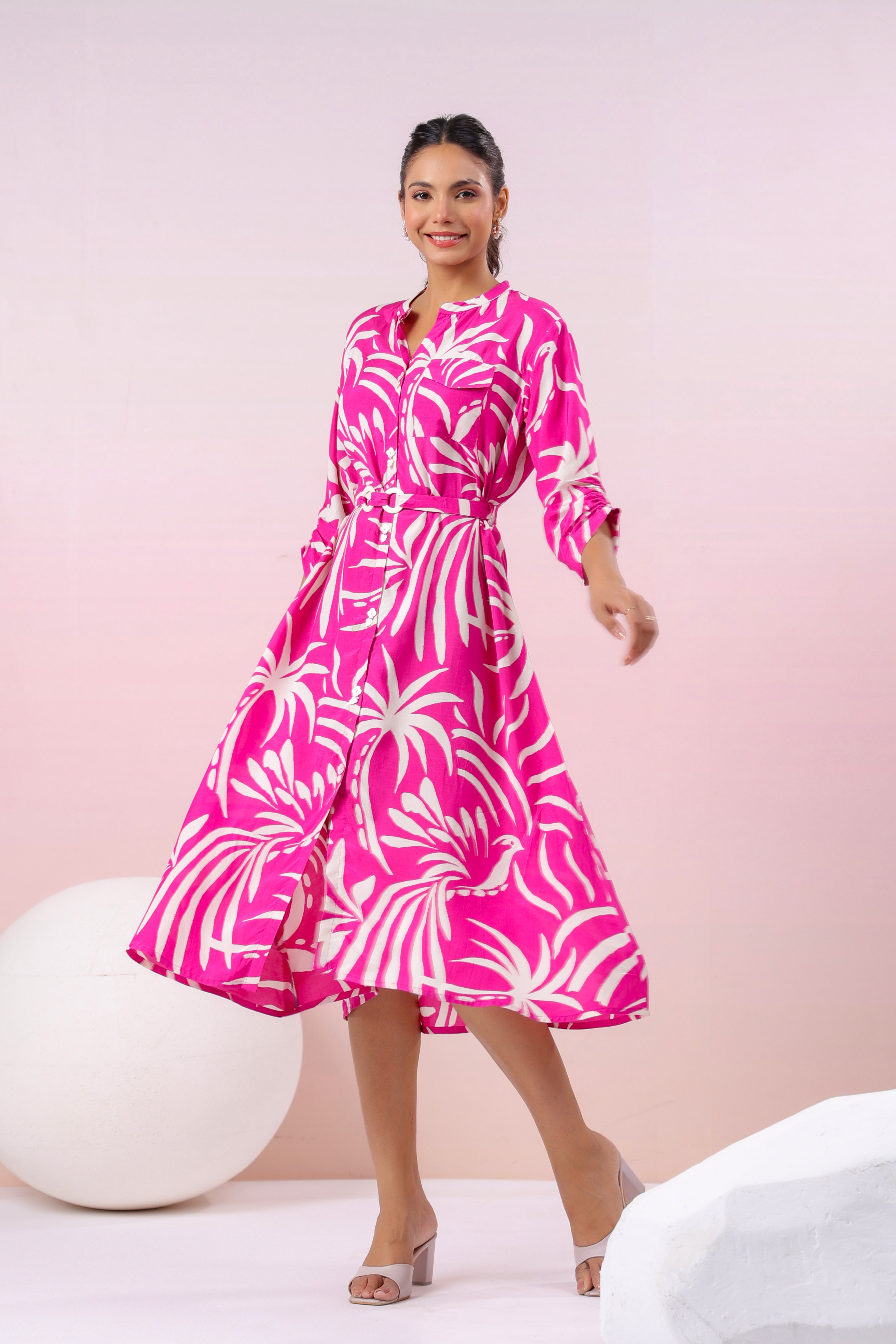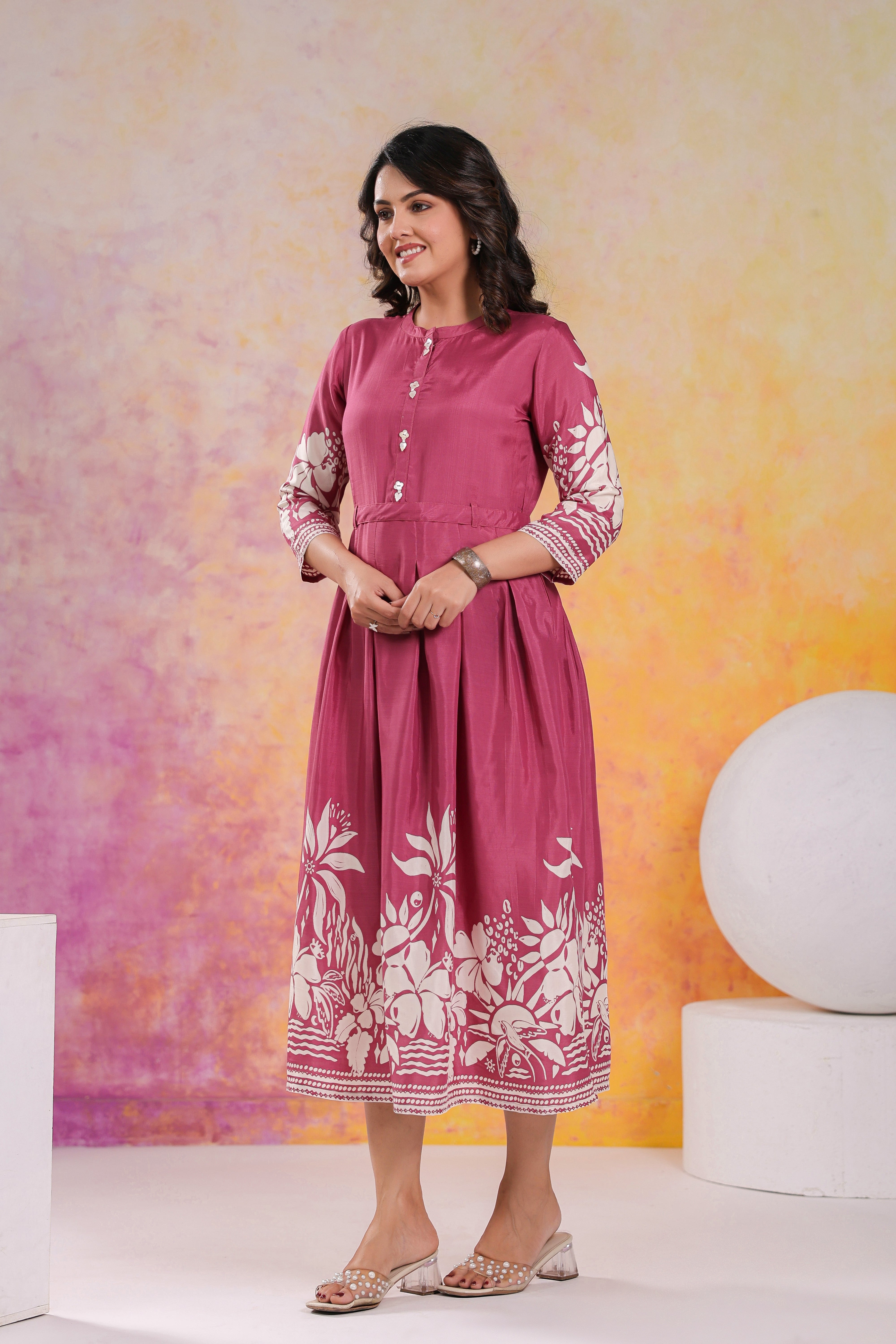 Hot Pink Russian Silk Floral Printed Midi Dress