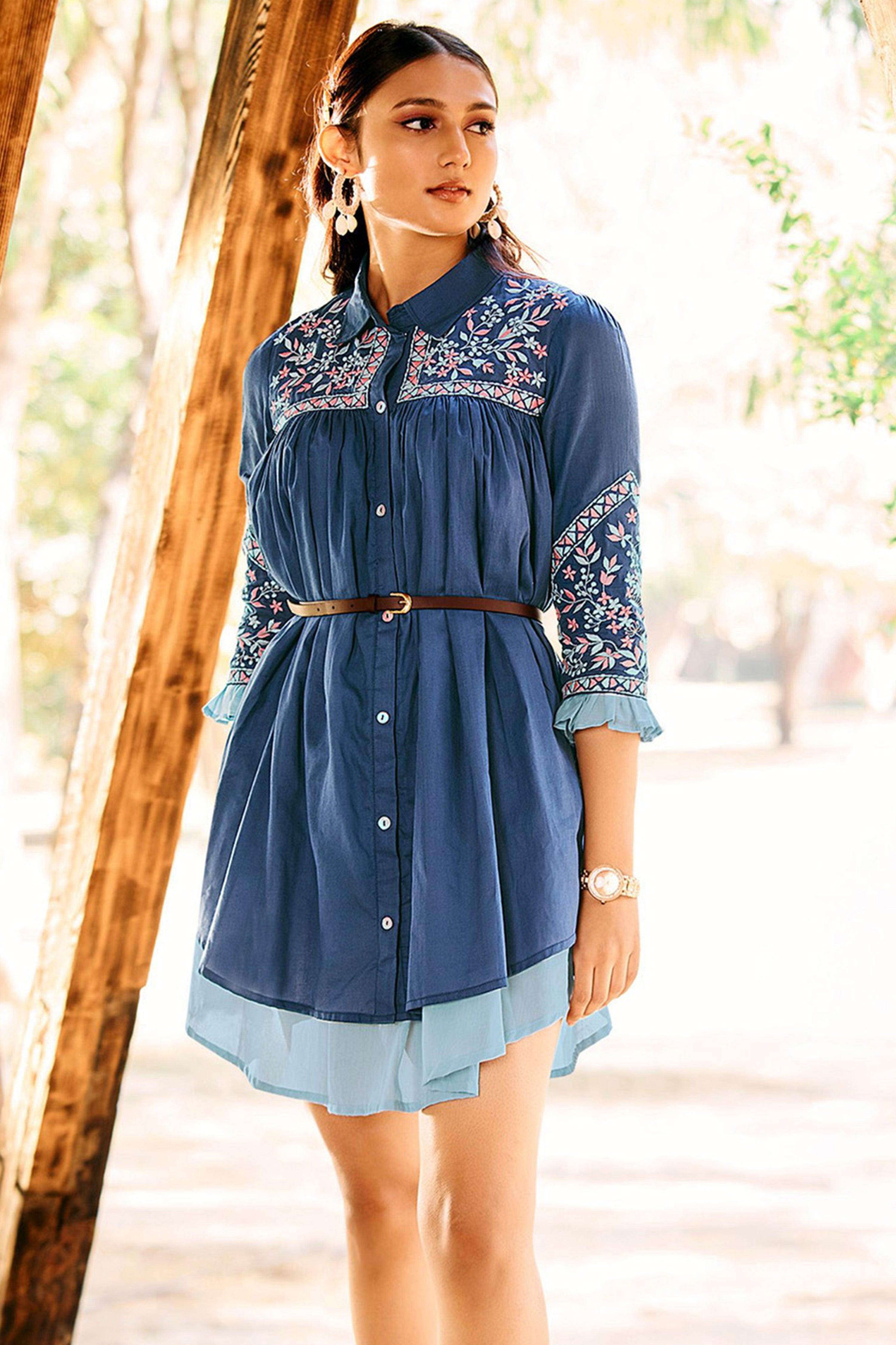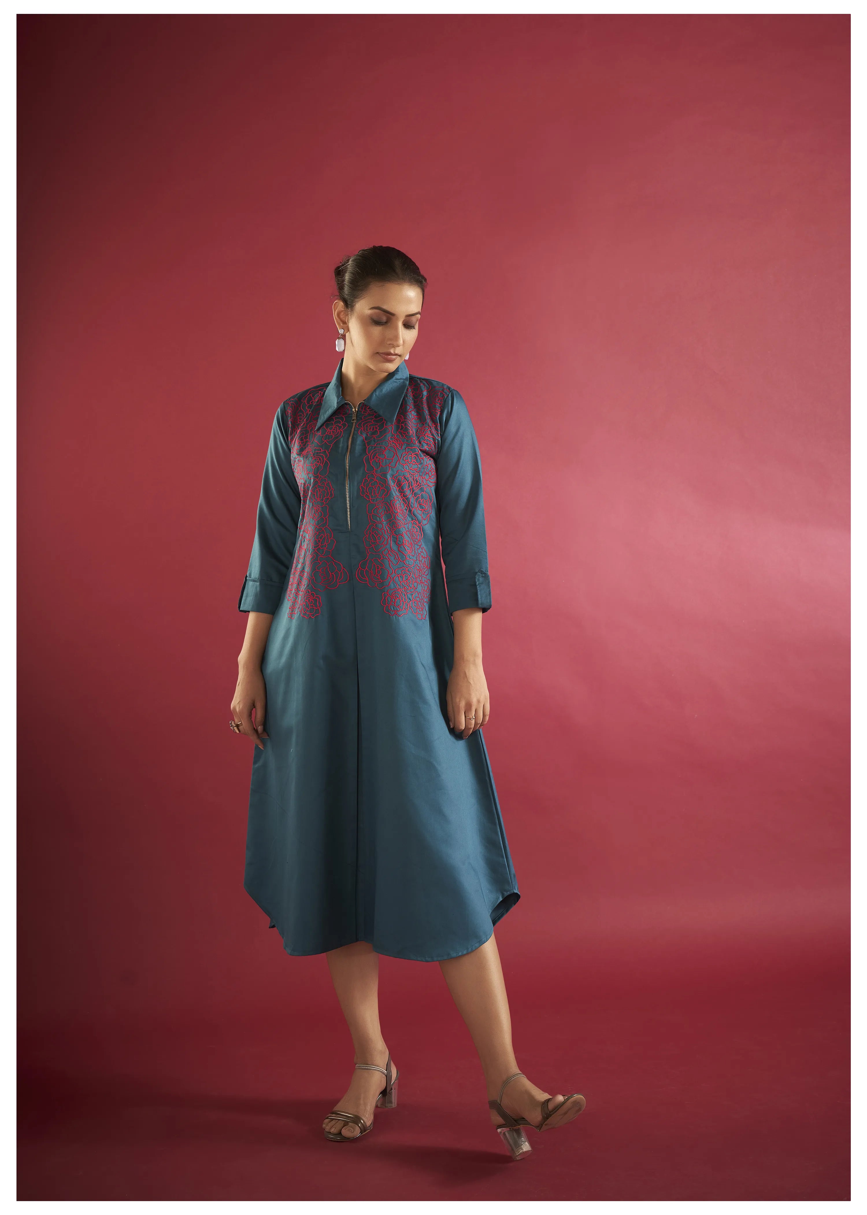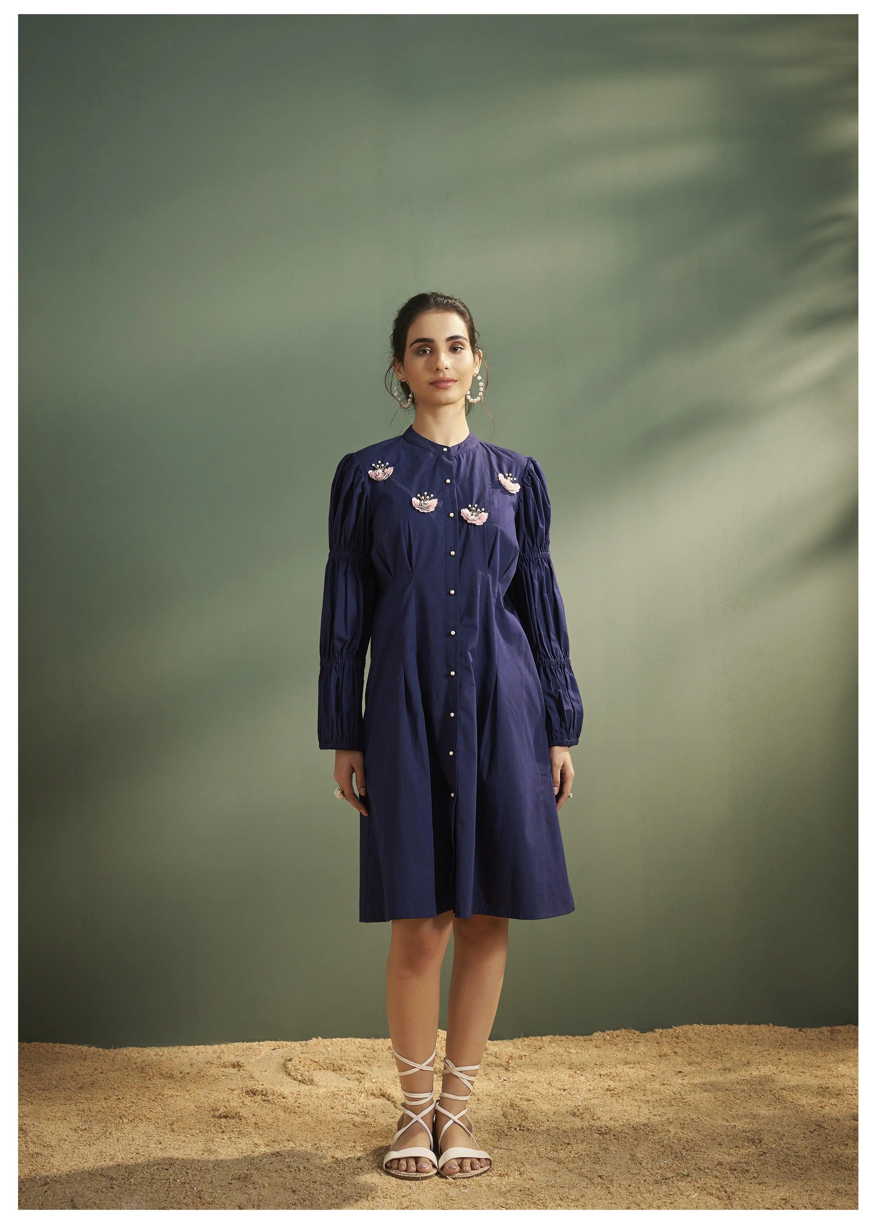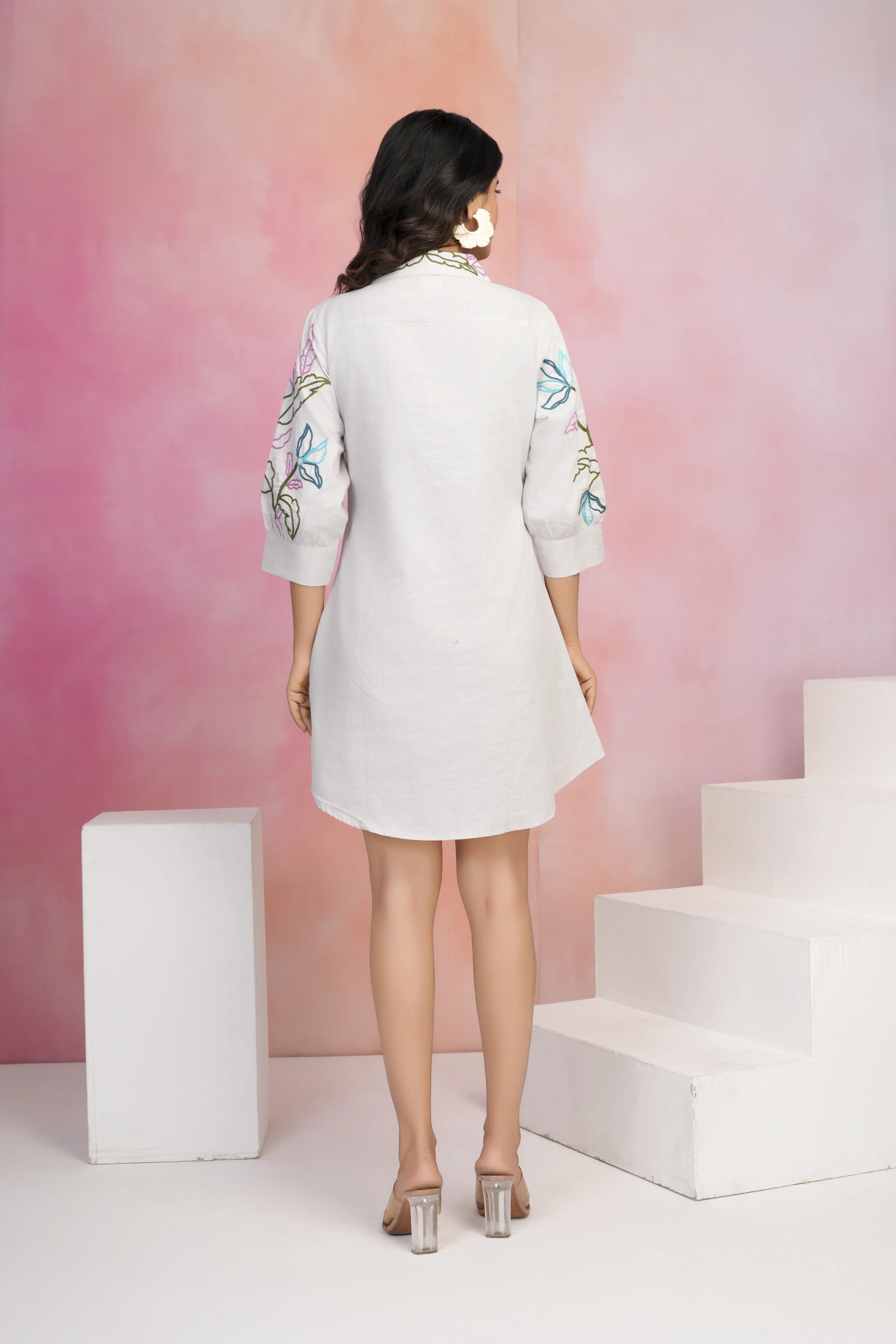 Floral Multi-Thread Embroidered Cotton Shirt Dress