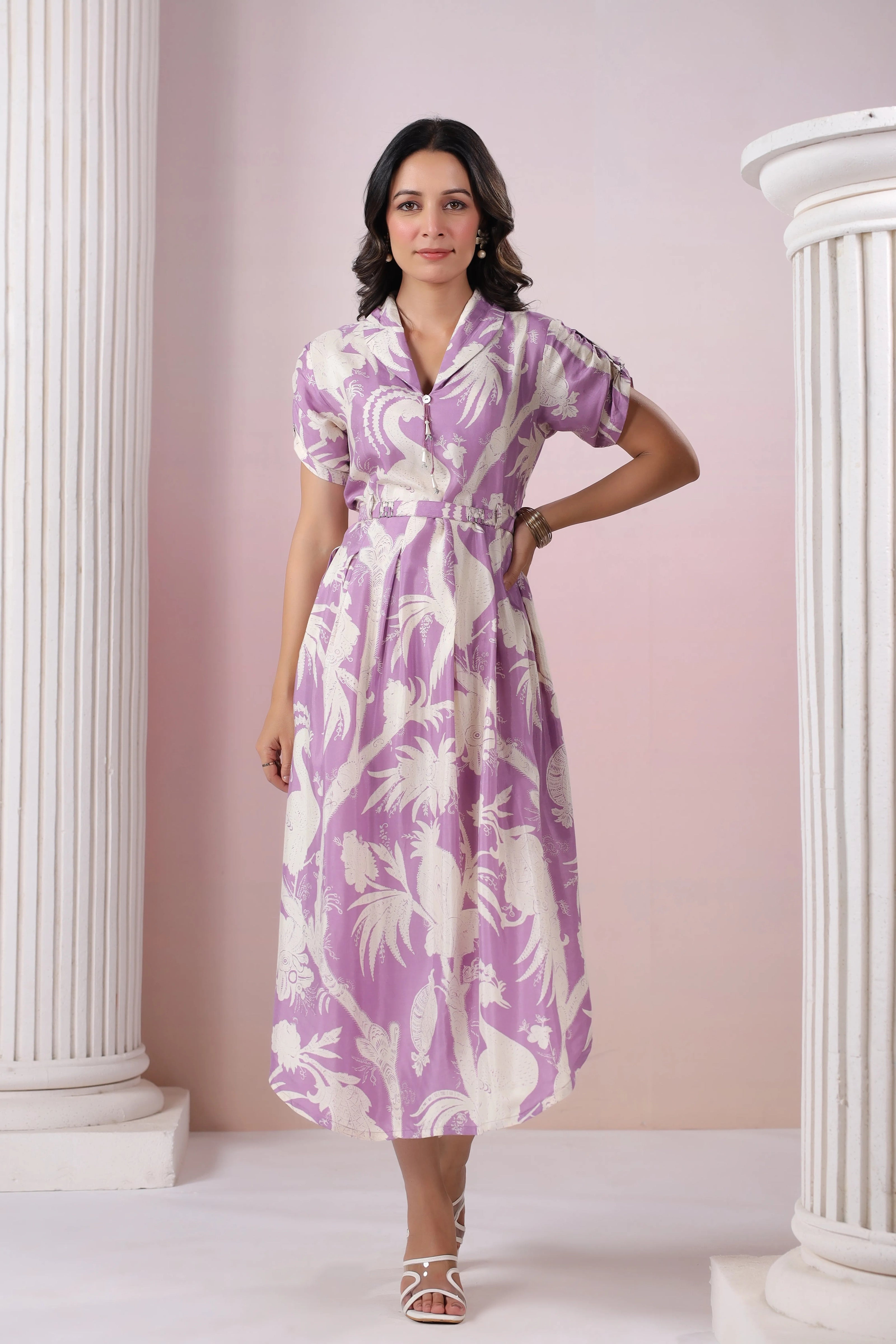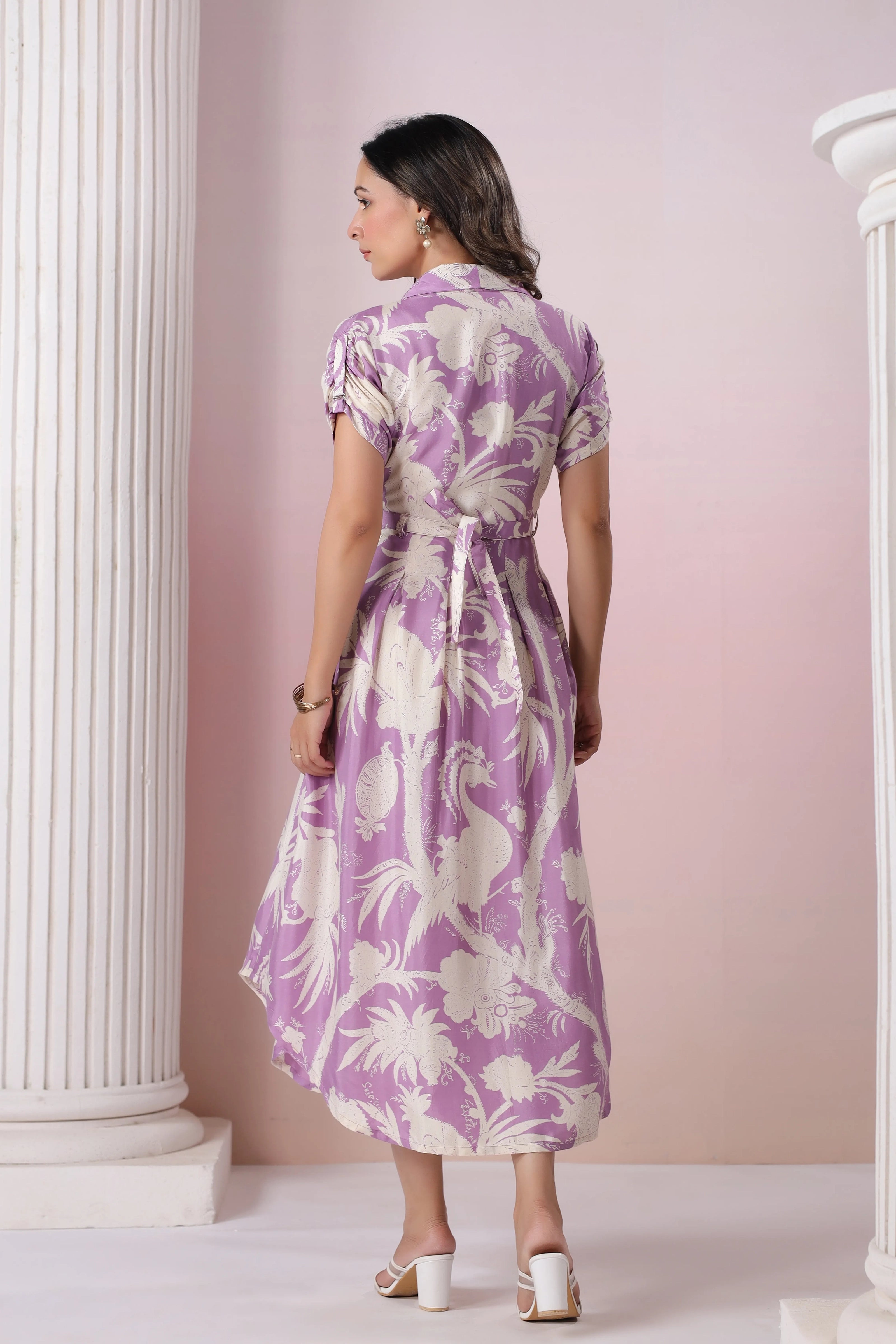 Purple Russian Silk Floral Print Mini Dress With Belt