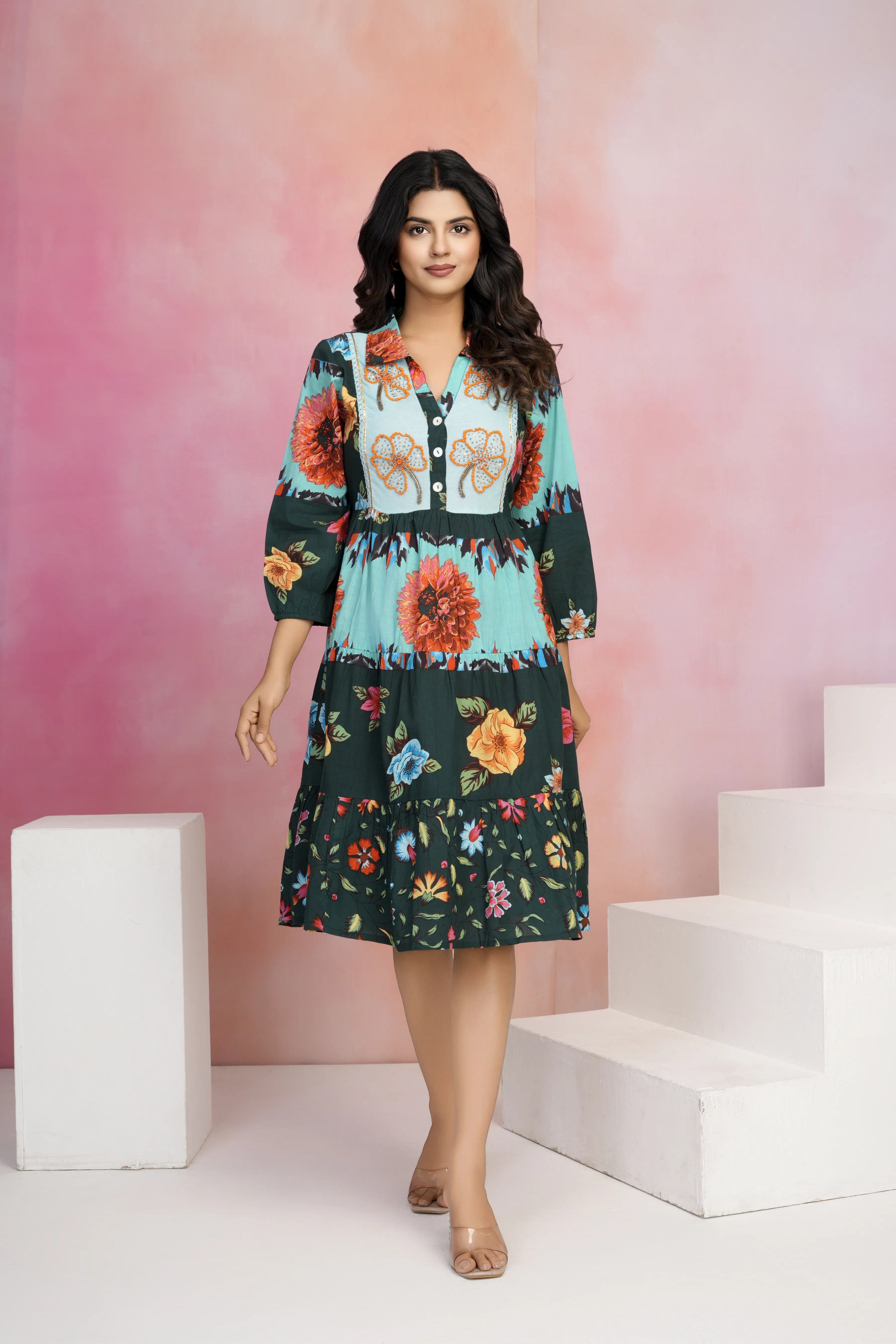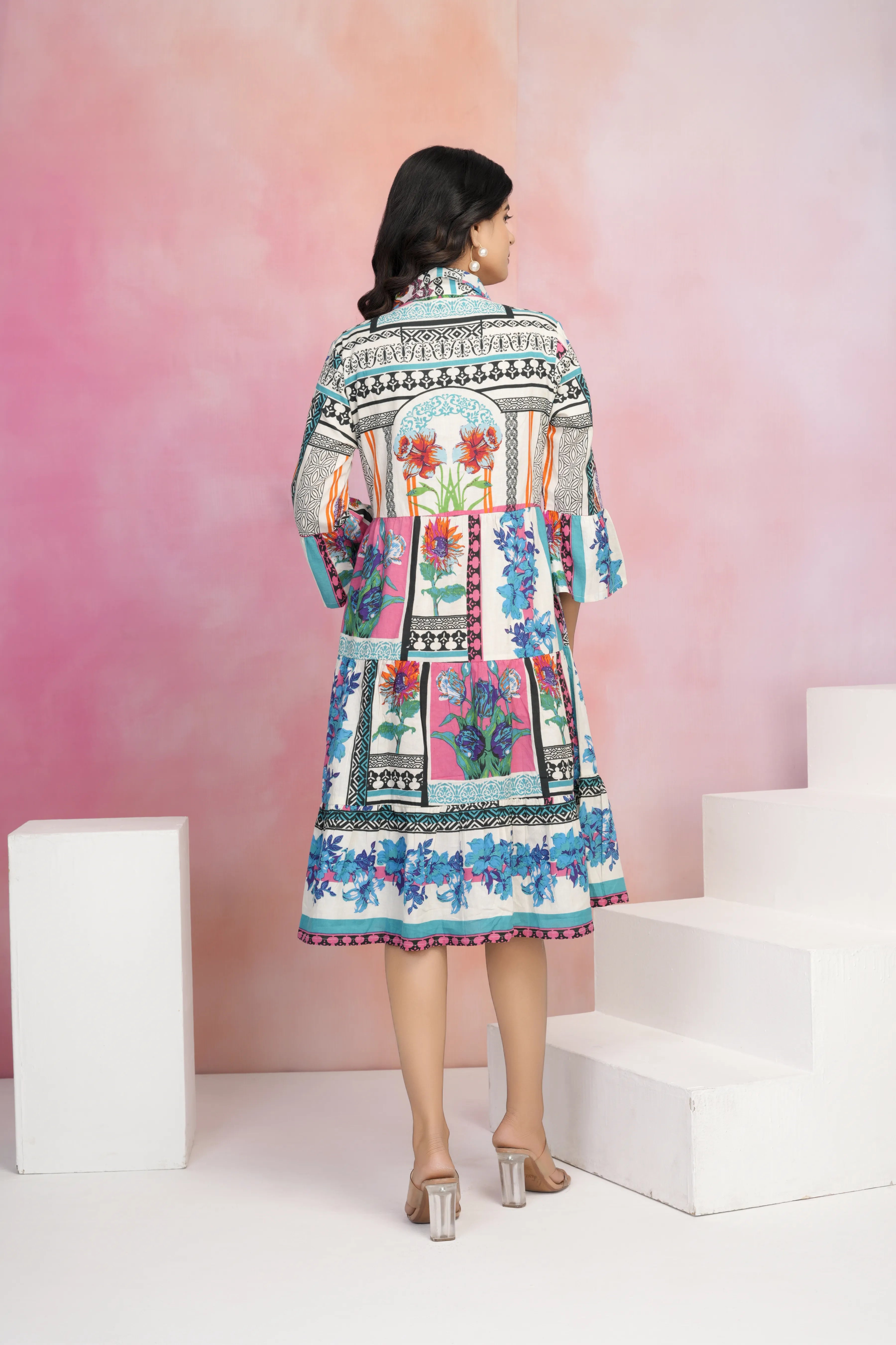 Multicolor Embroidered Printed Lace detailed Cotton Midi Dress