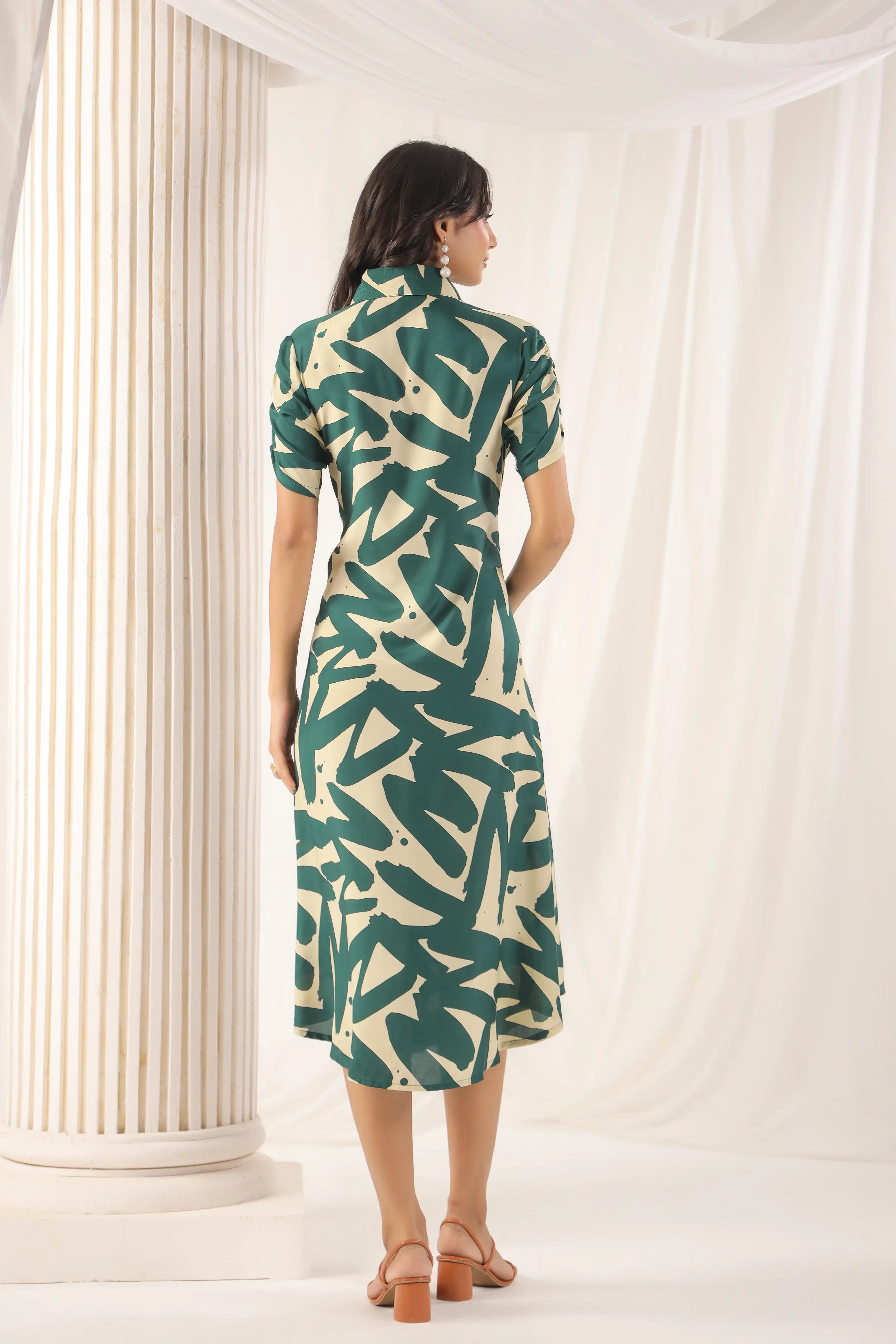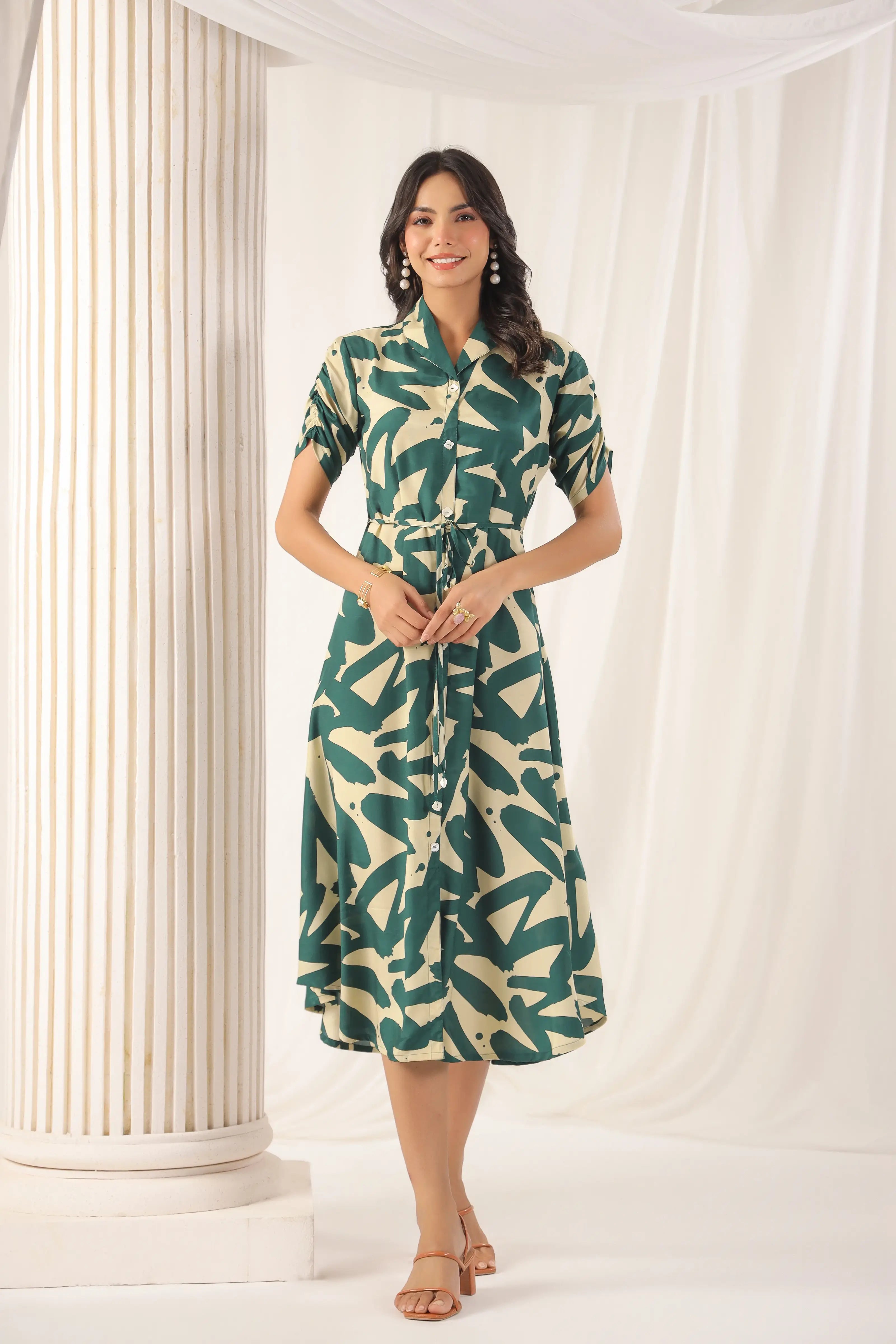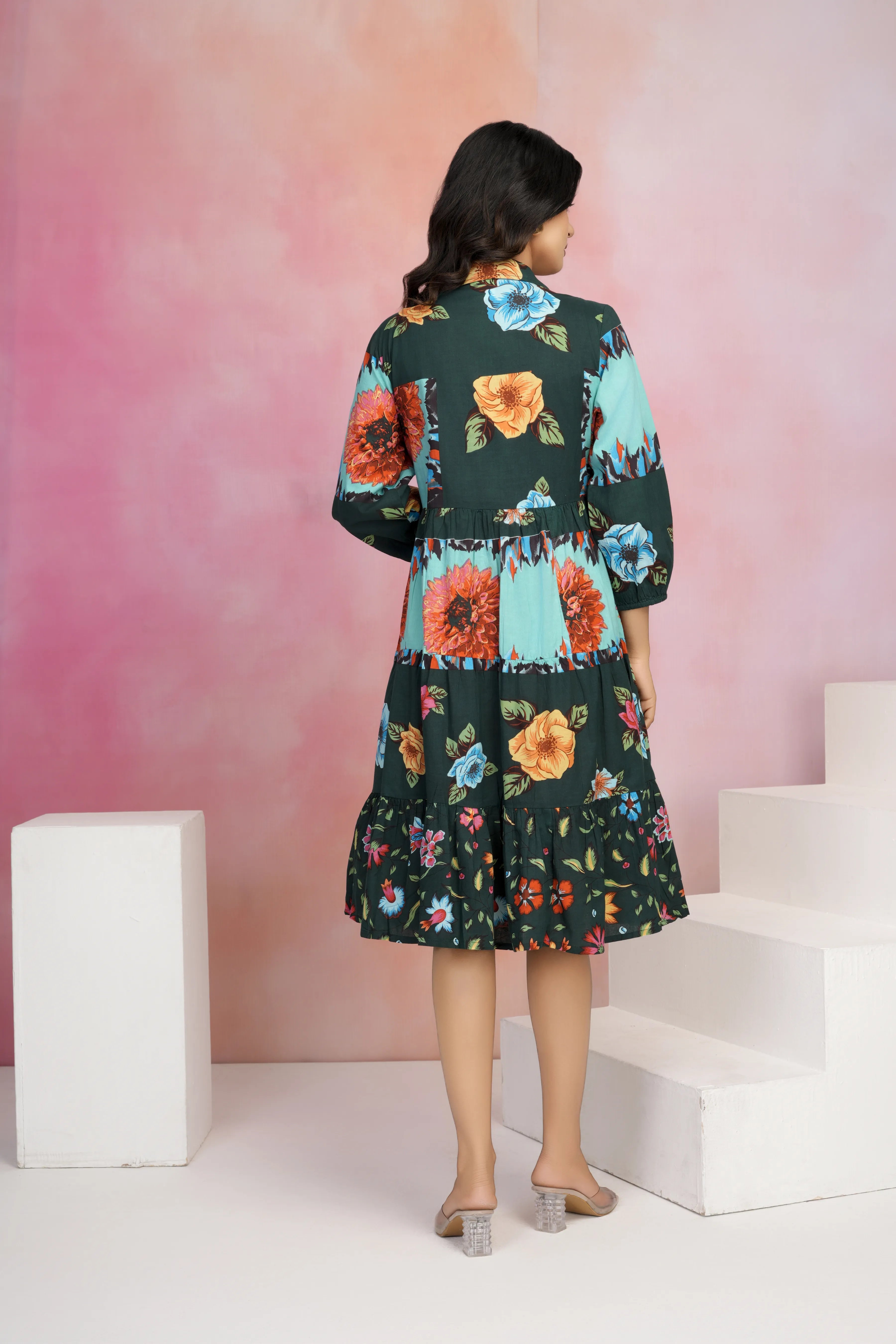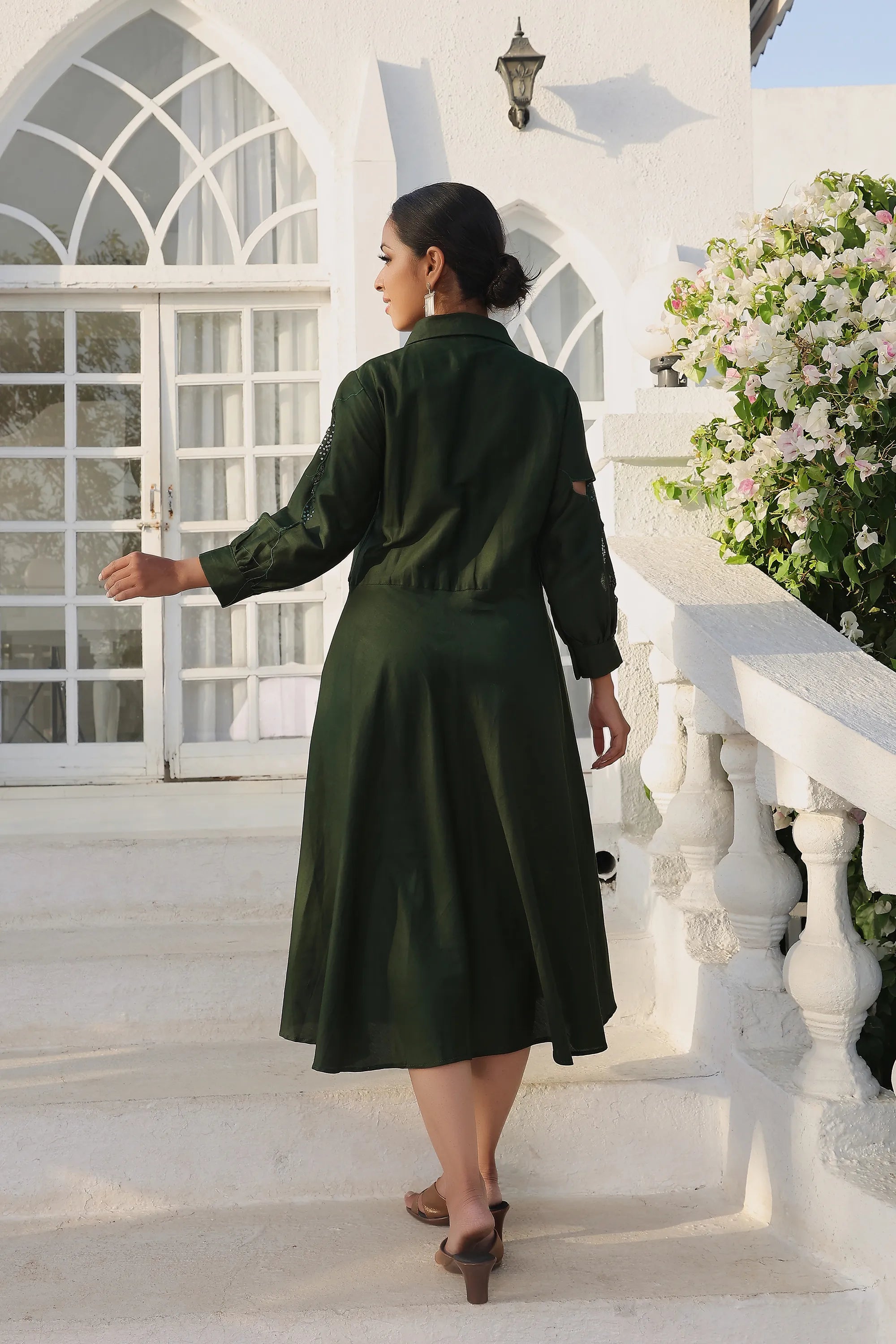 Dark Green Abstract Floral sequence work Lace Button-Front Cotton Dress