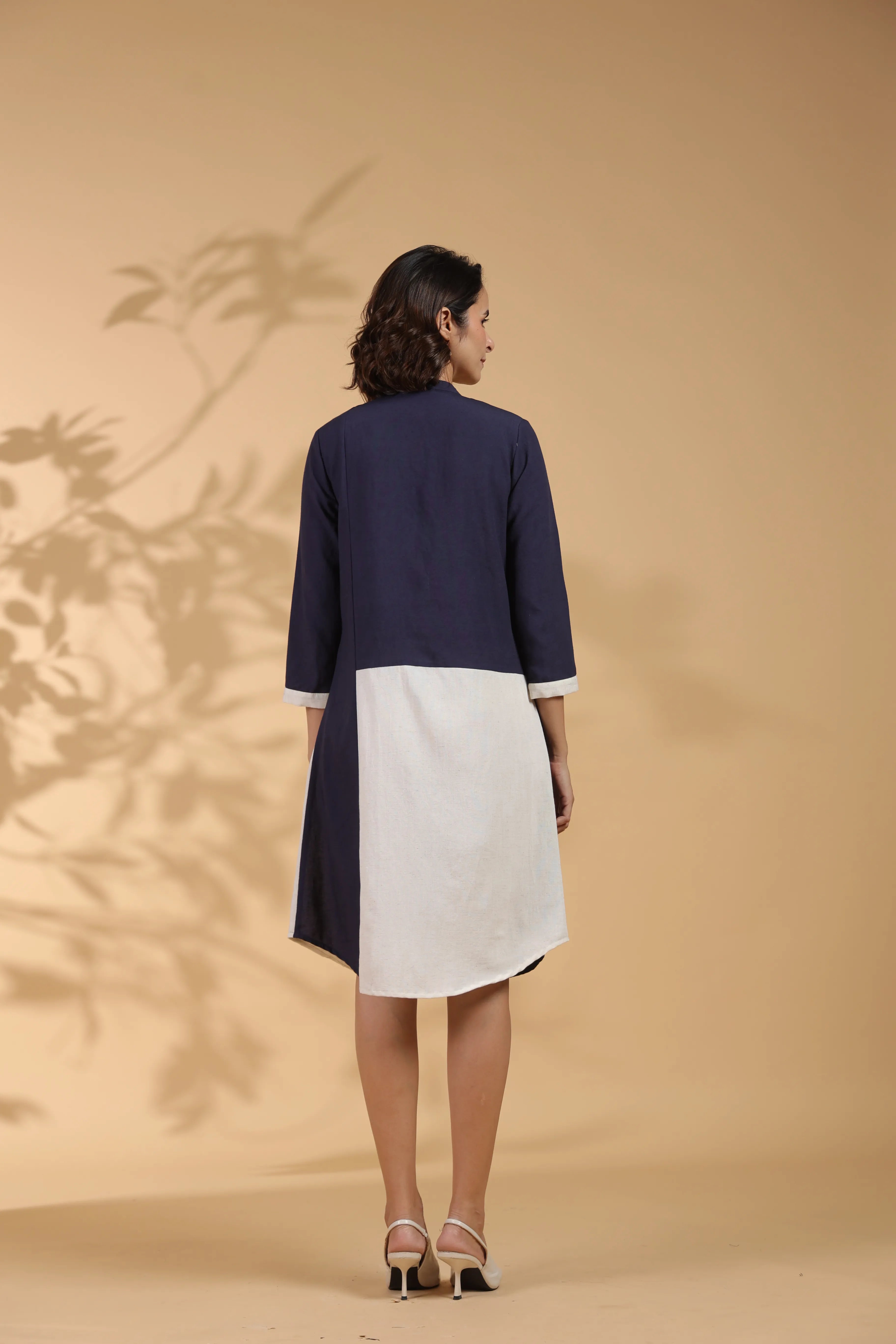 Denim Blue & White Lace Detail Shawl Collar Short Dress