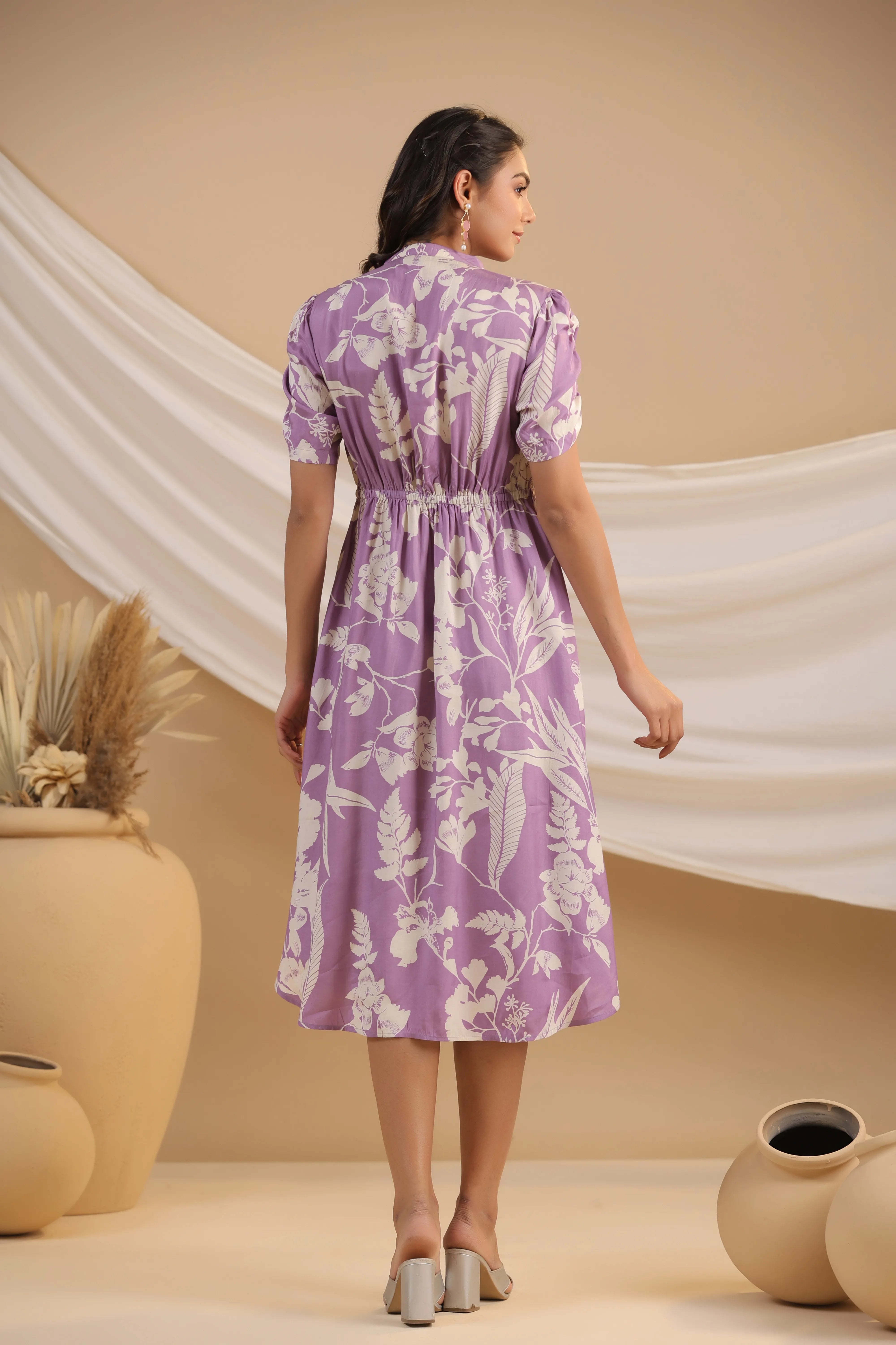 Purple Base With Cream Color Bold Flower Motif Midi Dress
