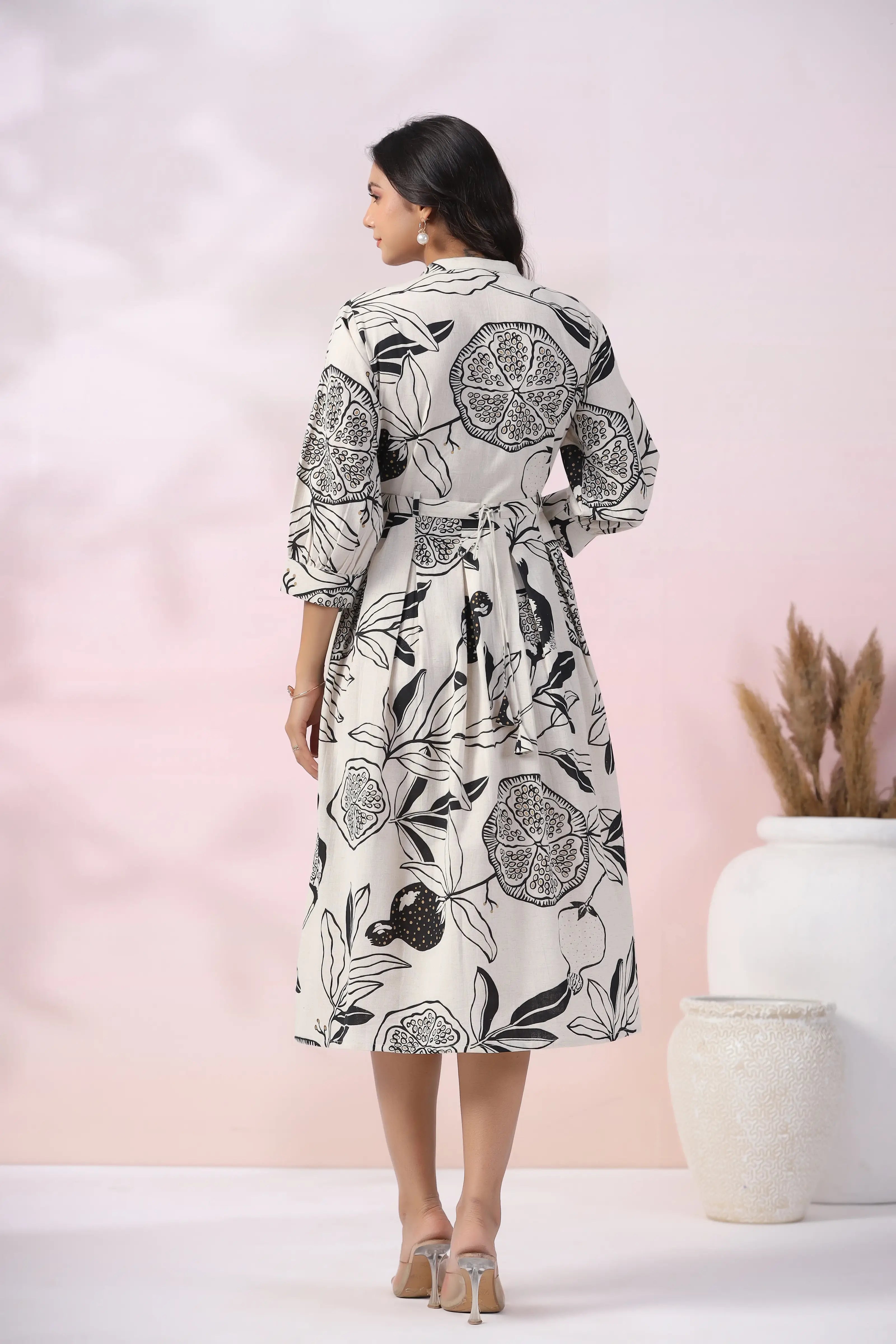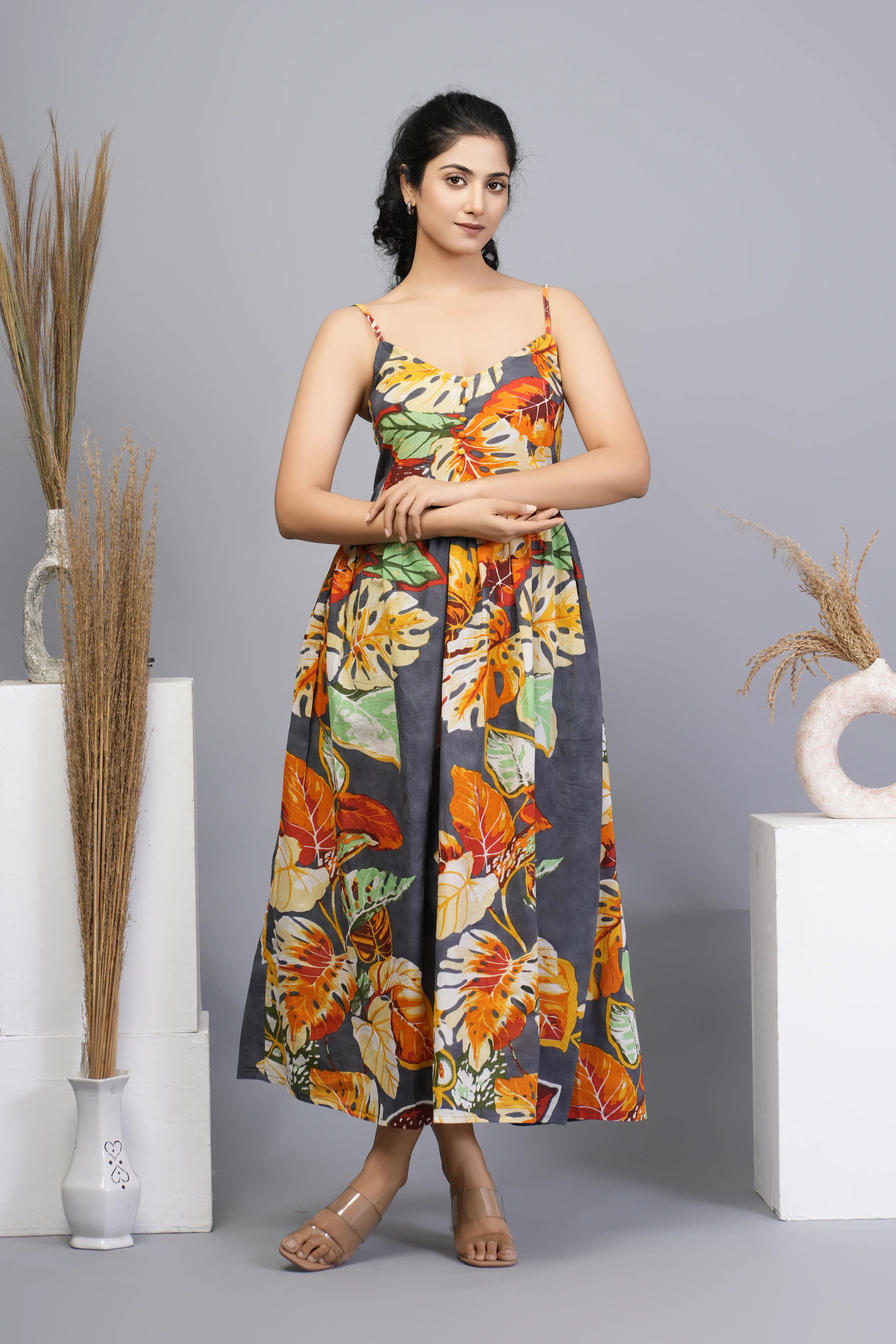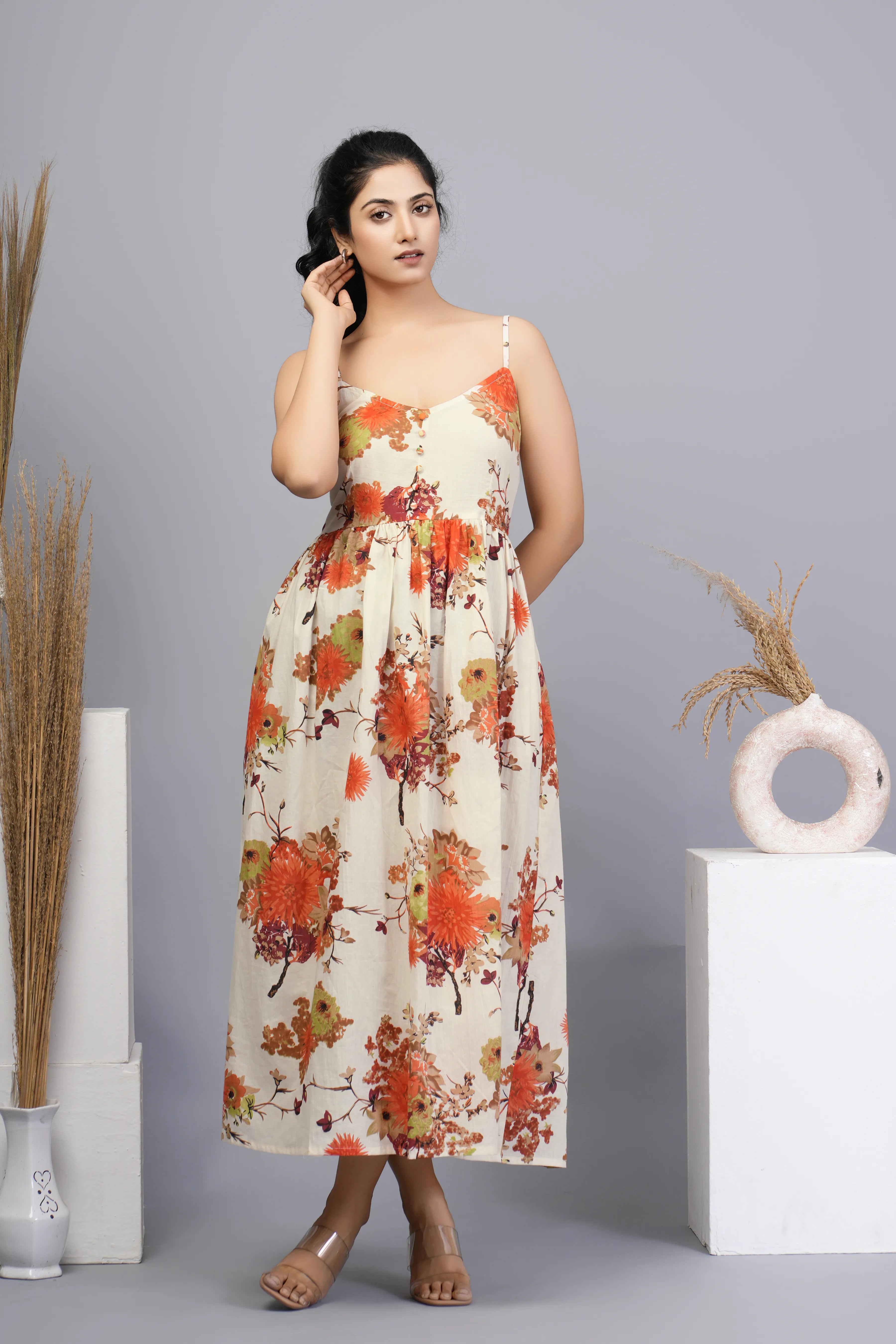 Beige Base with Orange Floral Printed Cotton Midi Dress