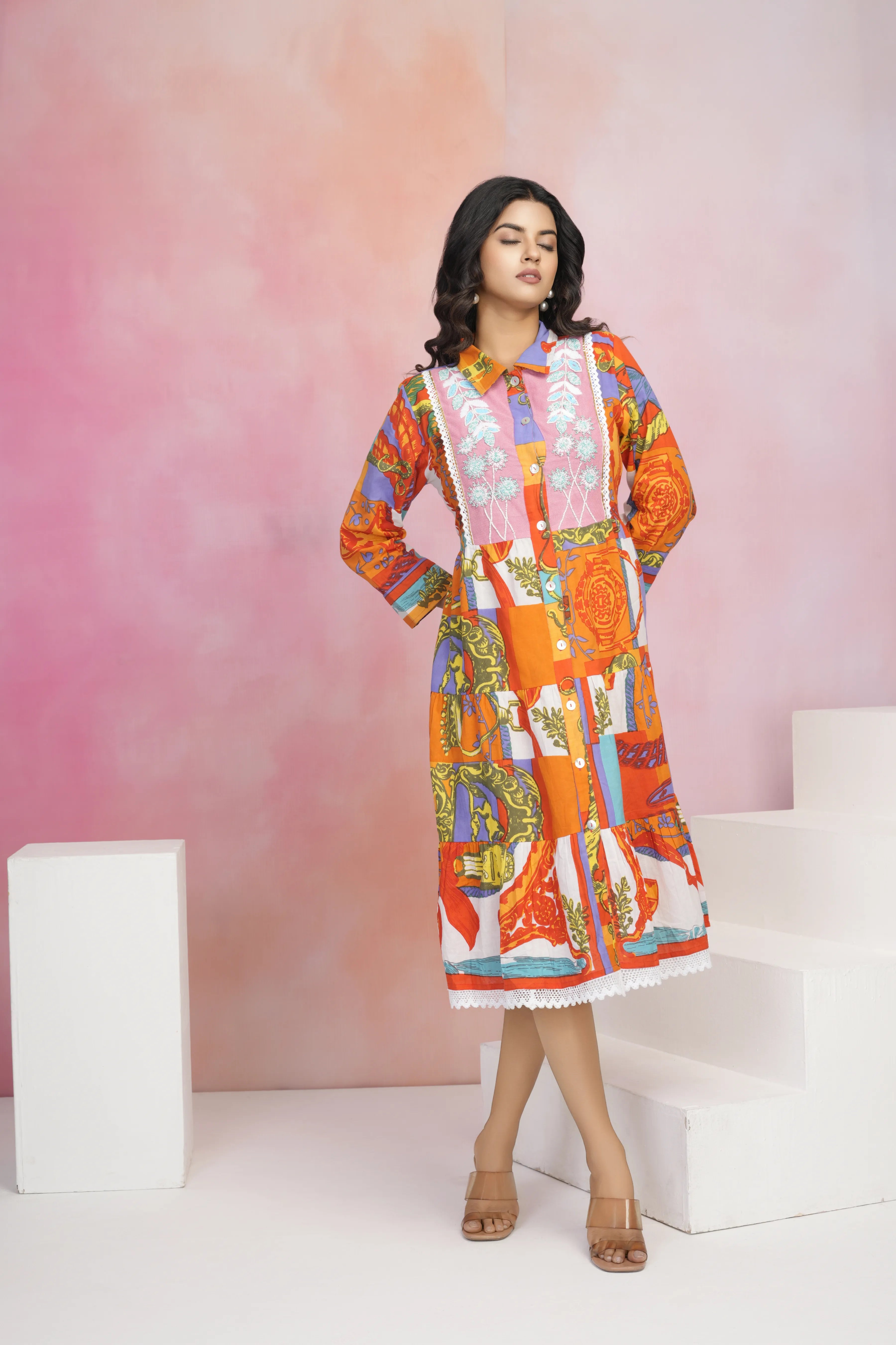 Orange Abstract Floral Lace Detail Cotton Shirt Dress