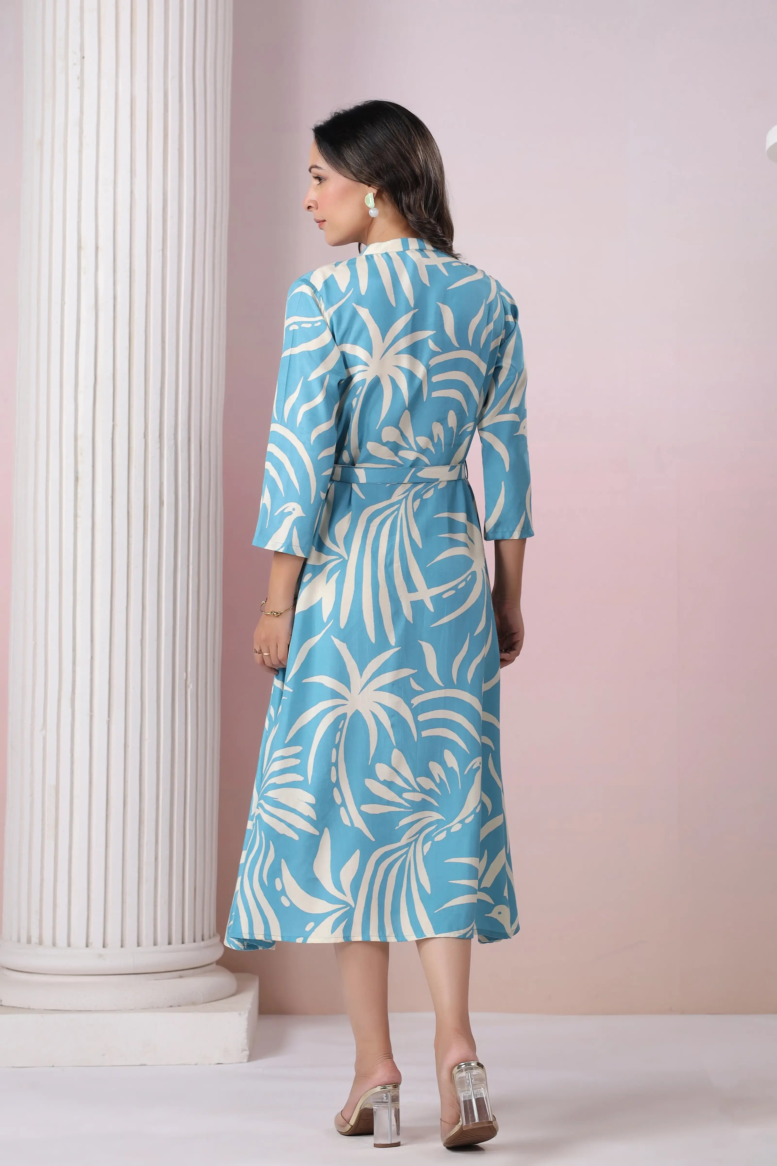 Aqua Blue Base With Cream Color Bold Flower Motif Midi Dress