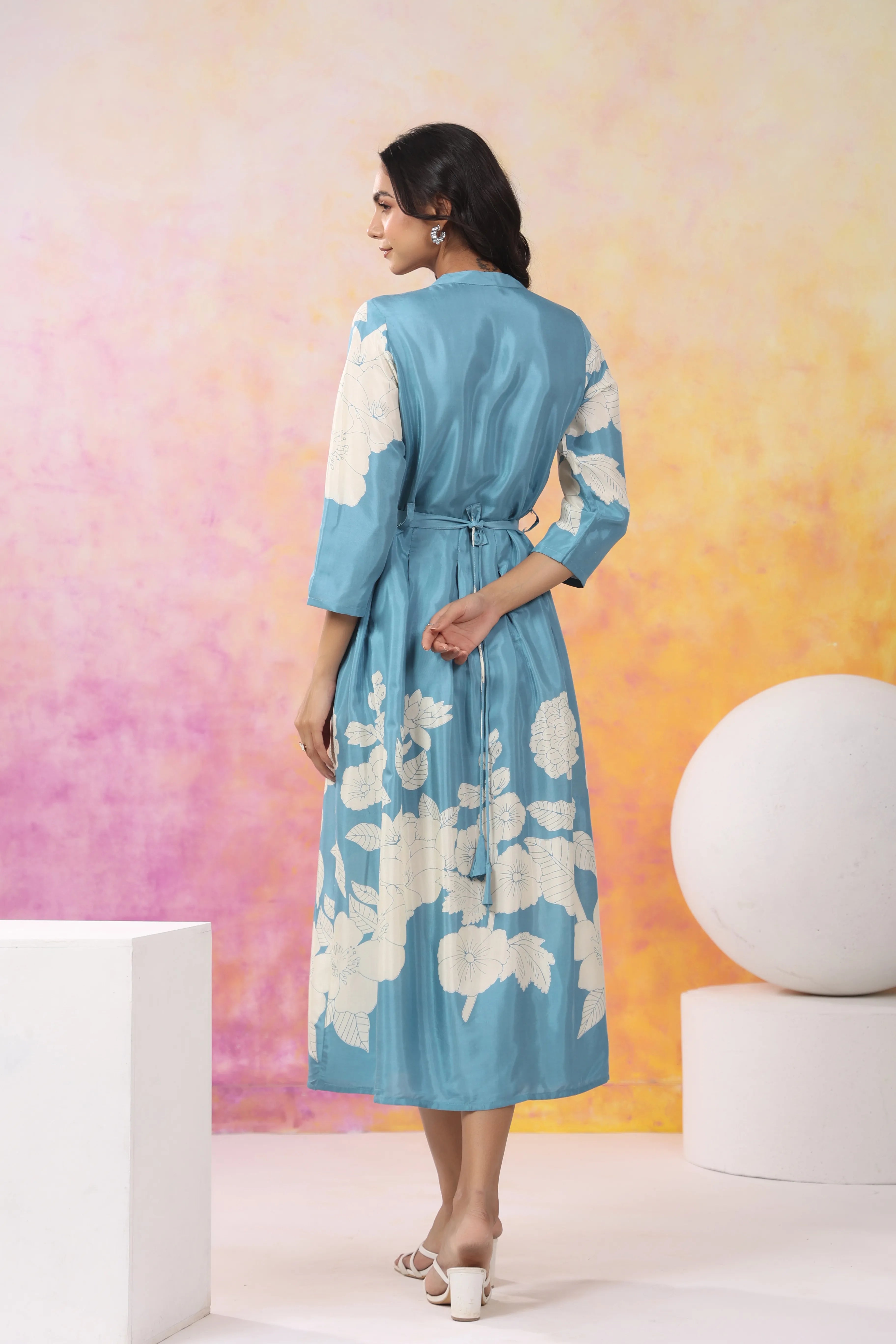 Blue Russian Silk Floral Printed Midi Dress With Belt
