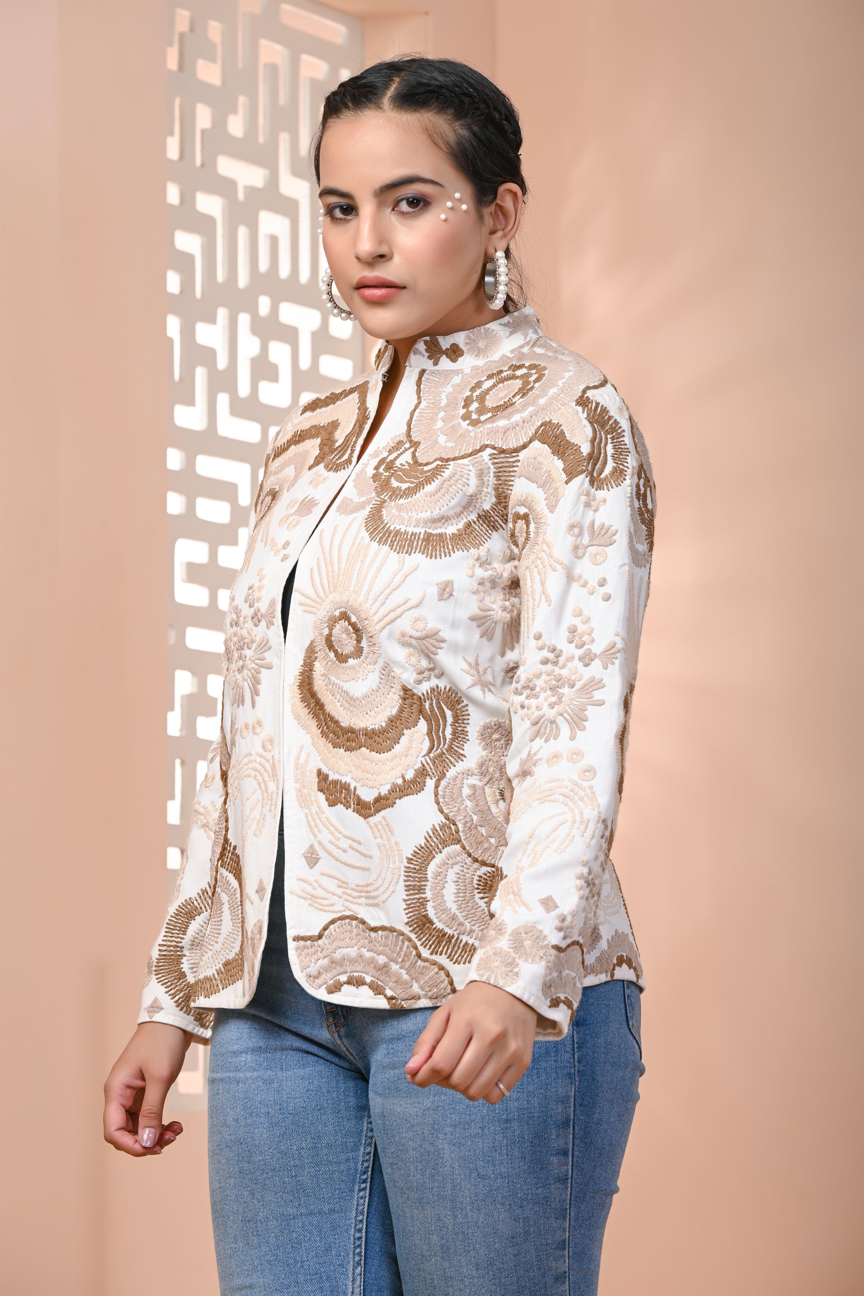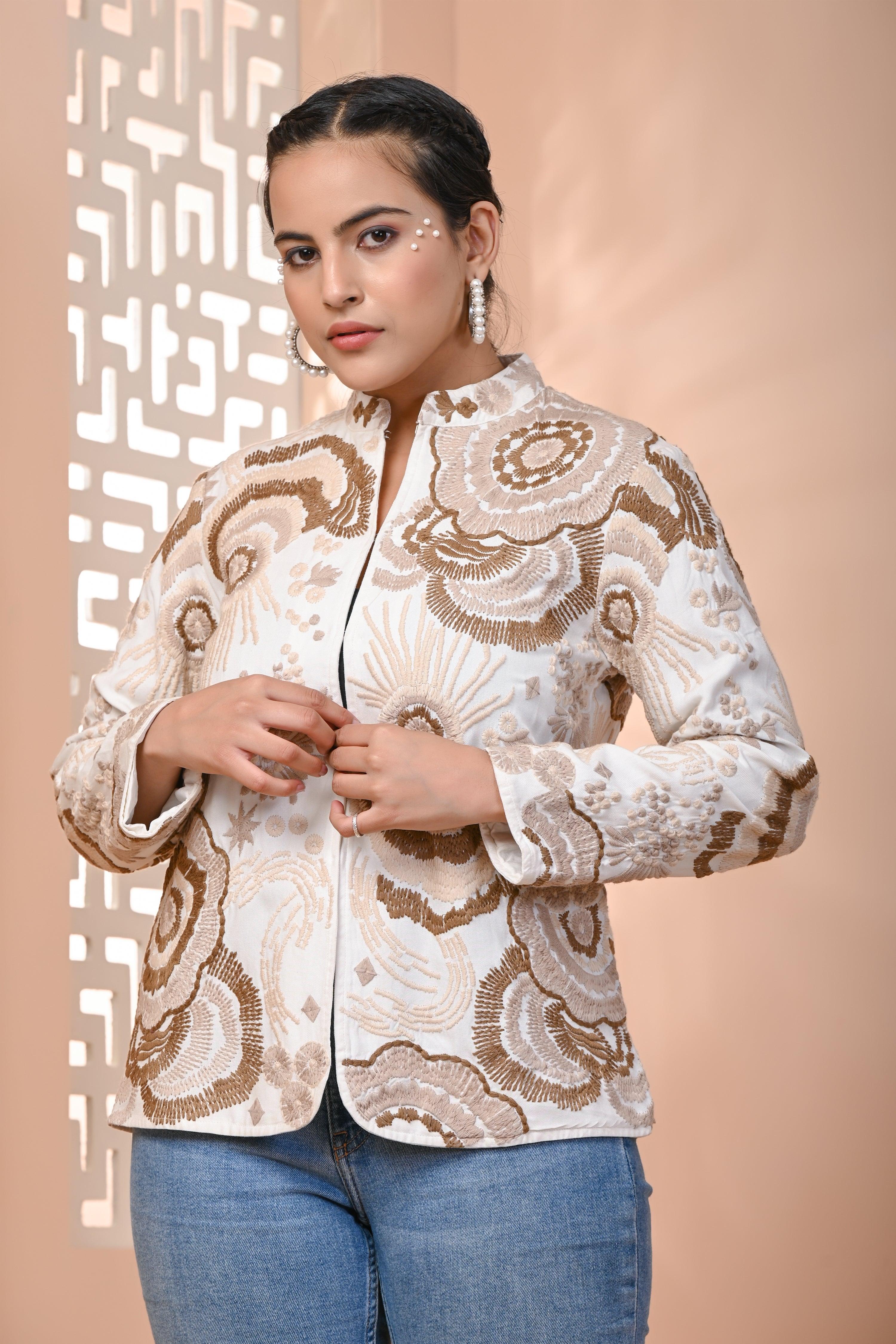 White & Brown Embroidered Cotton Jacket: Subtle Elegance