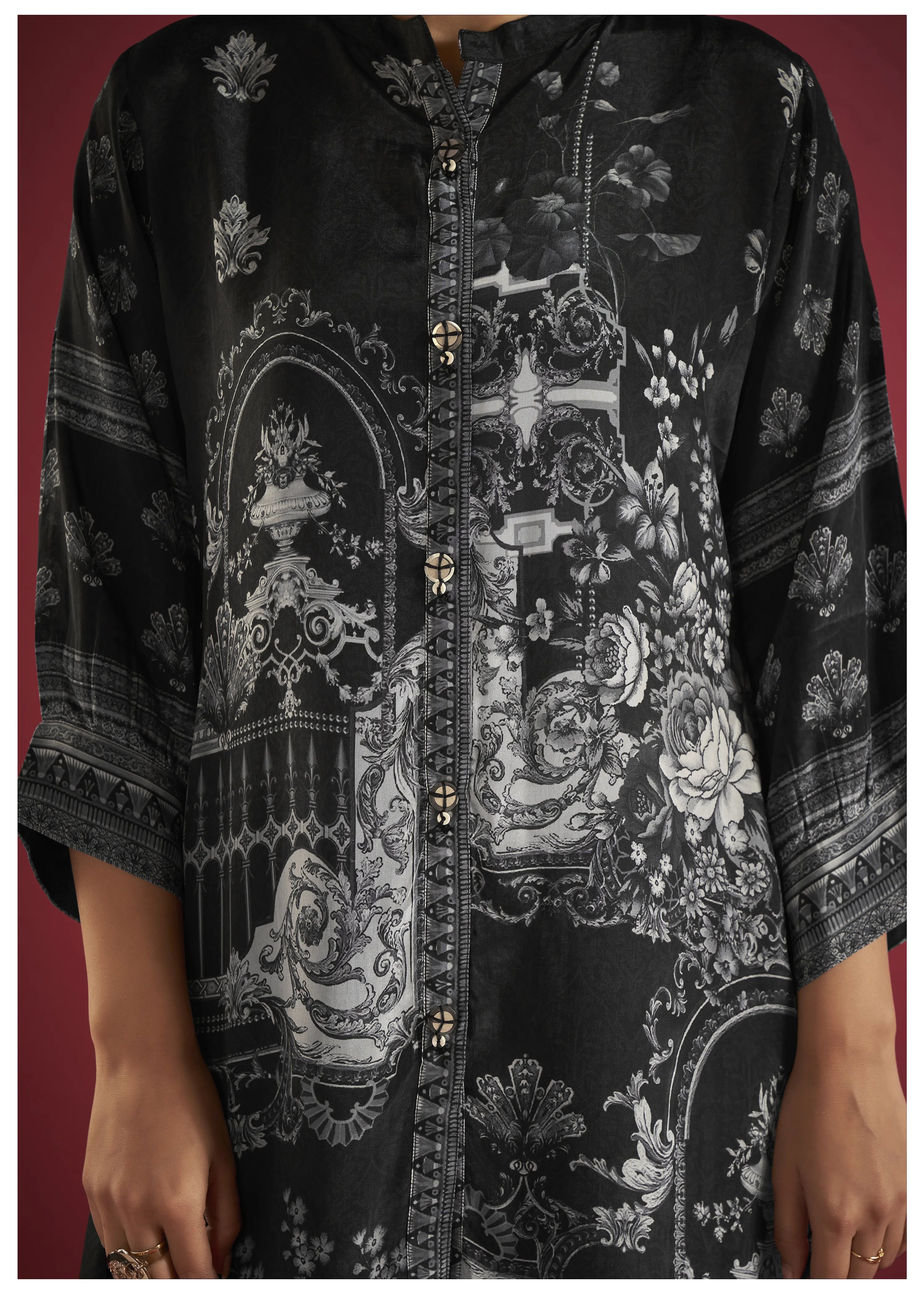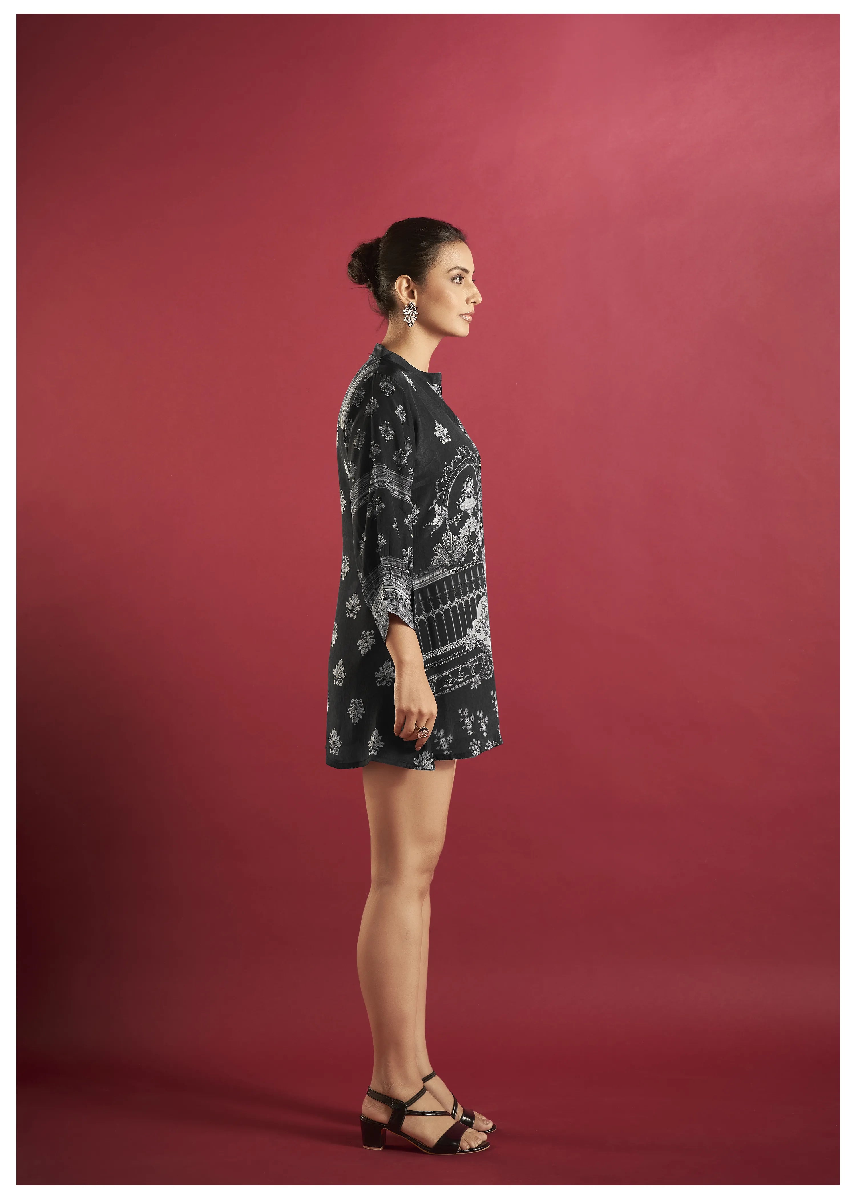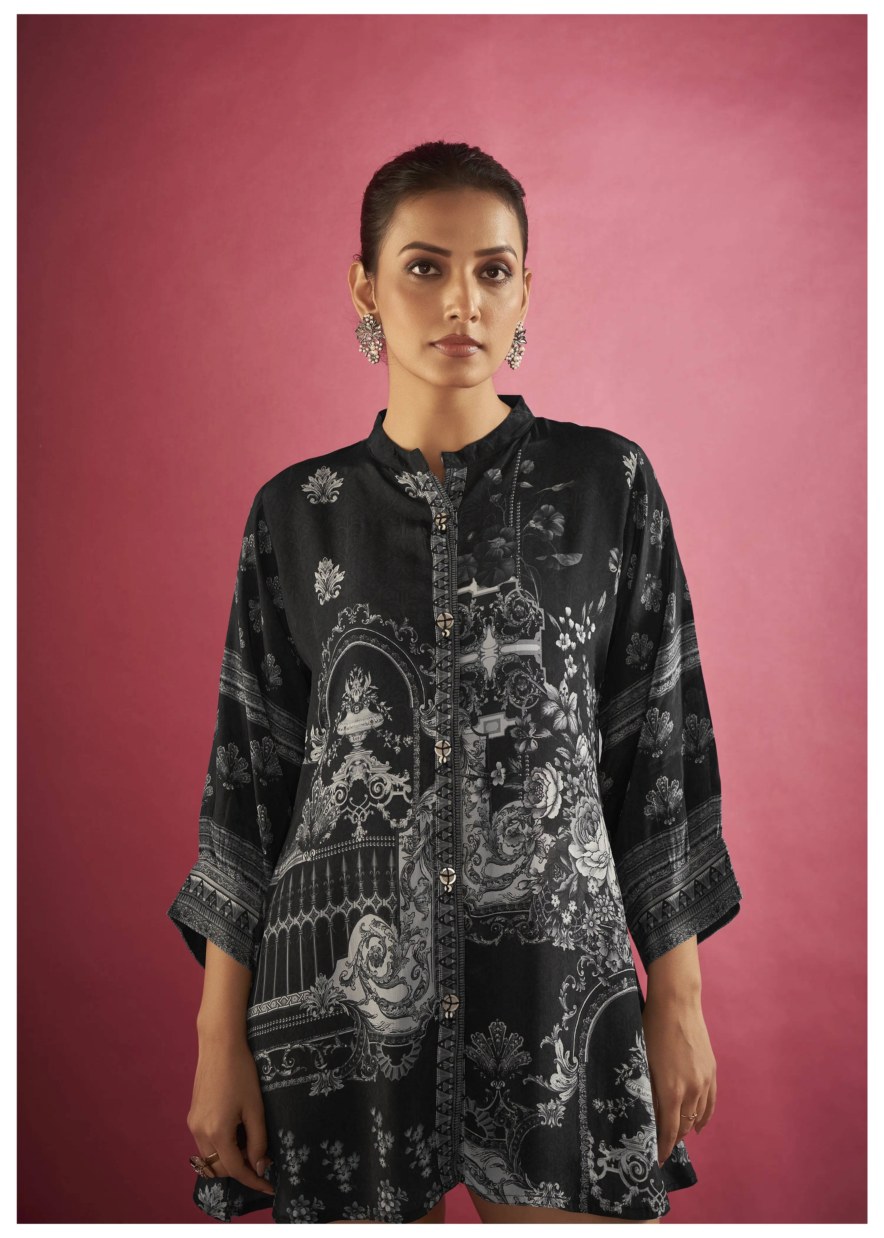 The mandarin collar and button-down design exude understated elegance, while the 3/4th cuff sleeves lend a contemporary vibe to the silhouette. The subtle black and grey print adds a refined touch, making this tunic a versatile addition to your collection.