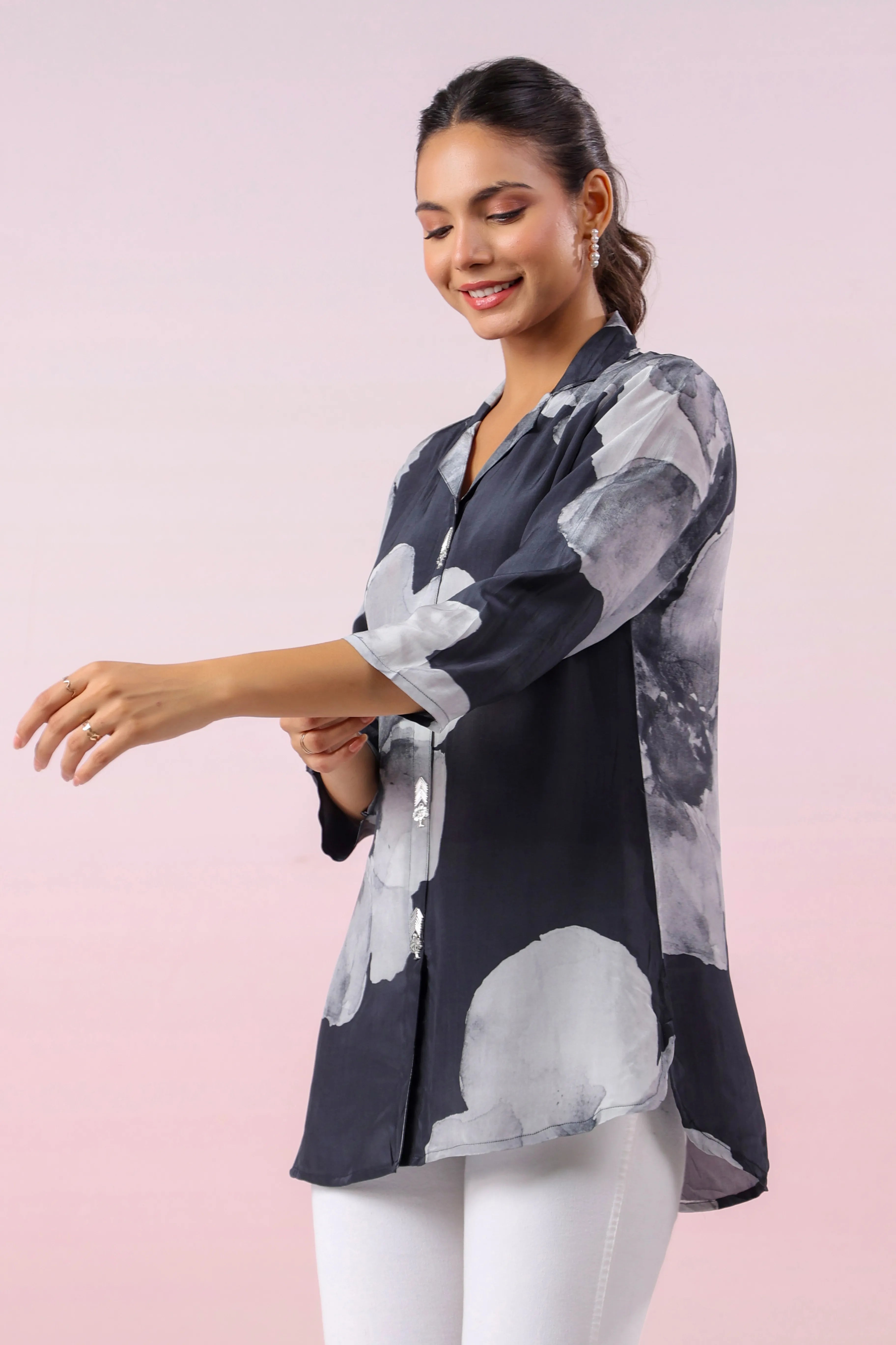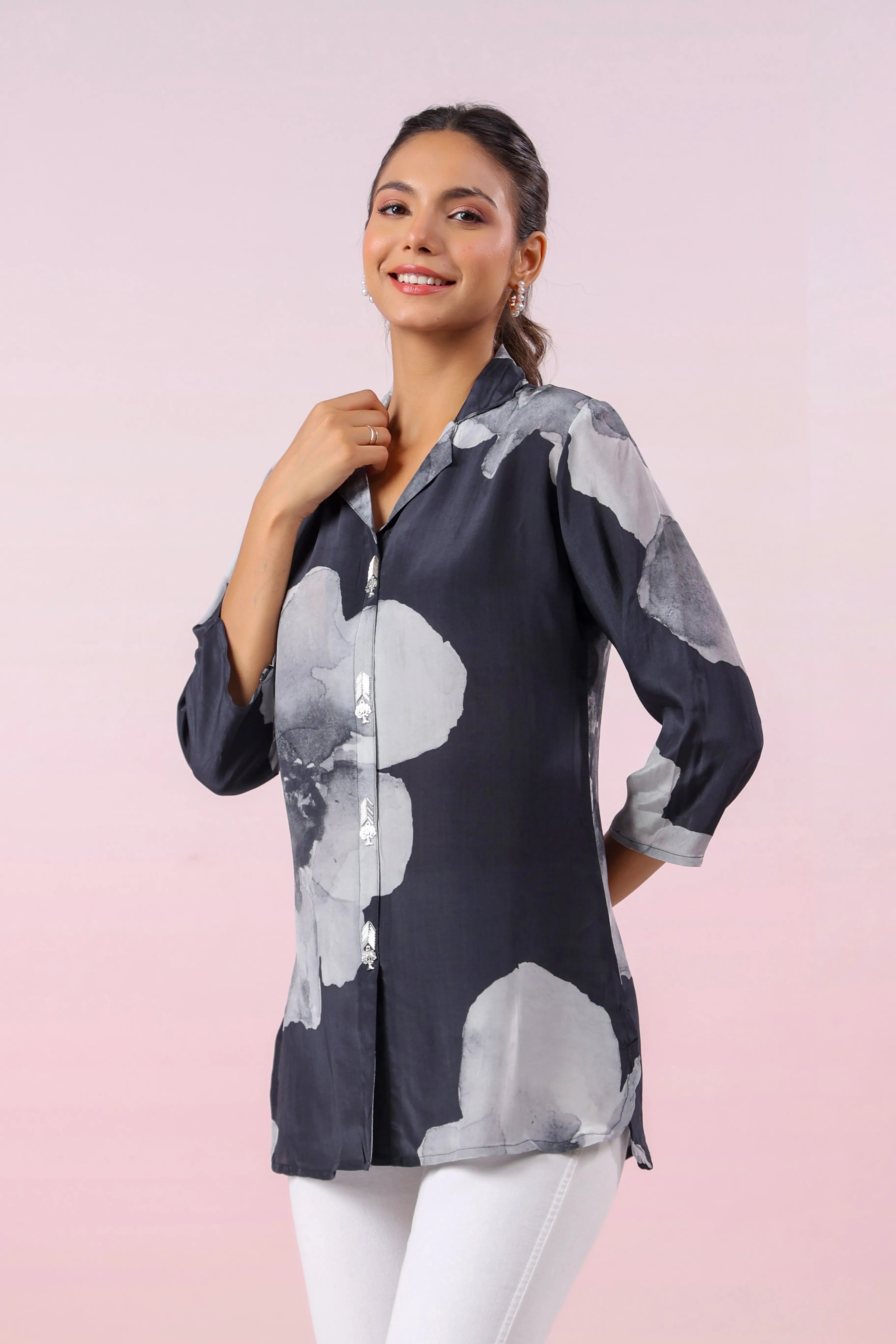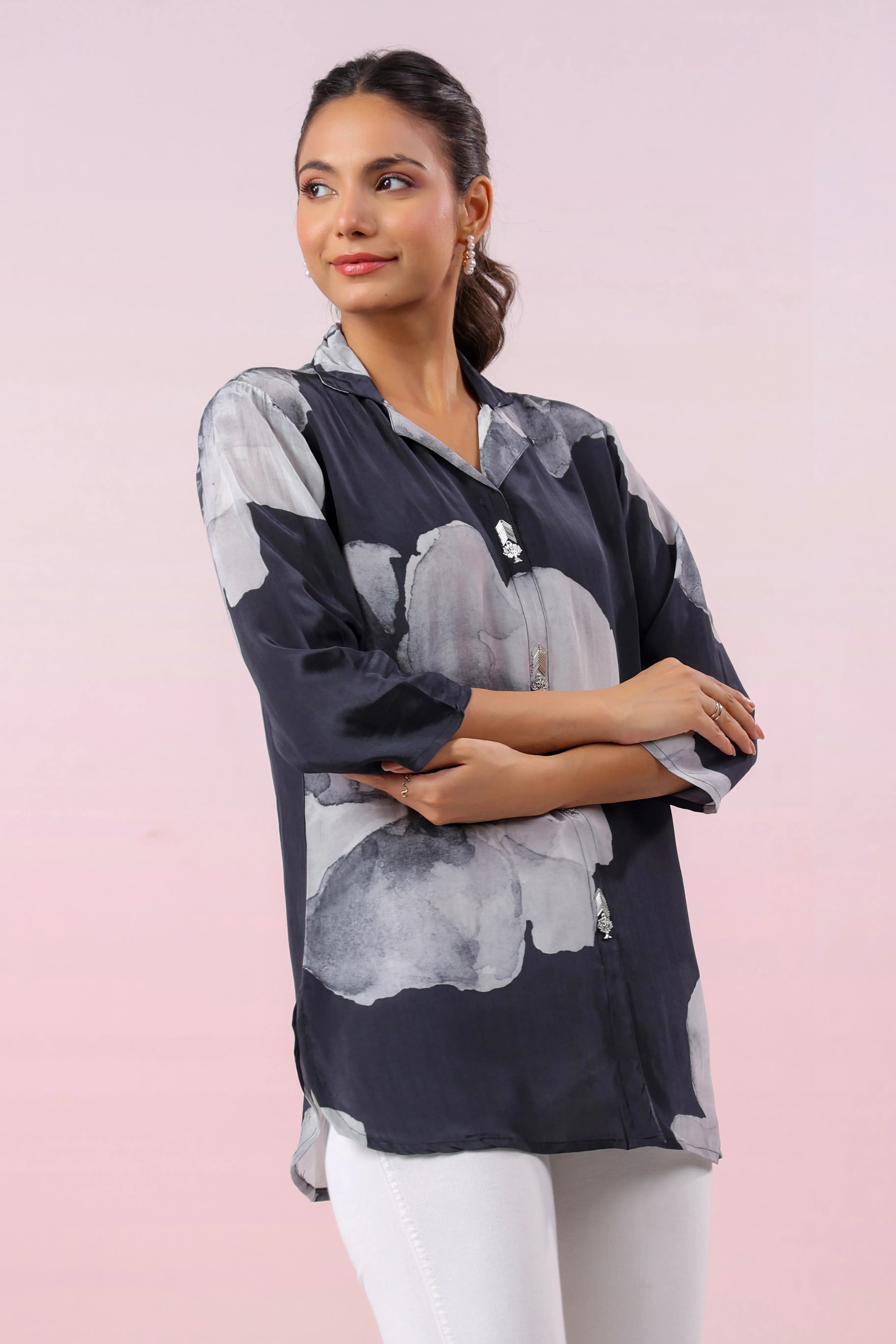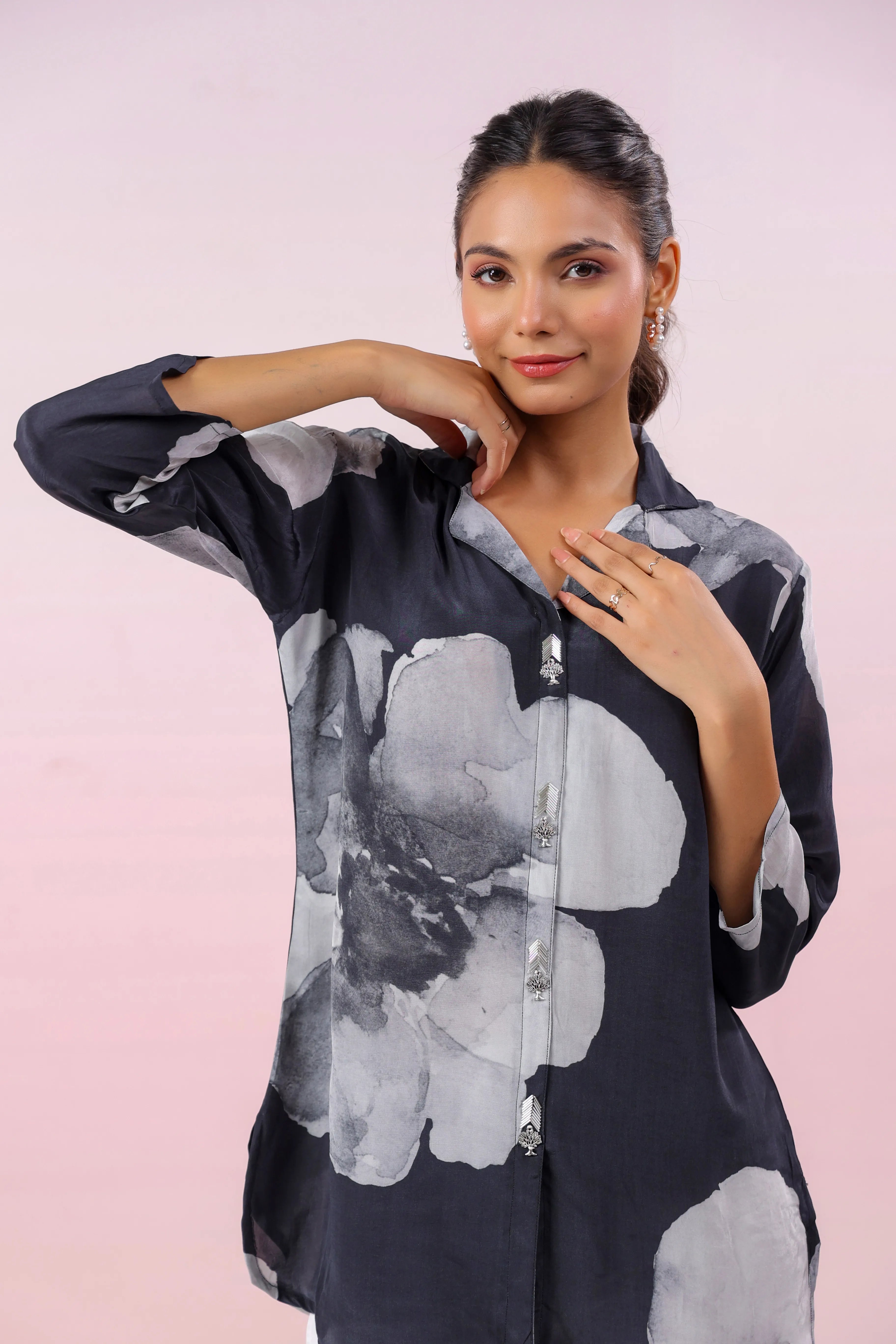 This Black Printed Russian Silk Top is a beautiful fusion of modern sophistication and delicate detailing. The floral print in rich hues adds a lively touch, while the notched collar and shell embellishments on the faux front placket enhance its elegant appeal. Designed with a regular fit and curved hem, this top pairs perfectly with both casual and semi-formal outfits, making it a versatile addition to your wardrobe.