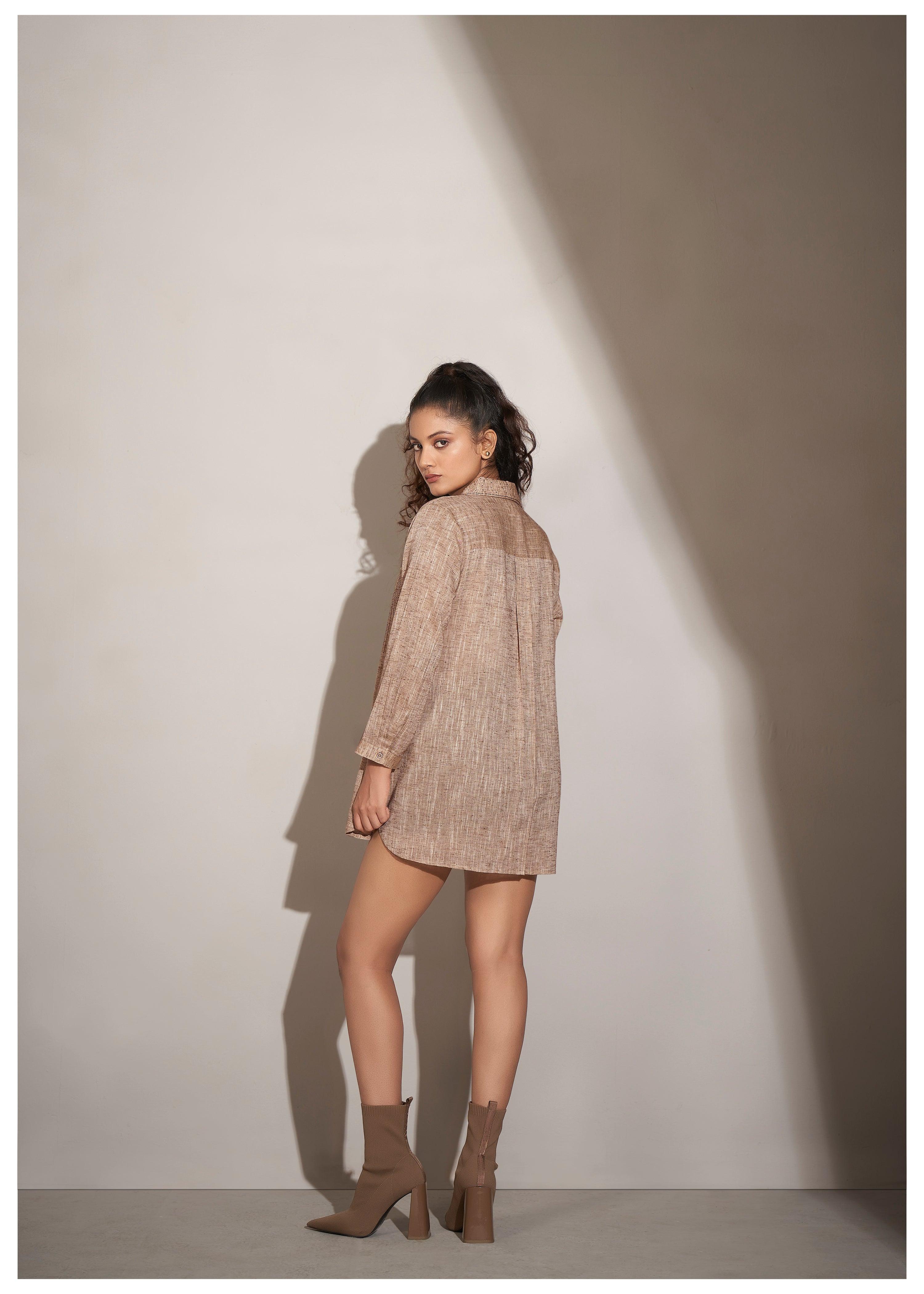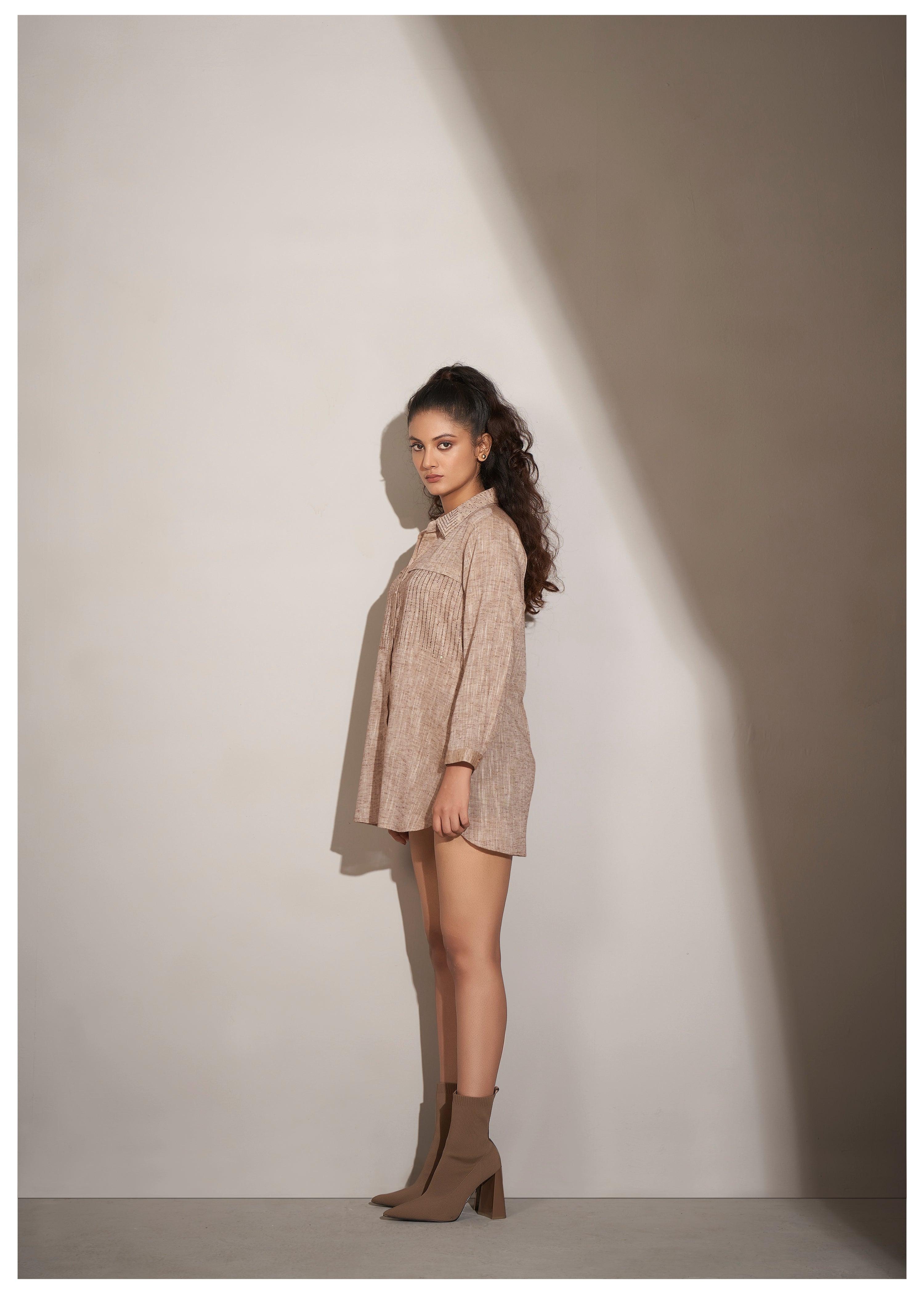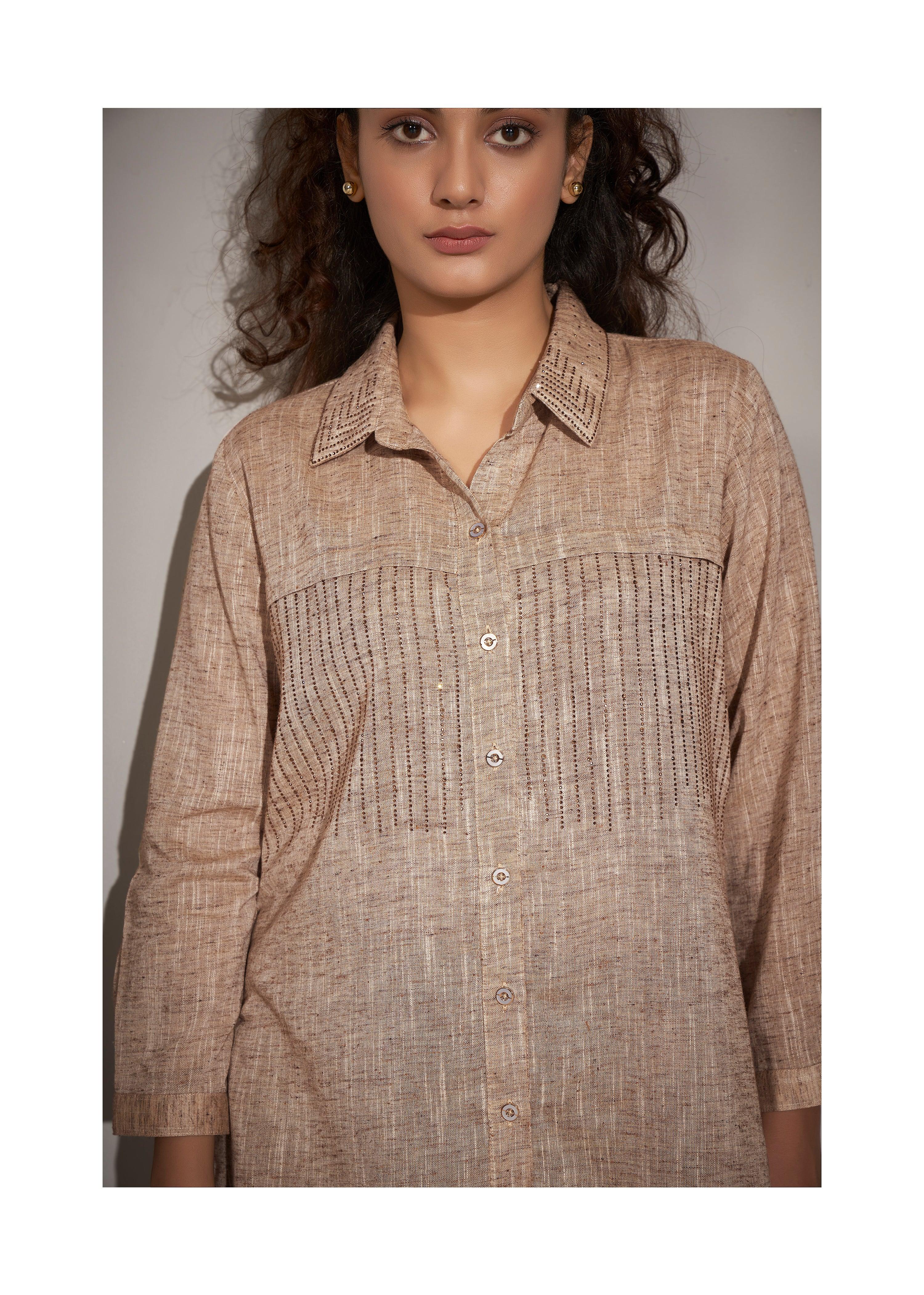 Add a modern twist to your wardrobe with this chic beige cotton-khadi shirt. Designed with intricate falling geometric rhinestone detailing front & collar, it exudes a perfect balance of elegance and edginess. The curved hem and slightly loose fit ensure a relaxed yet stylish silhouette, while the straight full sleeves elevate the overall design. Crafted from lightweight khadi fabric, this shirt is a versatile piece for casual outings with a fashionable flair.