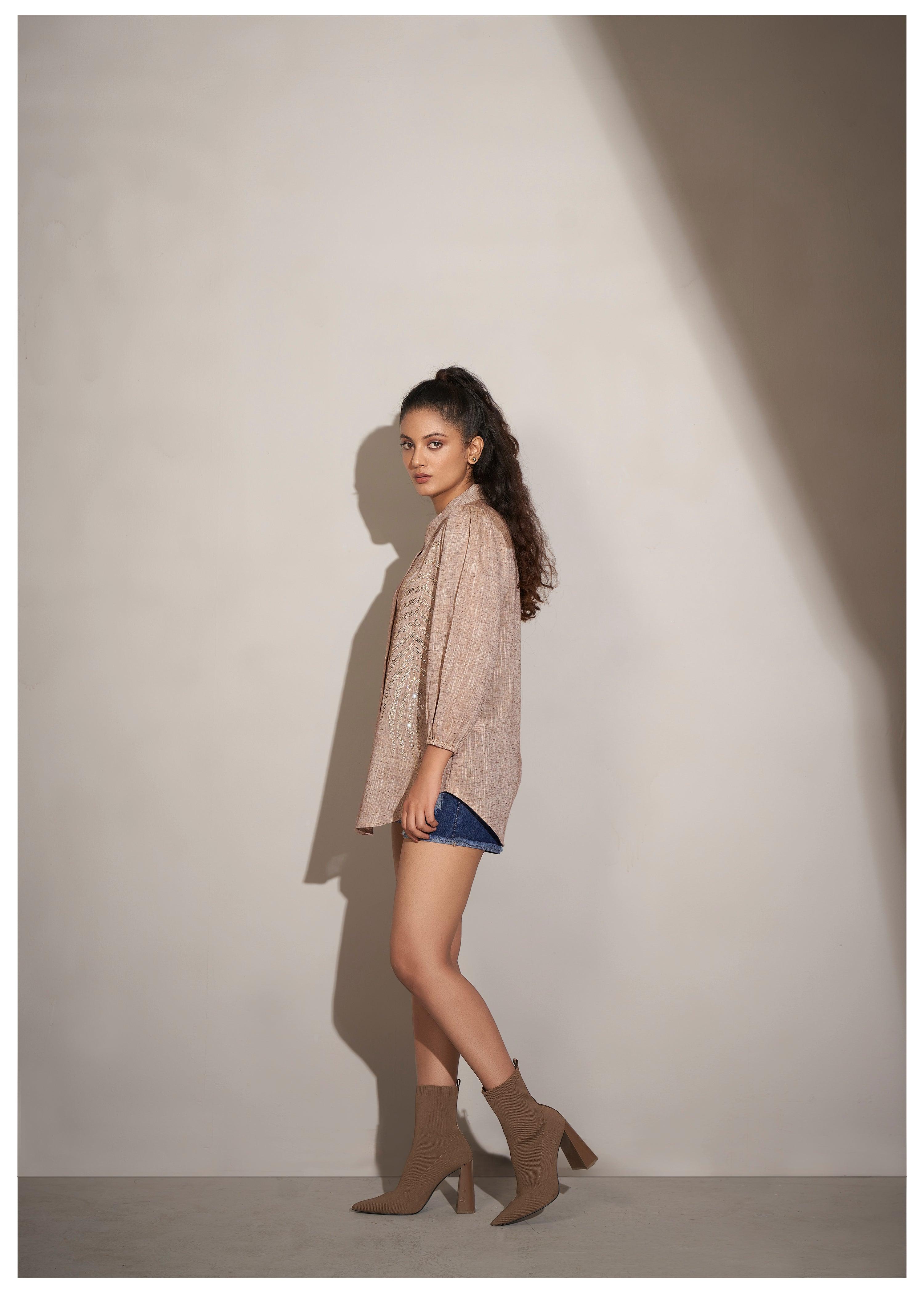 Step into effortless style with this beige cotton khadi shirt, featuring bold elegant fern leaf rhinestone detailing. The shirt’s curved hem and slightly loose fit create a chic silhouette, while the straight full sleeves with elasticated cuffs accents add a touch of glamour. Crafted from lightweight khadi fabric, this versatile shirt is designed for casual outings with a hint of sophistication.