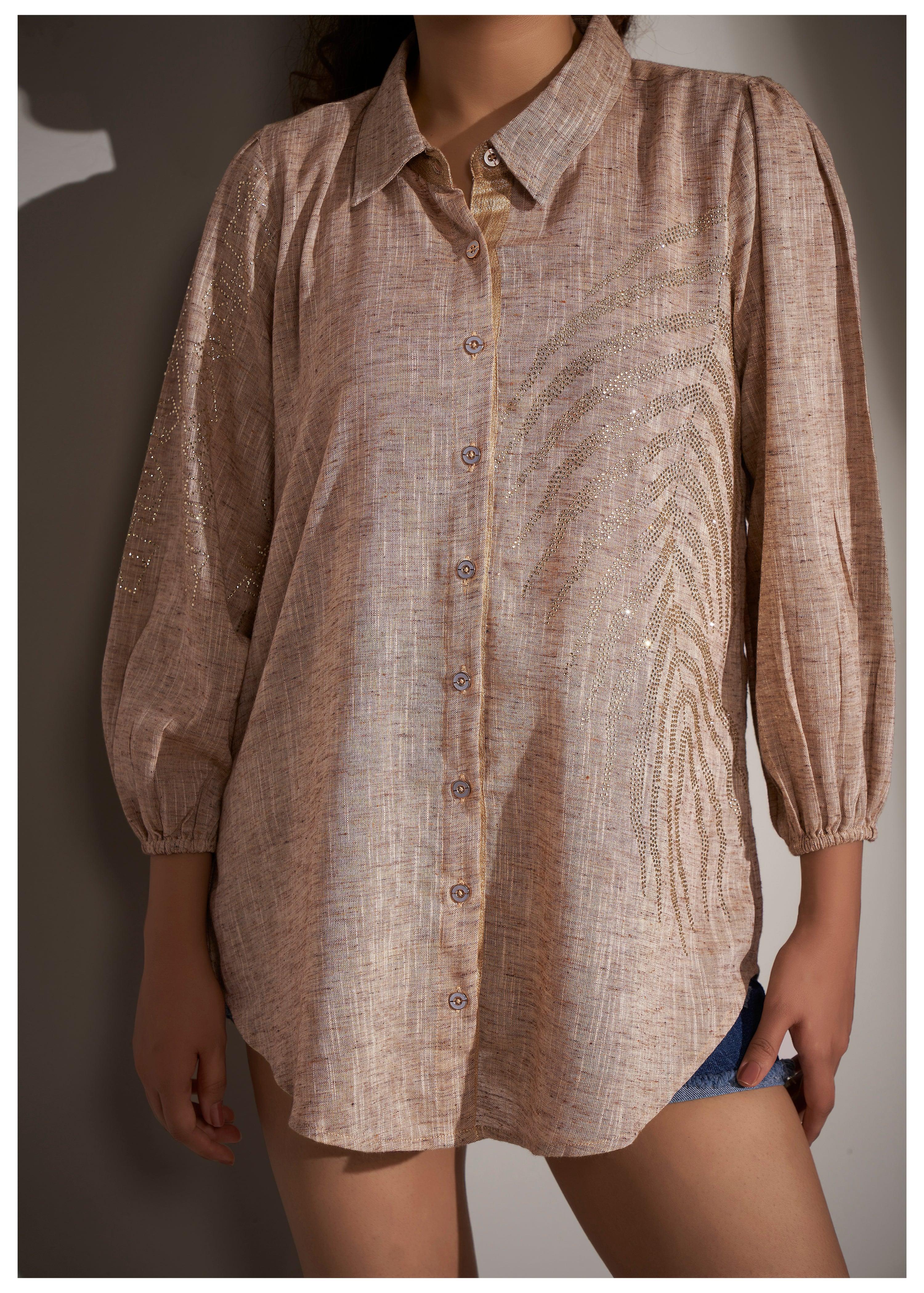 Beige Cotton Khadi Shirt with Fern Leaf Rhinestone Detailing