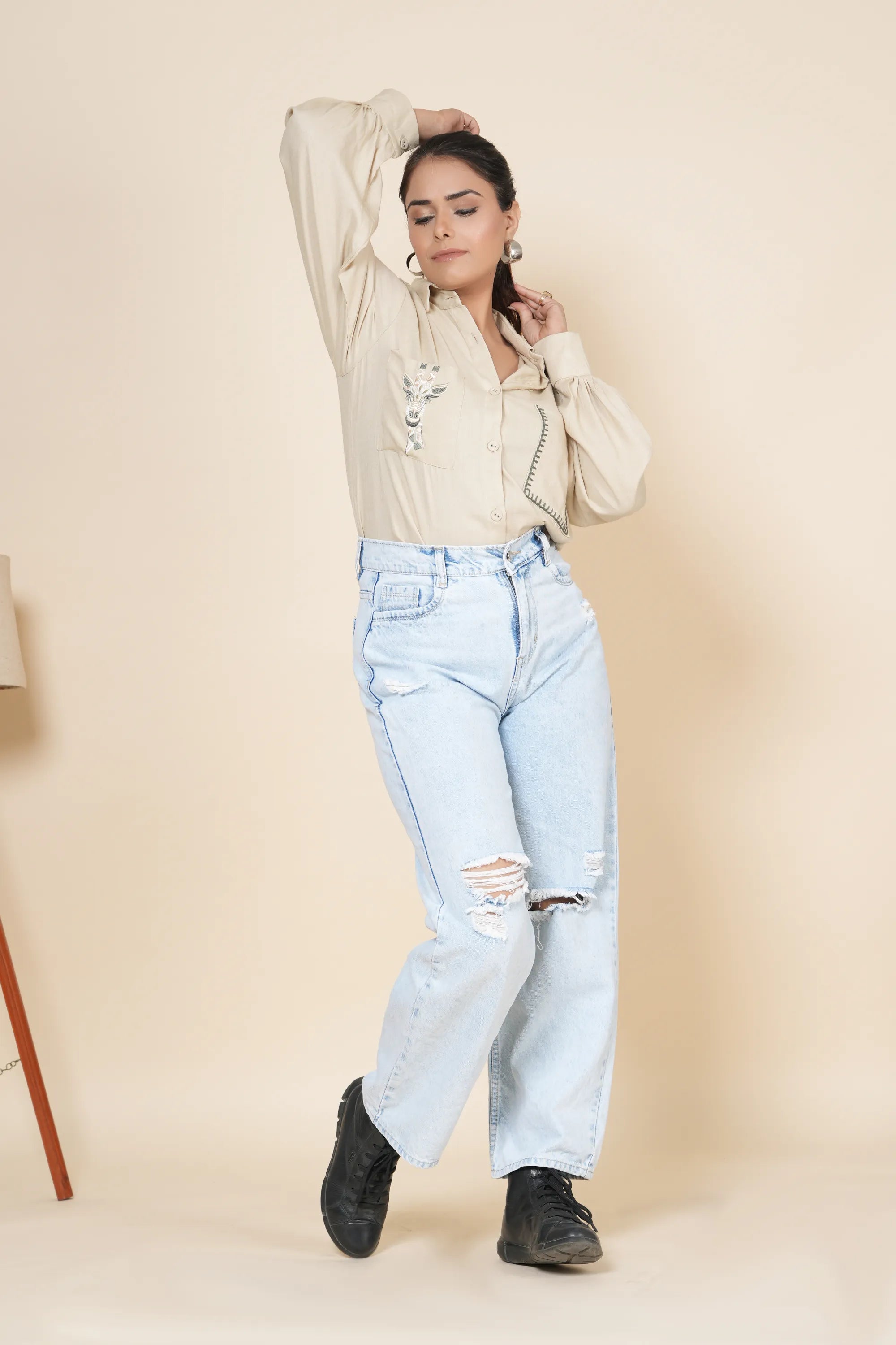 Understated Elegance: Beige Linen Shirt with Thread Work Embroidery