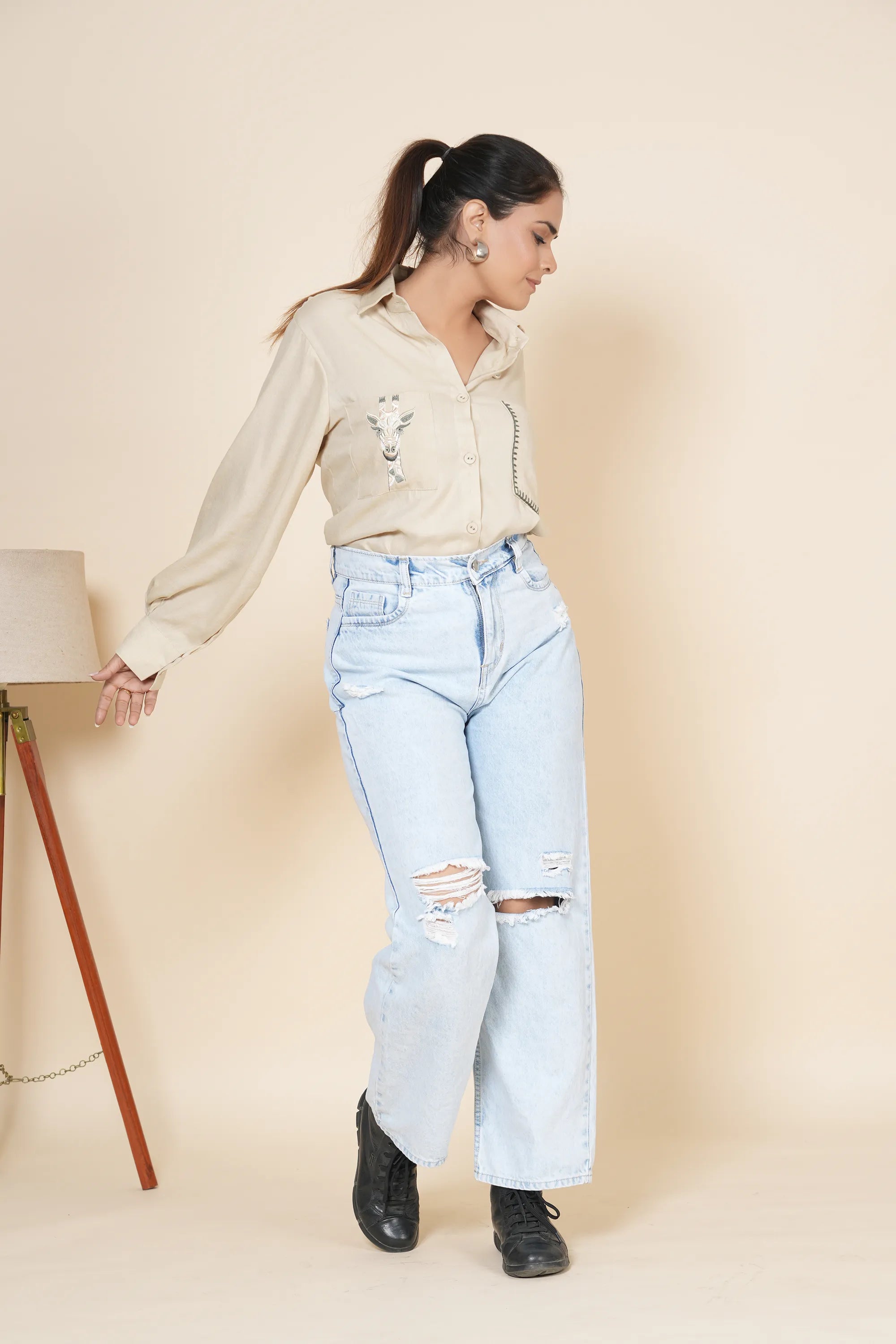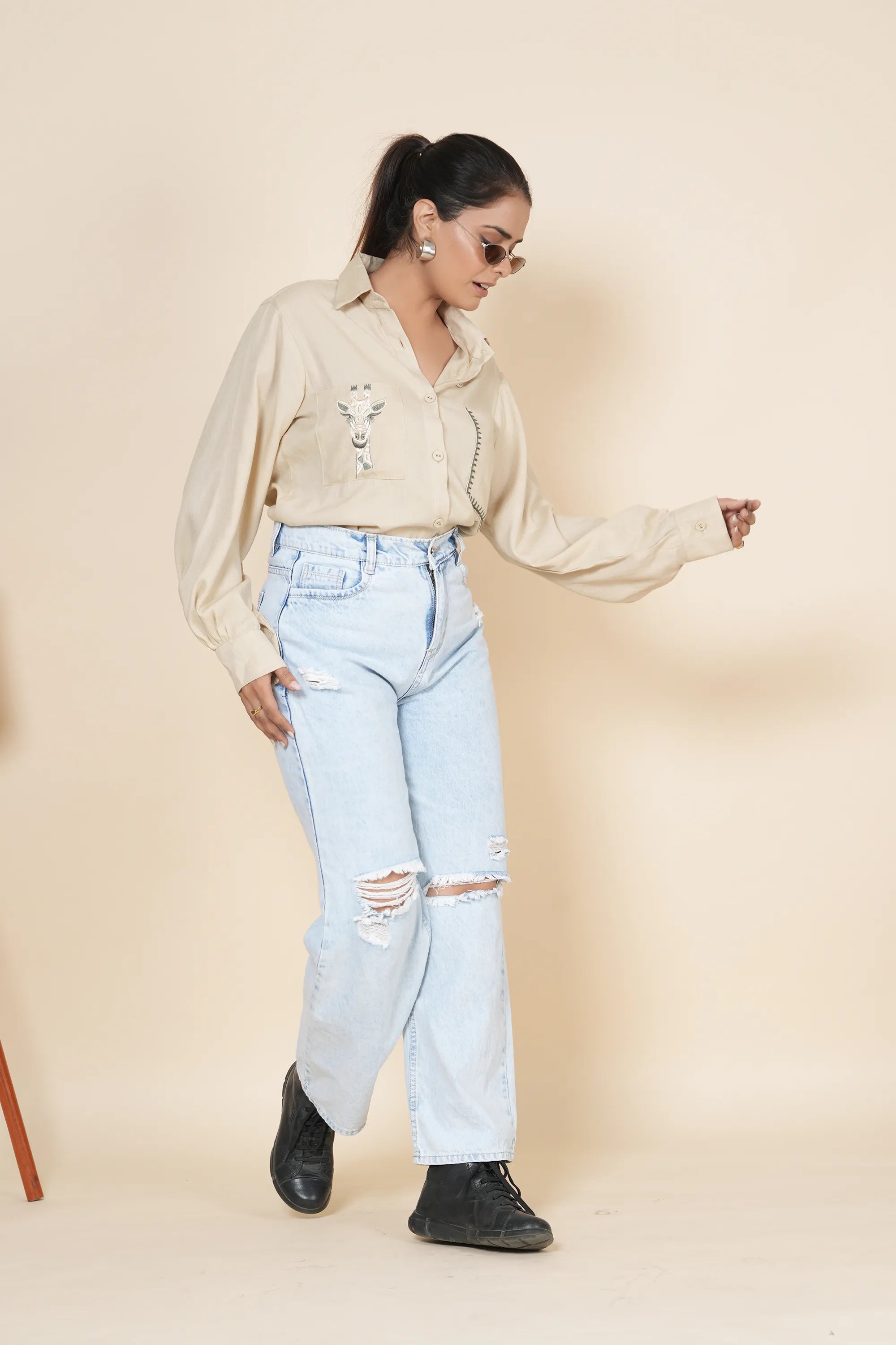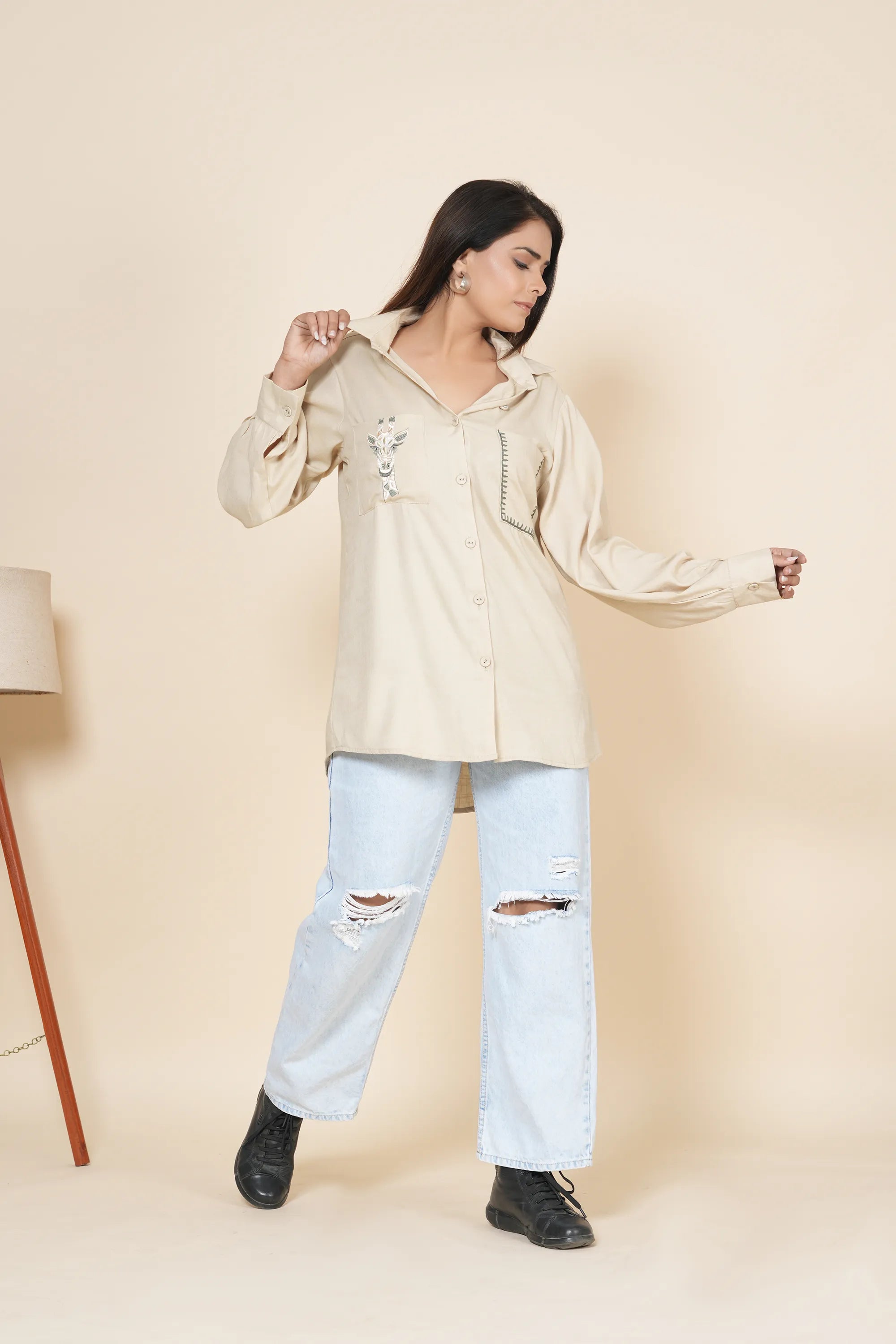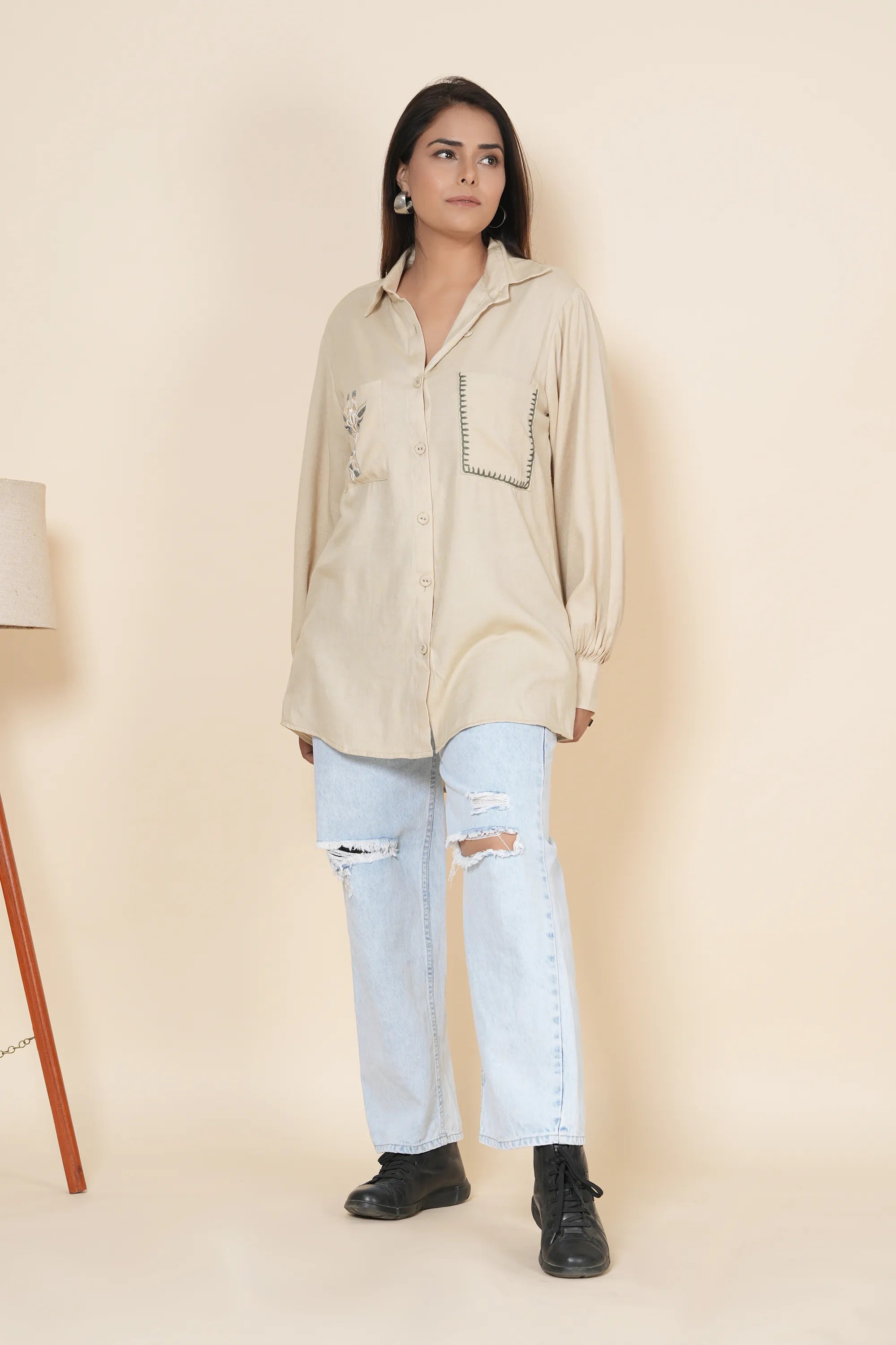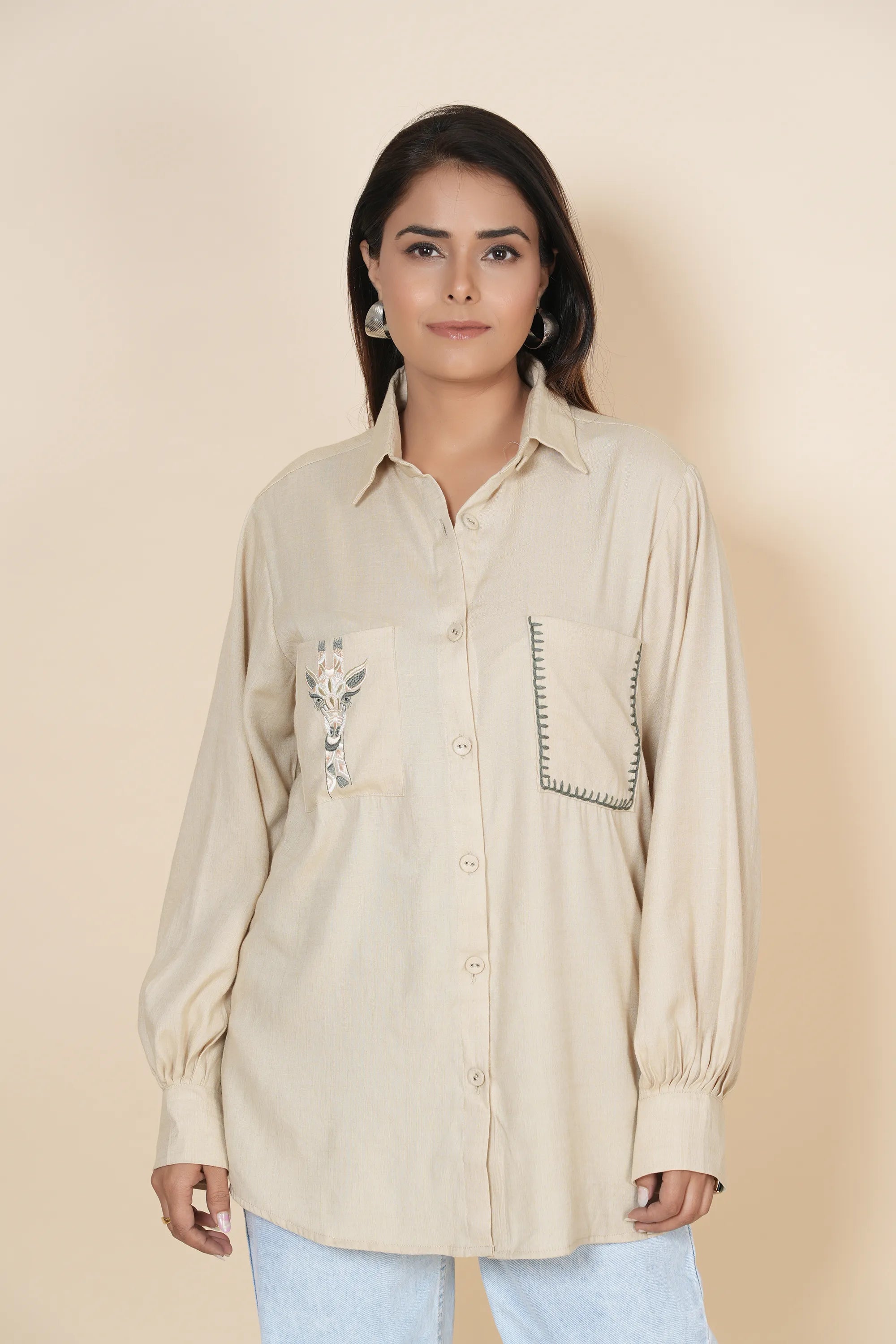 Shirt: Beige Base, Delicate Thread Work Embroidery, Classic Collar, Full Sleeves Gathered at Cuffs, Two Front Pockets, Fabric Buttons, Button-Down Front Closure