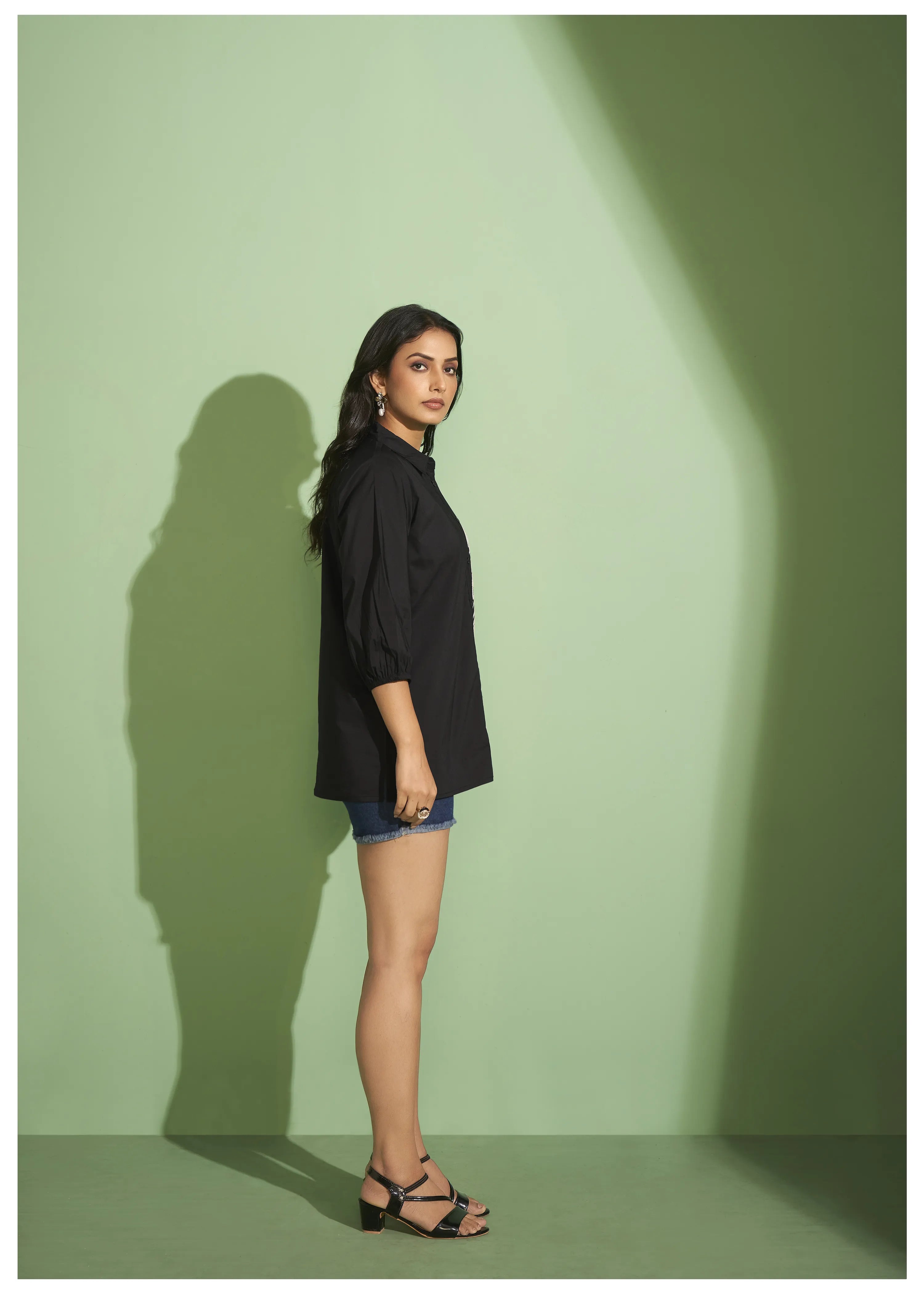 Elevate your everyday wardrobe with this black cotton poplin shirt, beautifully adorned with intricate cord embroidery. The classic shirt collar and 3/4th elasticized sleeves offer a flattering and comfortable fit, while the detailed embroidery adds a sophisticated touch of artistry.