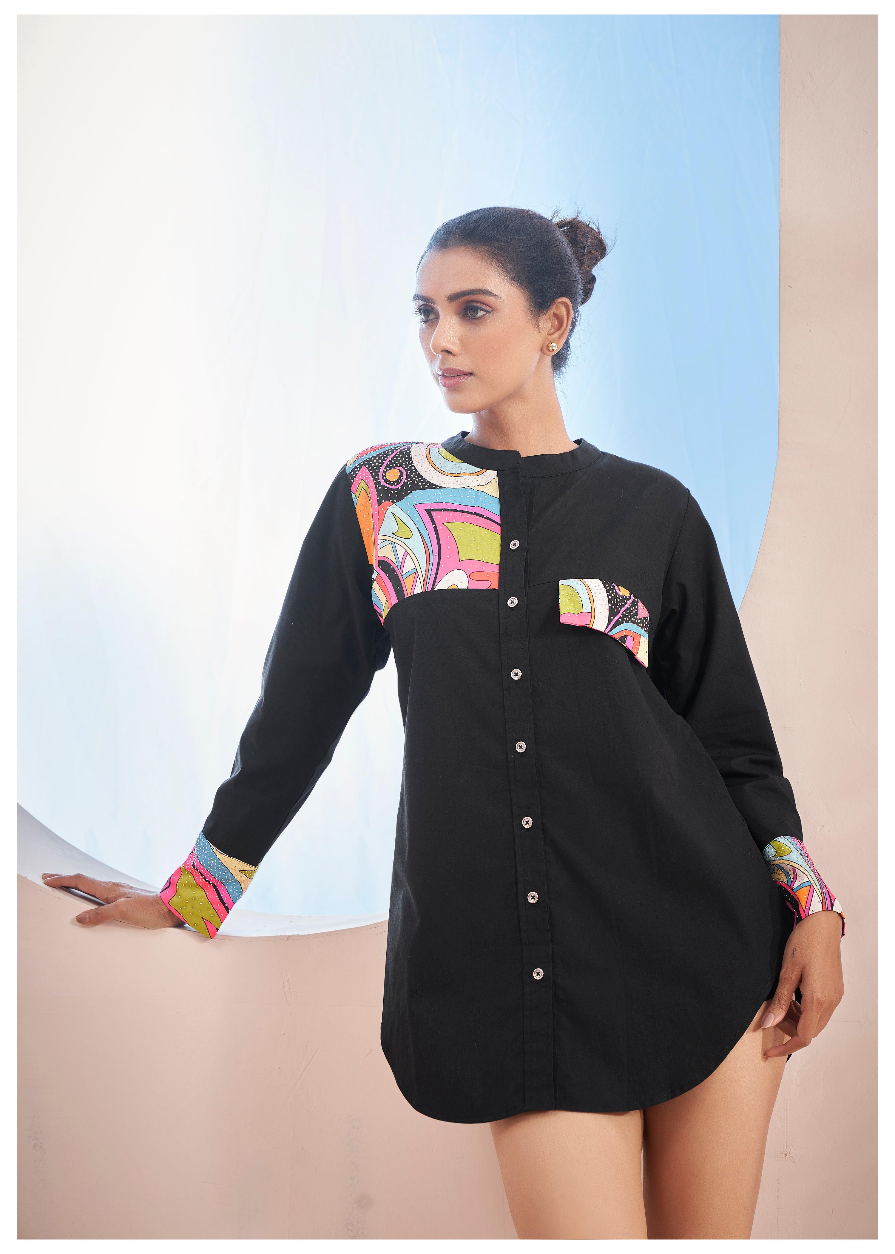 Make a statement with this black cotton shirt, designed to turn heads with its bold abstract print patches and sparkling rhinestone accents. Crafted from high-quality poplin fabric, this shirt features a slightly loose fit for comfort and style. The curved hem adds a modern touch, while the full sleeves with bold print and rhinestone cuffs bring a unique flair to your casual wardrobe.