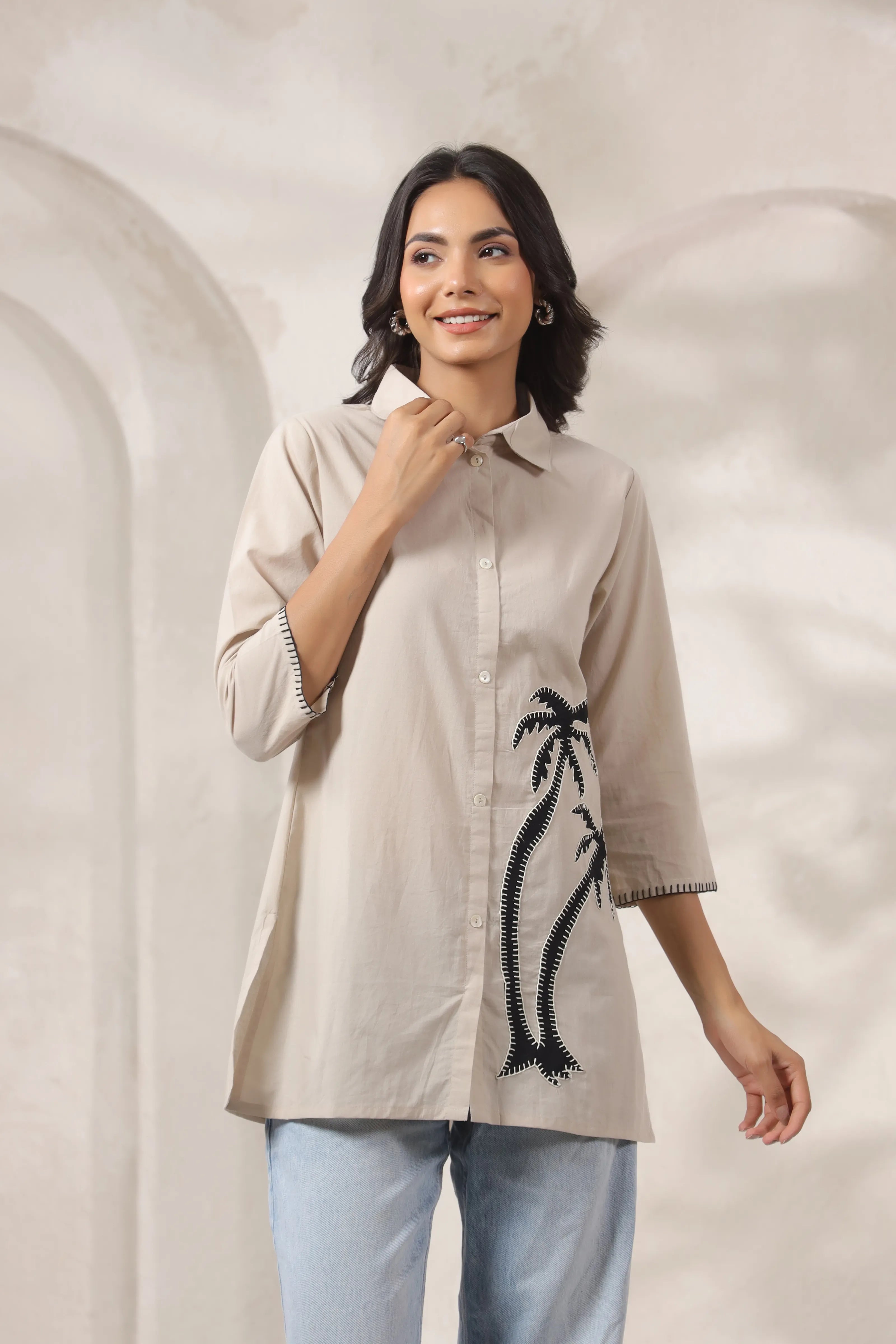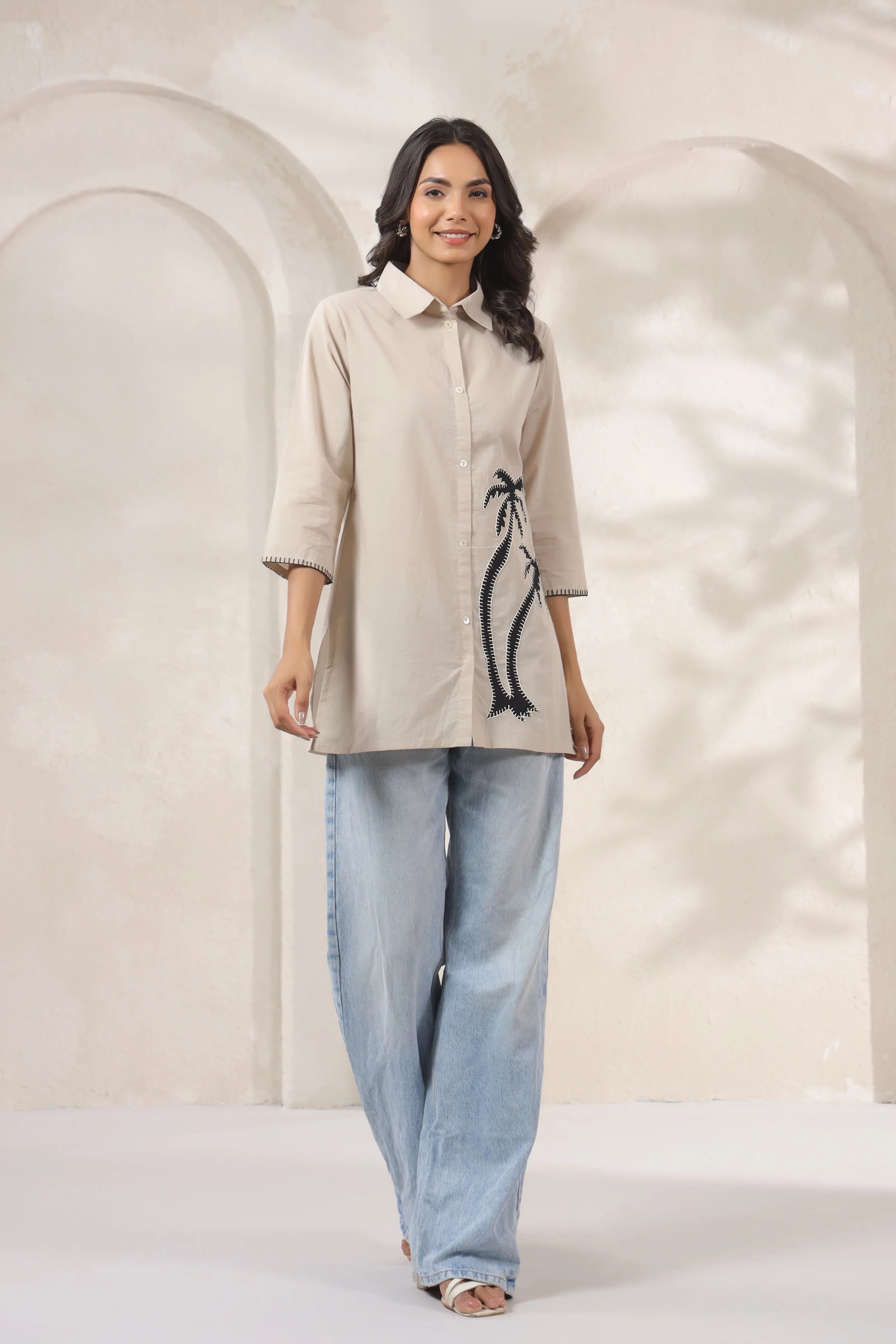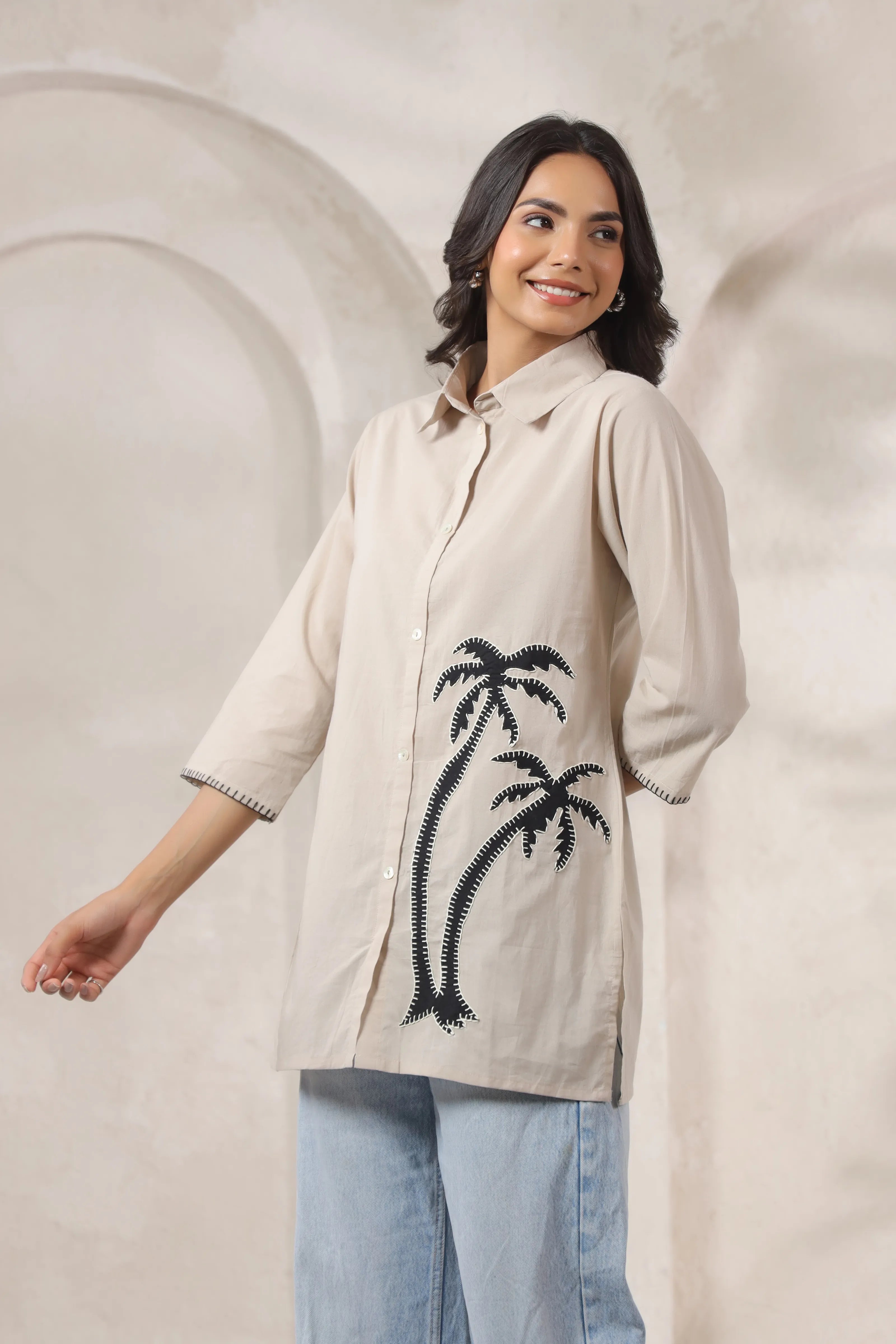 Key Features: • Fabric: Premium cotton cambric – lightweight and breezy • Color: Neutral beige with black palm patch detailing • Design Elements: Blanket-stitched palm appliqué, contrast cuff stitch, shell buttons • Neckline: Smart shirt collar • Sleeves: 3/4th sleeves with turned cuff detailing • Fit: Relaxed fit for all-day comfort
