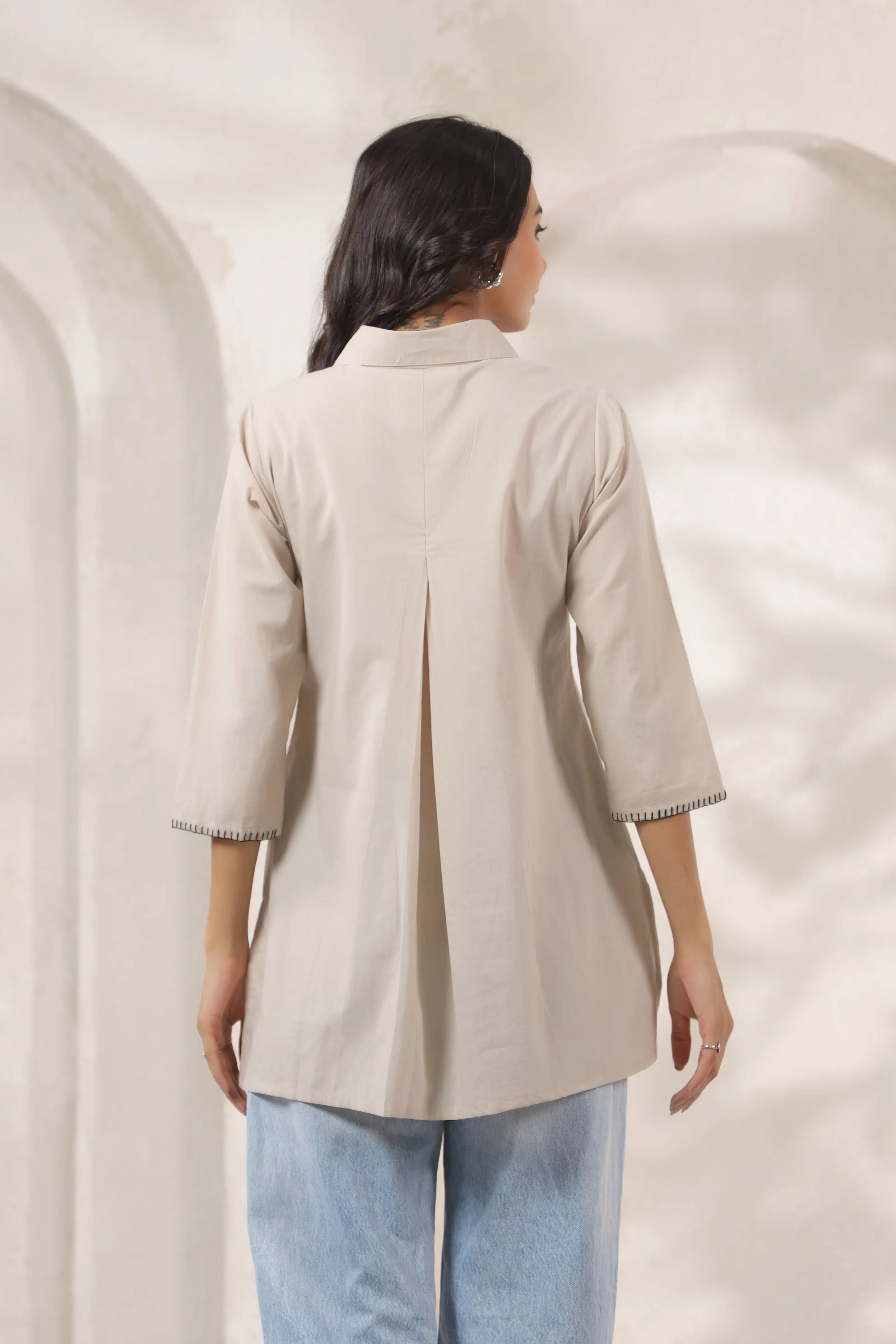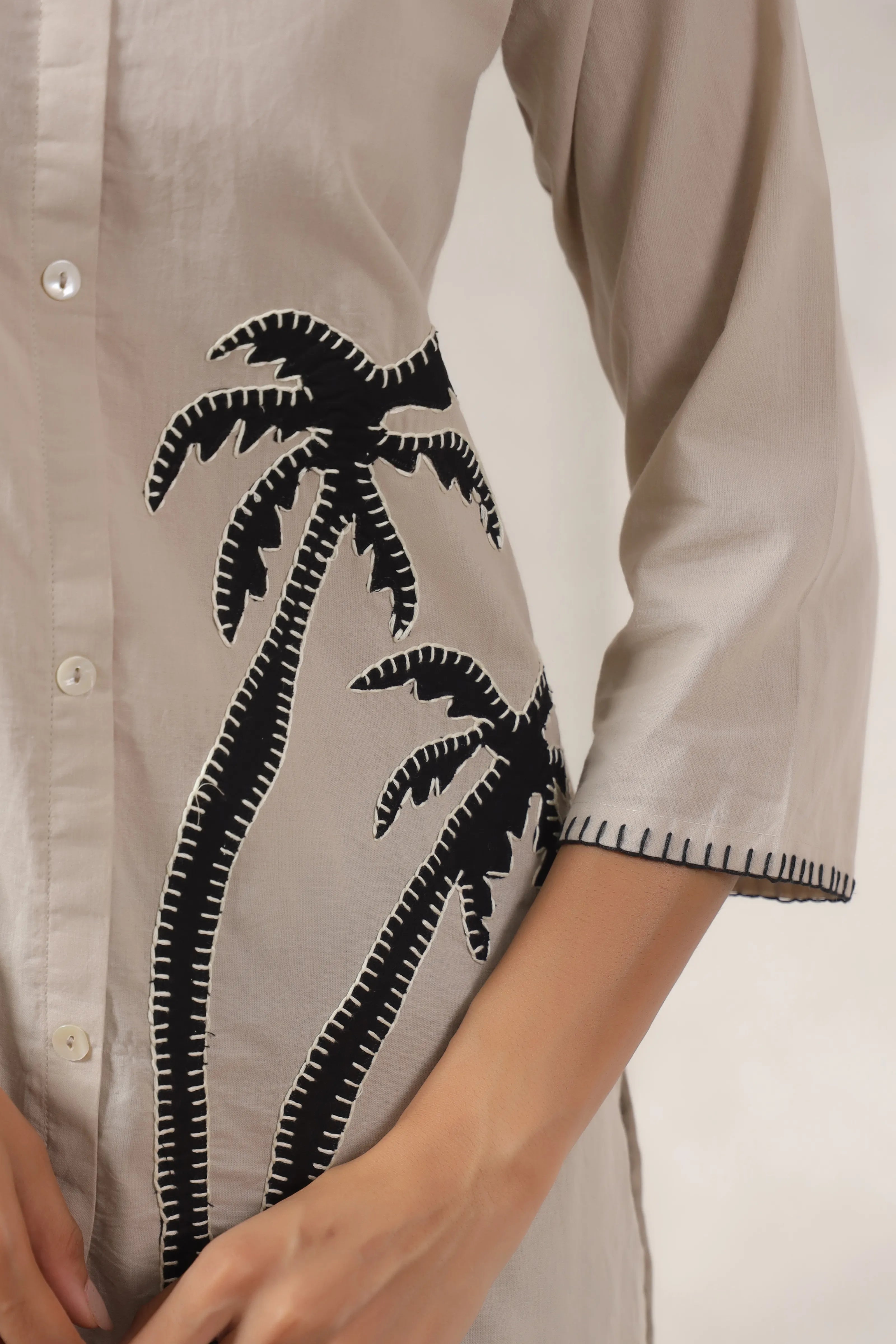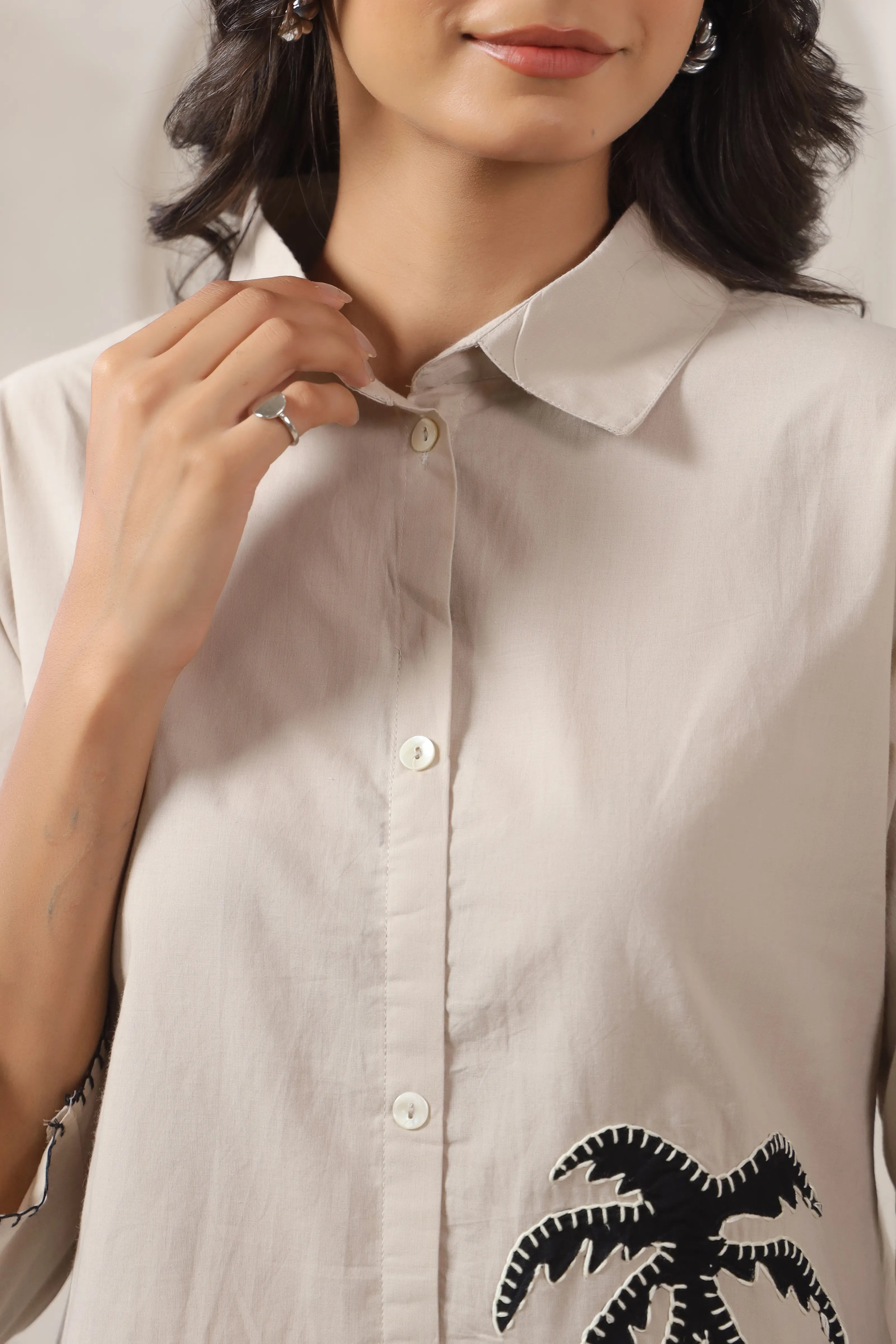 Key Features: • Fabric: Premium cotton cambric – lightweight and breezy • Color: Neutral beige with black palm patch detailing • Design Elements: Blanket-stitched palm appliqué, contrast cuff stitch, shell buttons • Neckline: Smart shirt collar • Sleeves: 3/4th sleeves with turned cuff detailing • Fit: Relaxed fit for all-day comfort