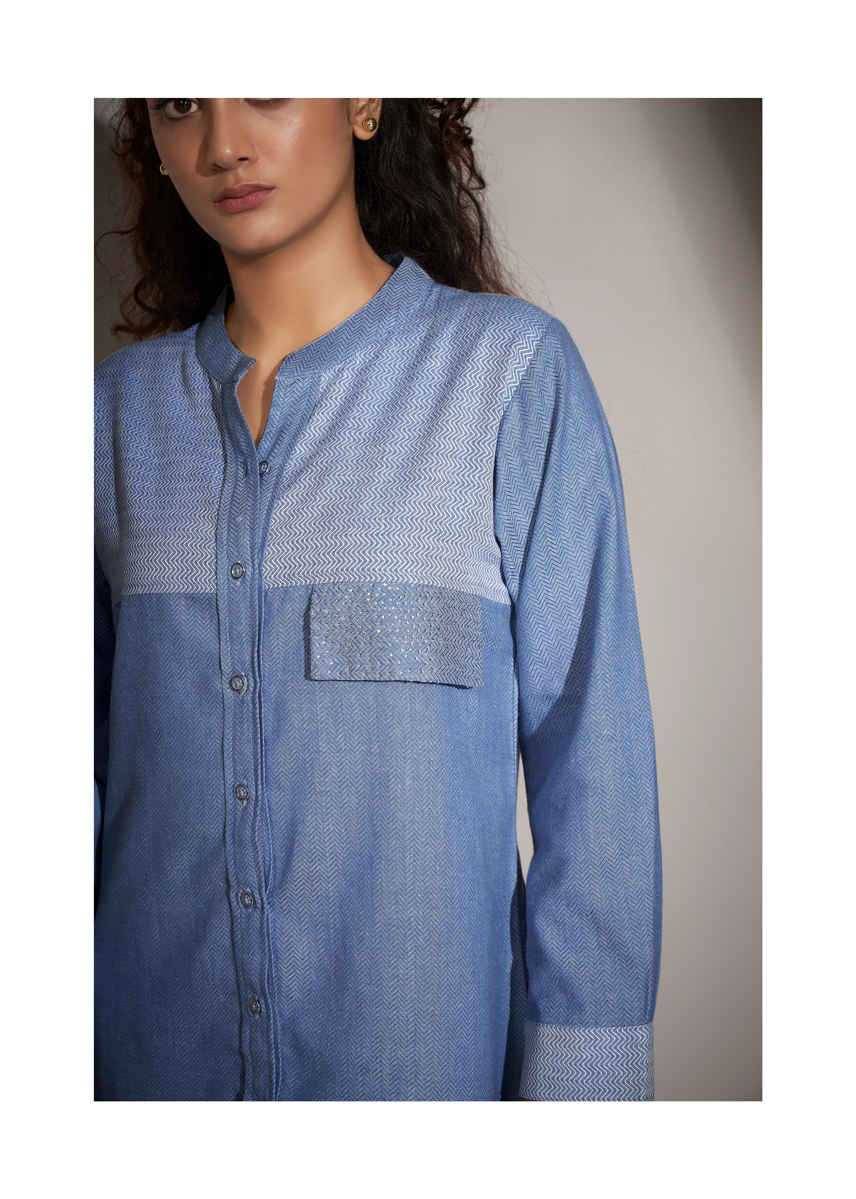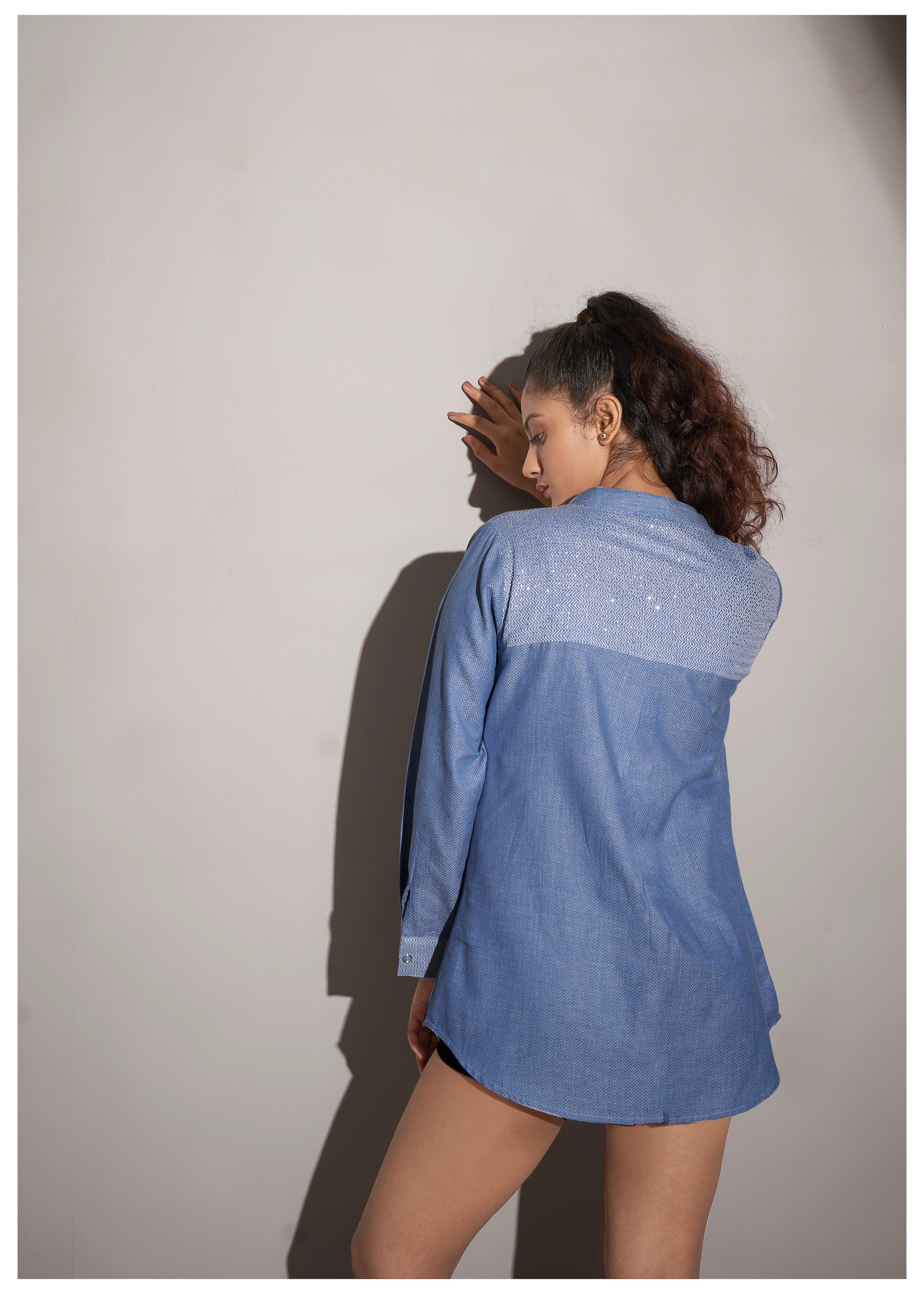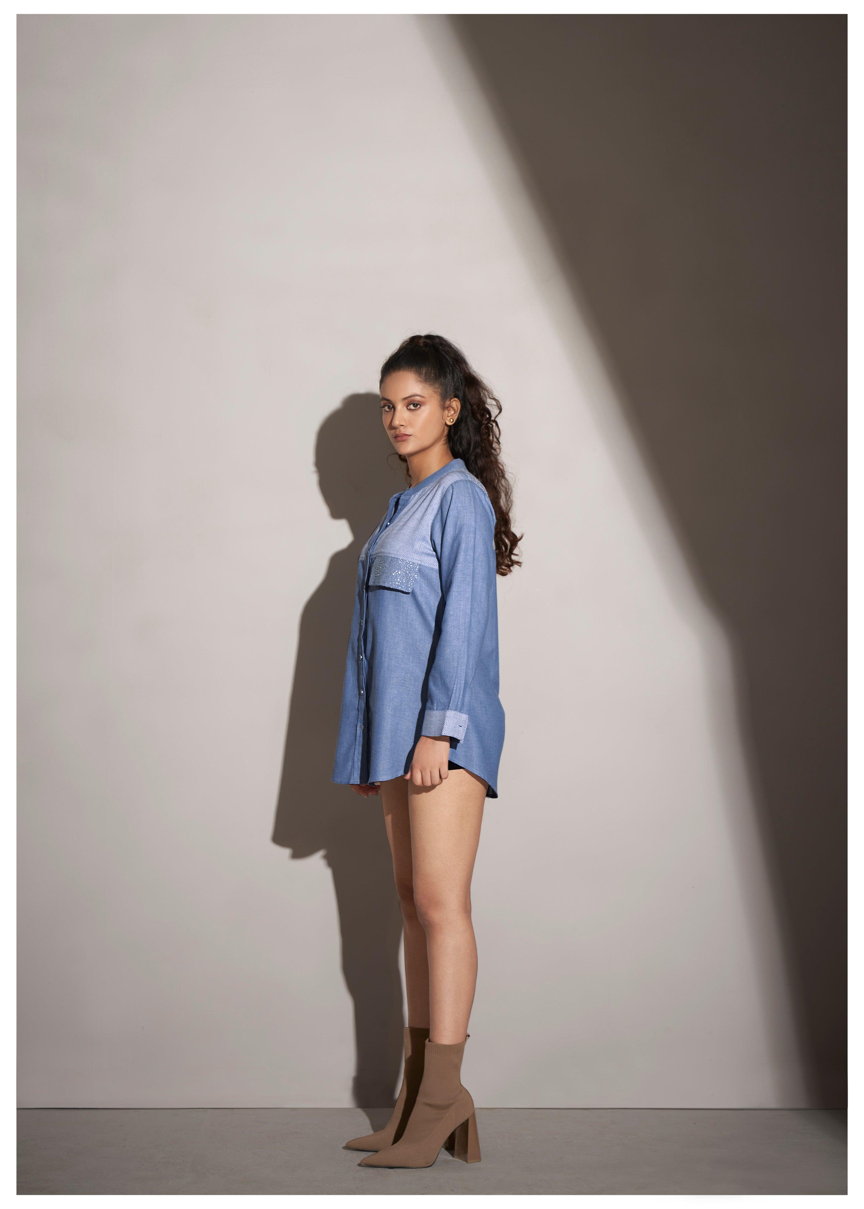 Elevate your casual style with this blue cotton twill weave shirt, adorned with rhinestone accents for a modern touch of glamour. The mandarin collar and full sleeves add a sharp, clean look, while the slightly loose fit and curved hem provide ultimate comfort. Crafted from premium cotton poplin, this shirt offers an effortlessly chic vibe for everyday wear.