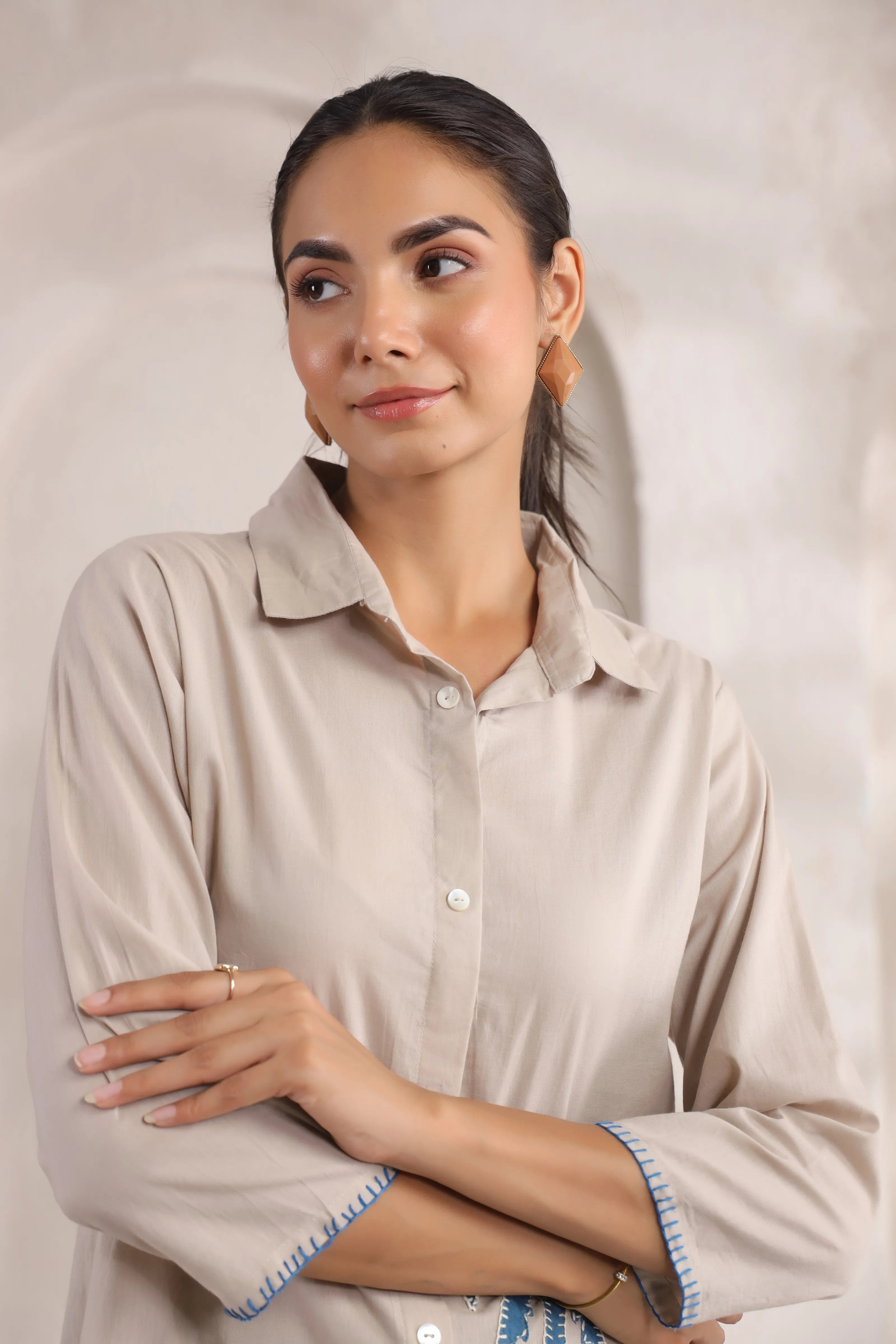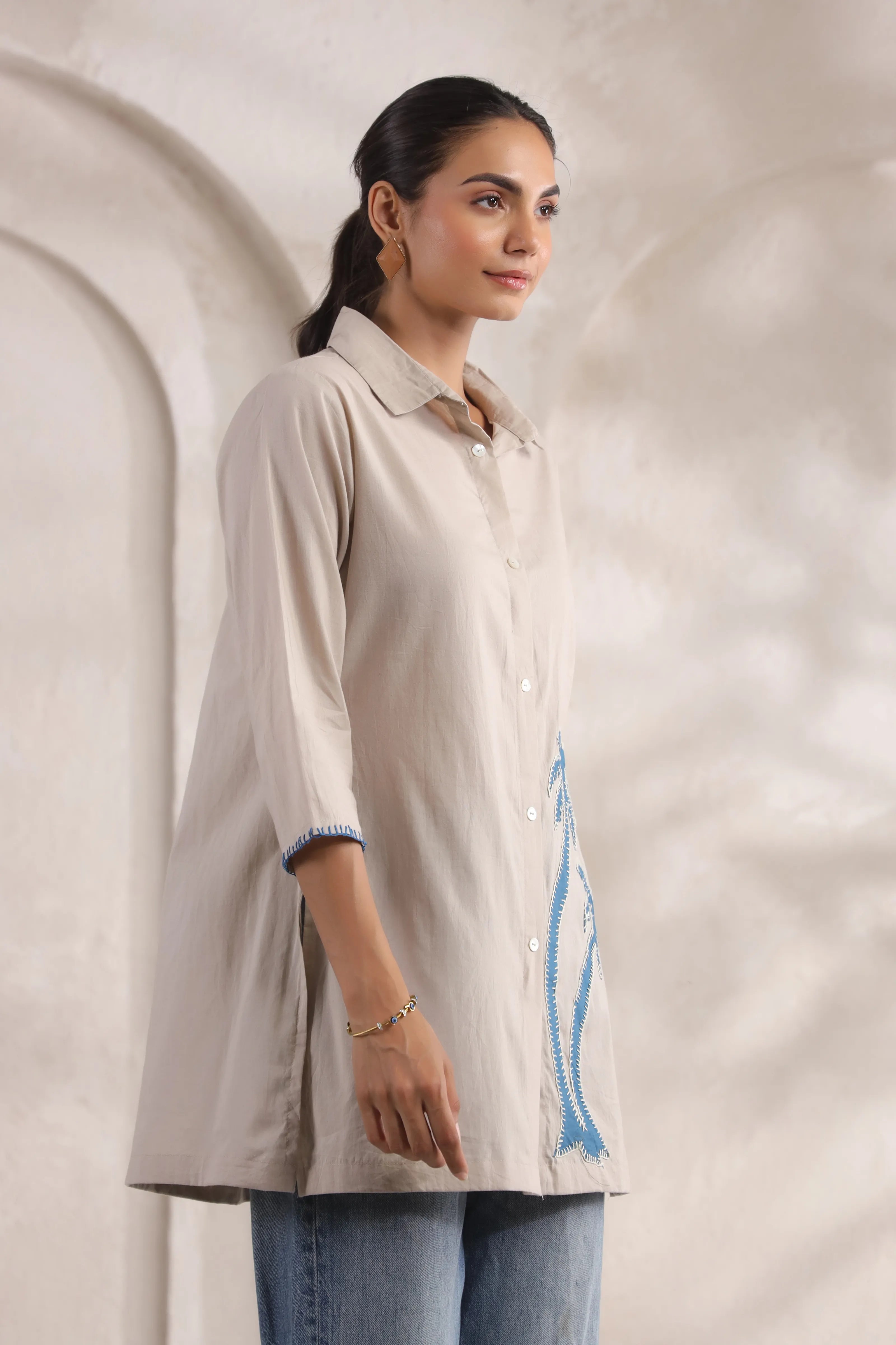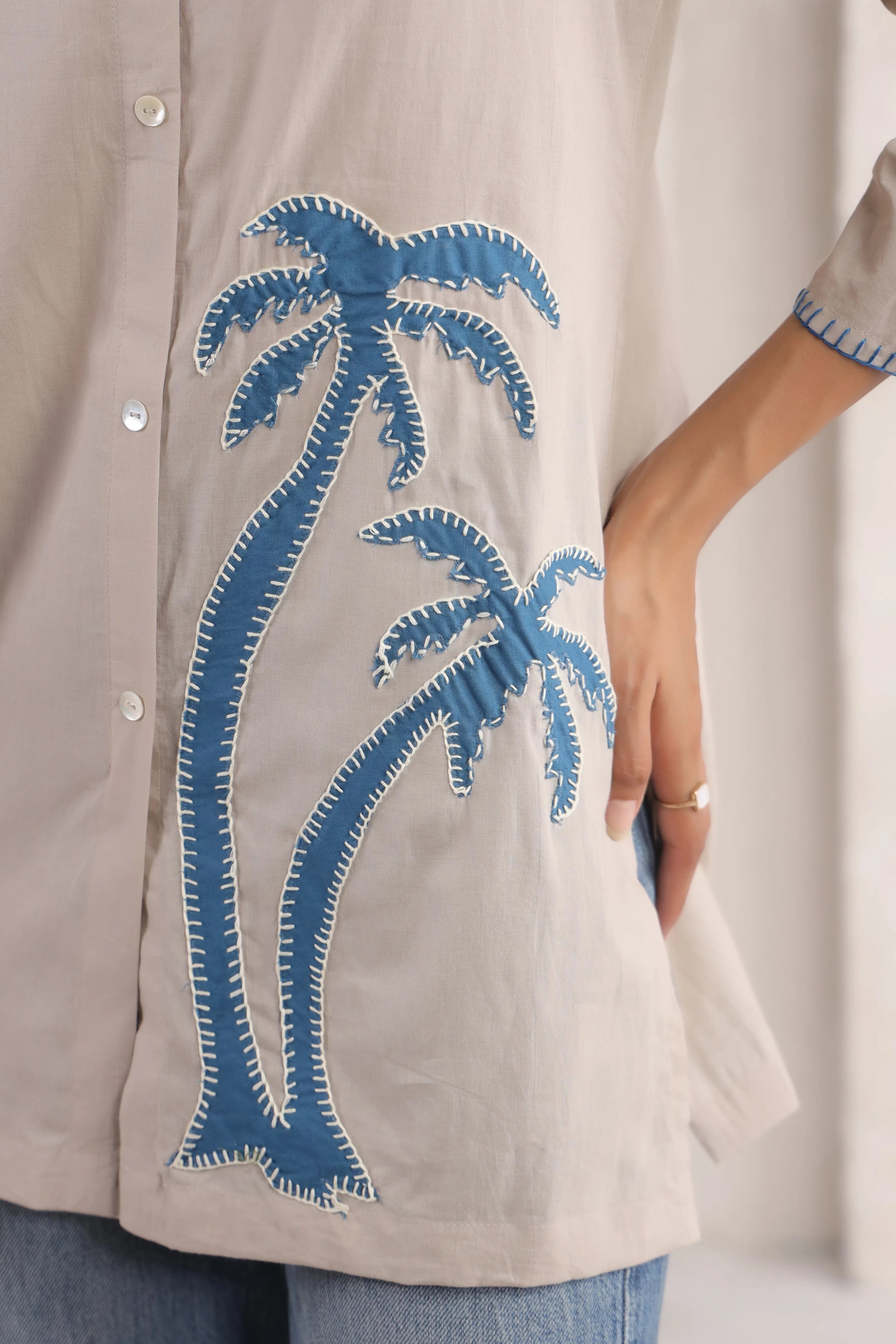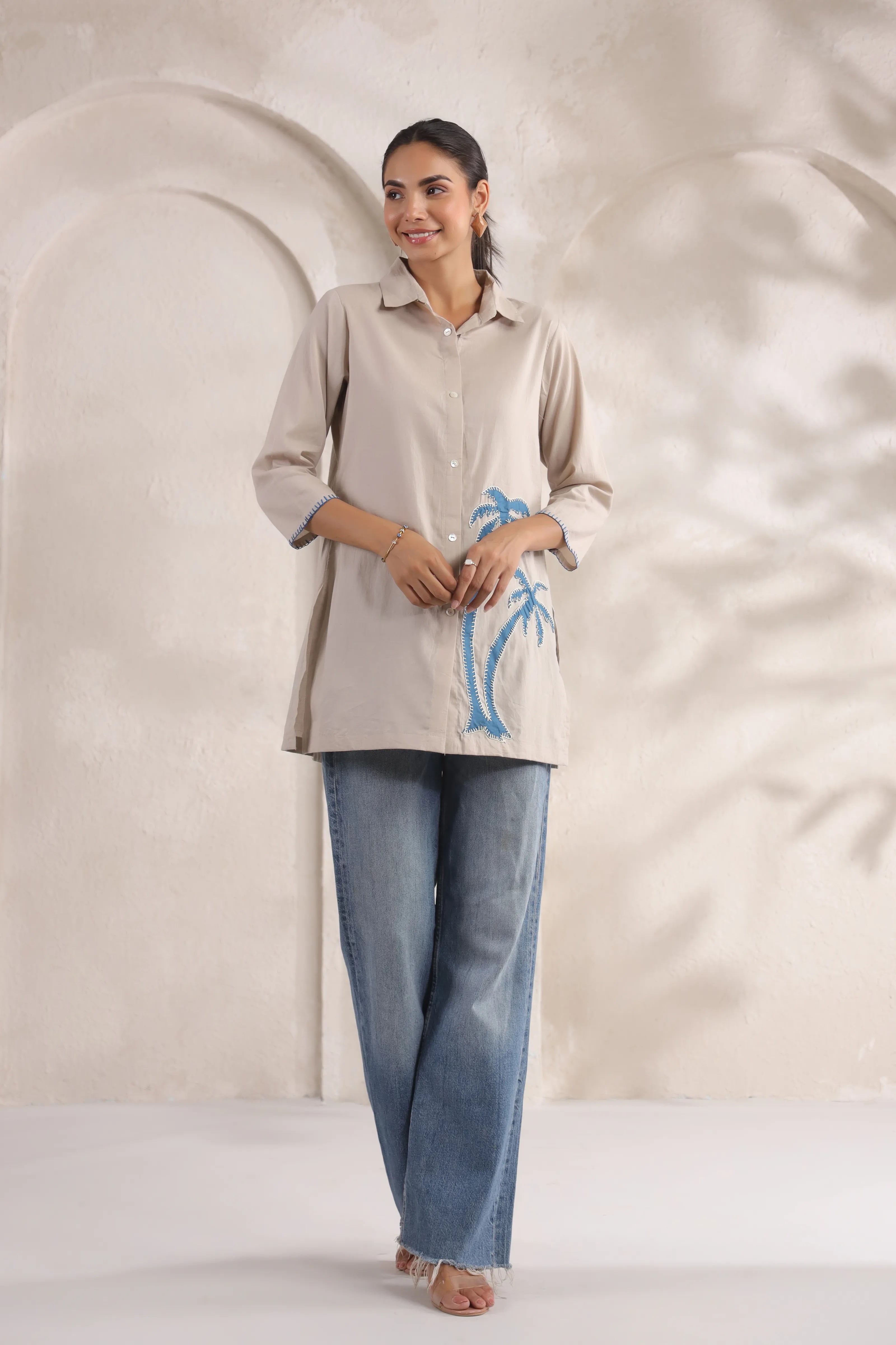 Key Features: • Fabric: Lightweight, soft cotton cambric • Color: Solid beige base with blue palm tree motif • Details: Blanket stitch applique, shell buttons, contrast cuff edging • Neckline: Shirt collar with button-down front • Sleeves: 3/4th sleeves • Fit: Relaxed, everyday silhouette