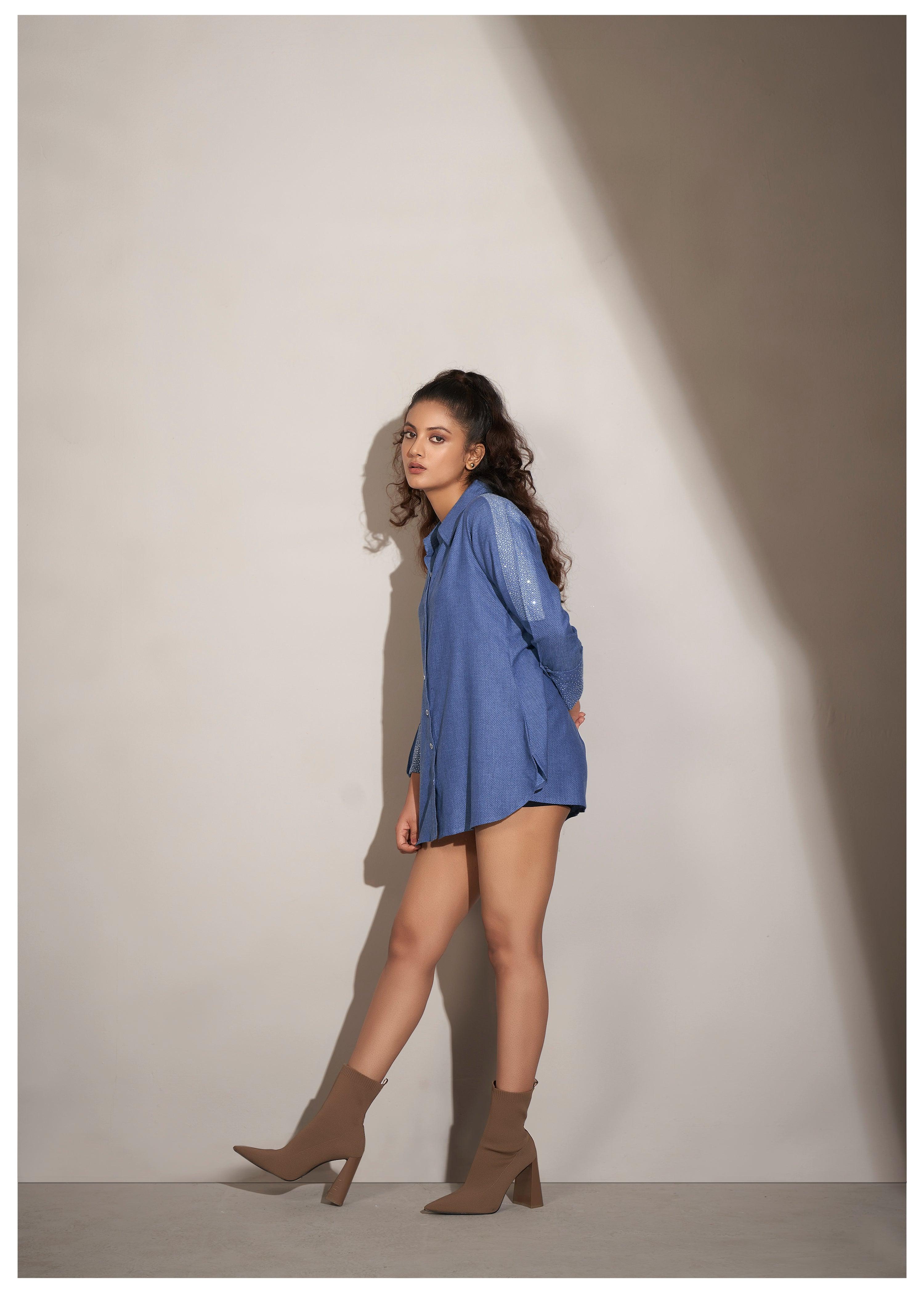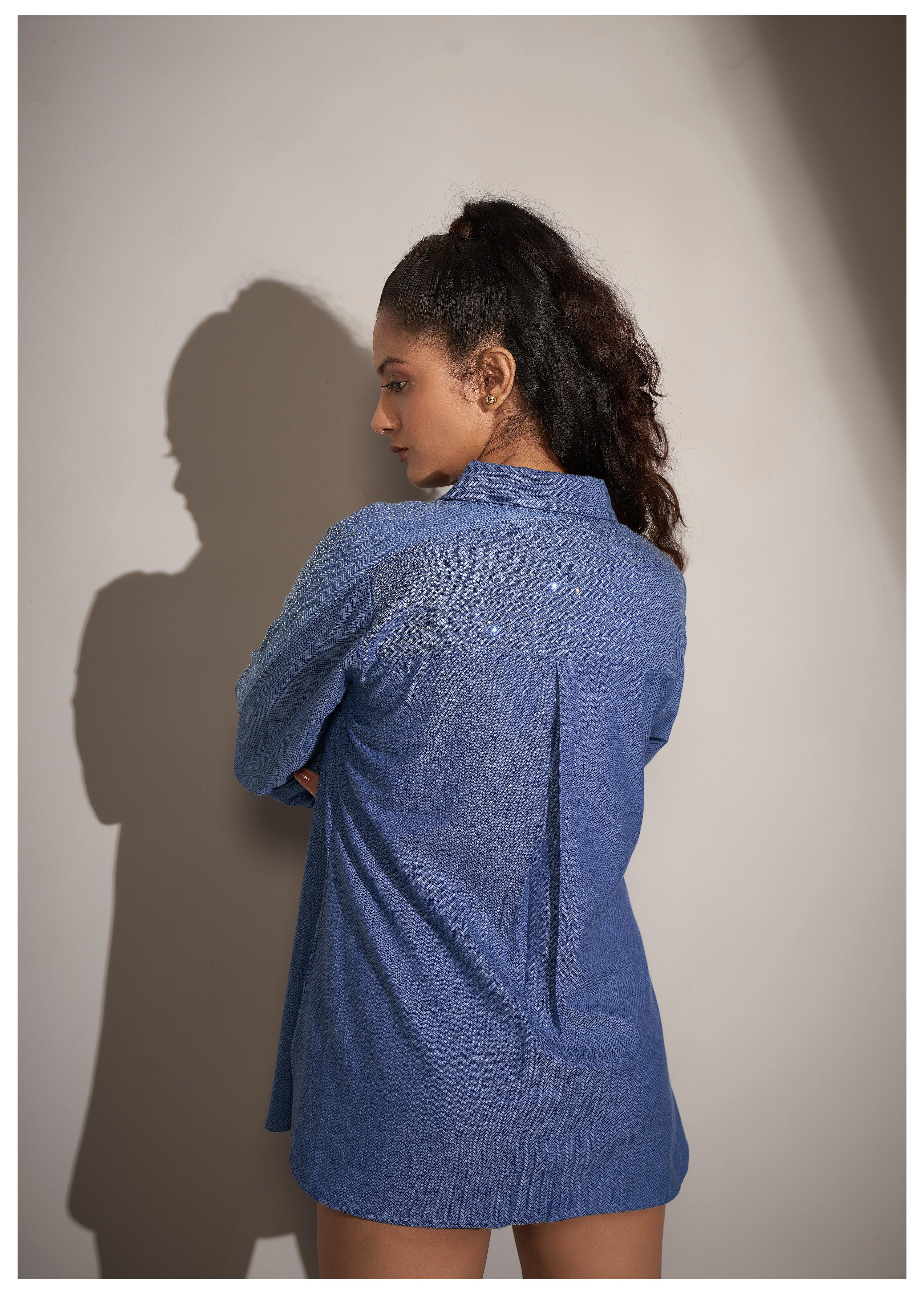 Modern & Sleek: Blue Twill Weave Textured Cotton Shirt with Rhinestone Details