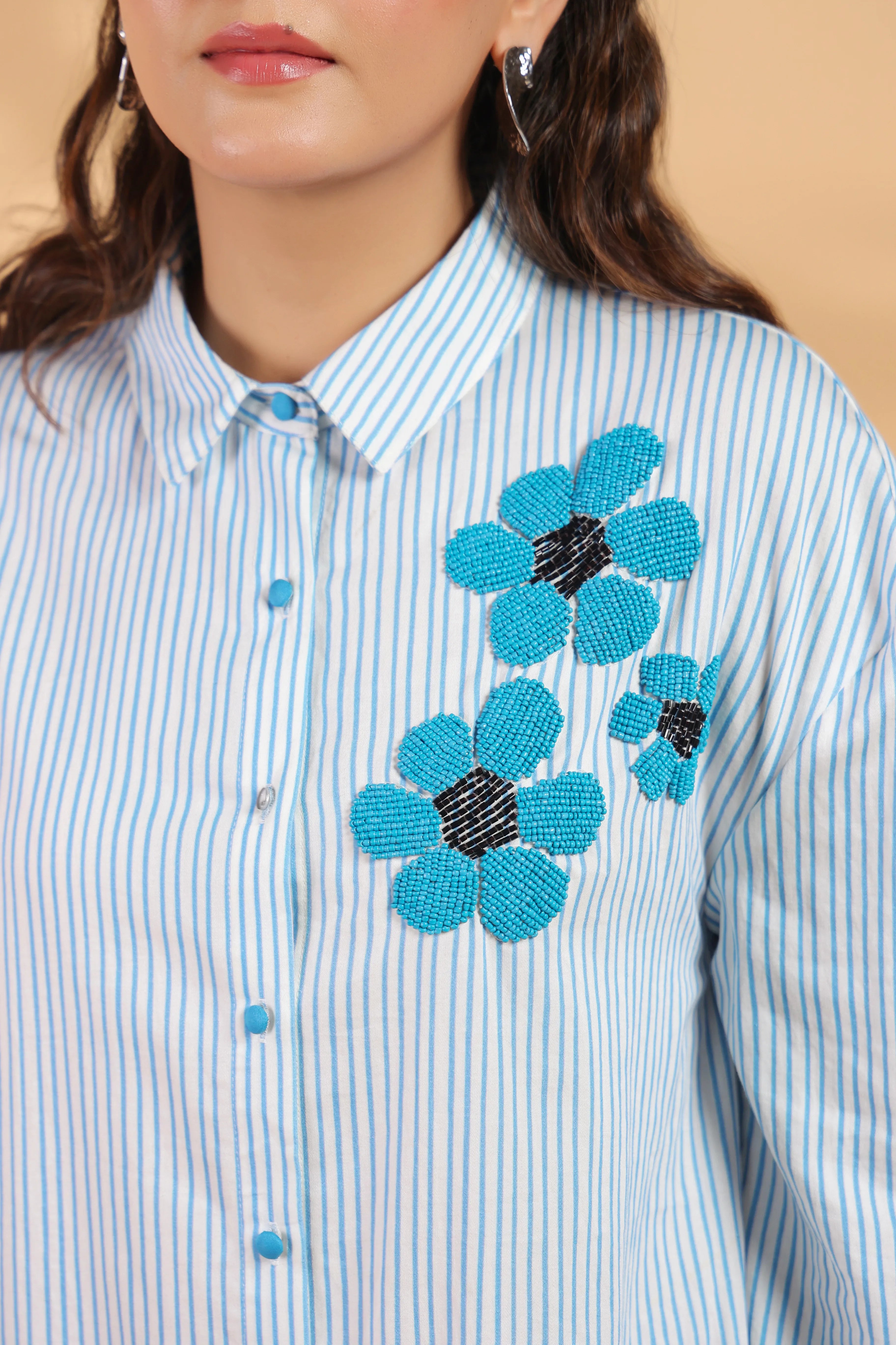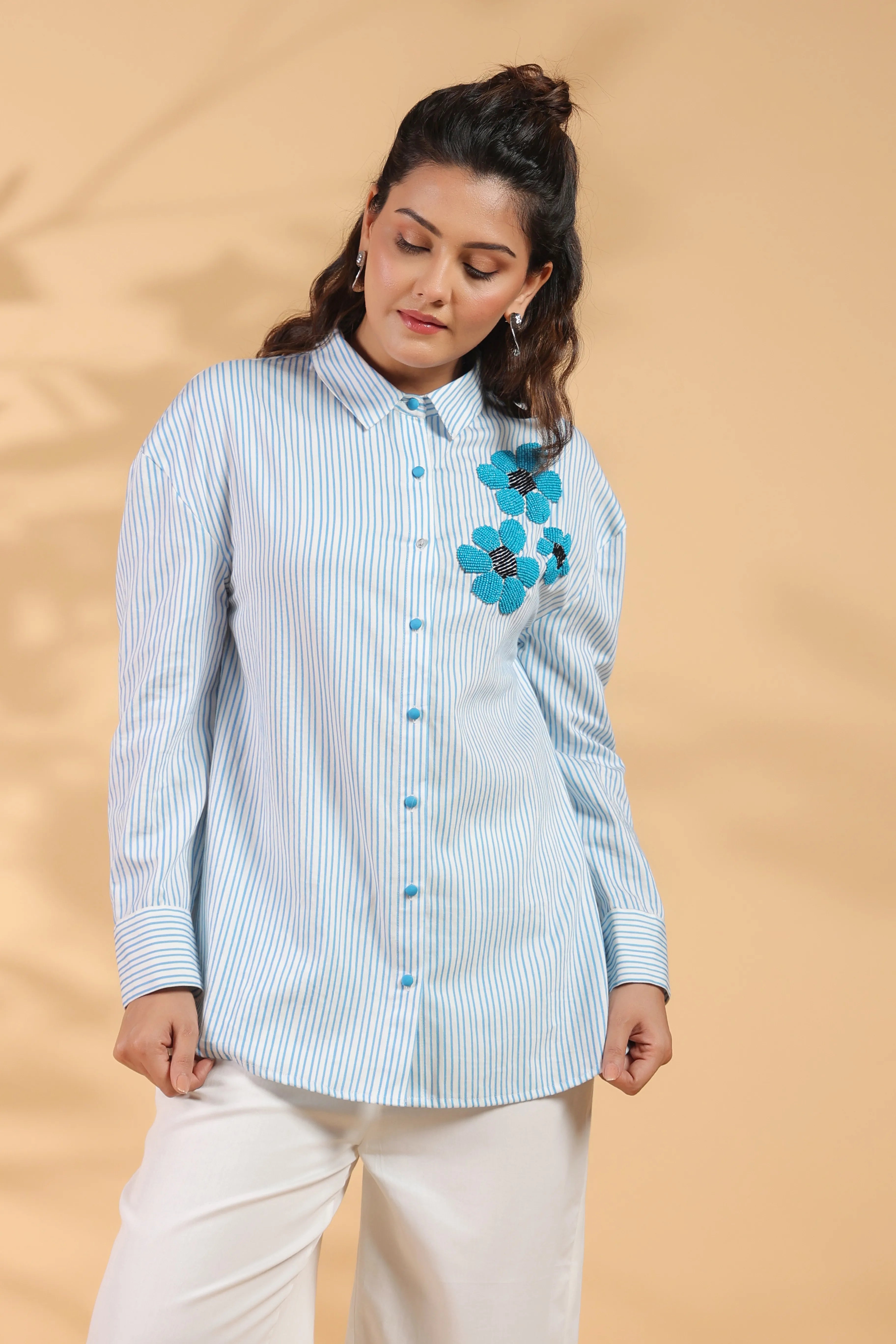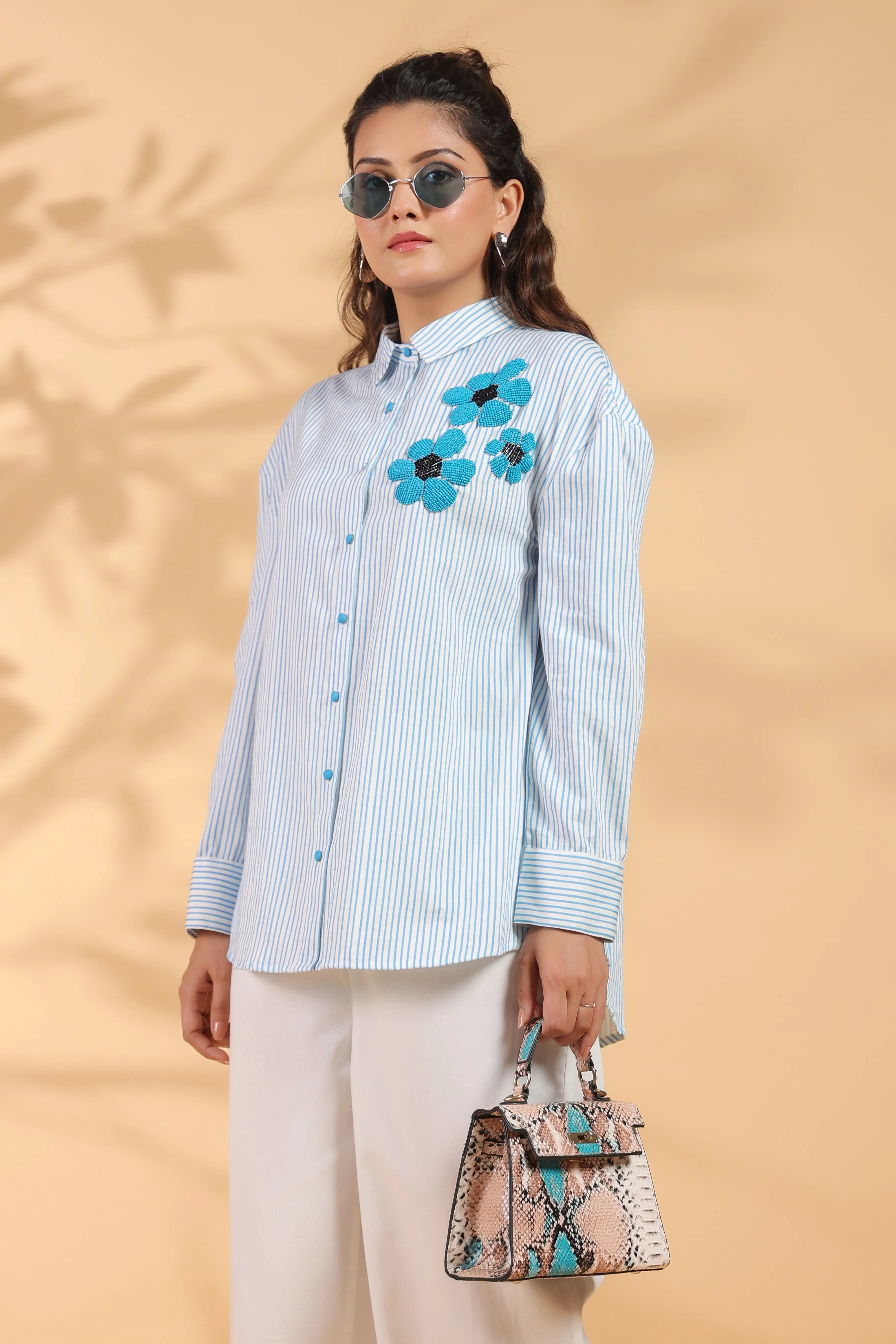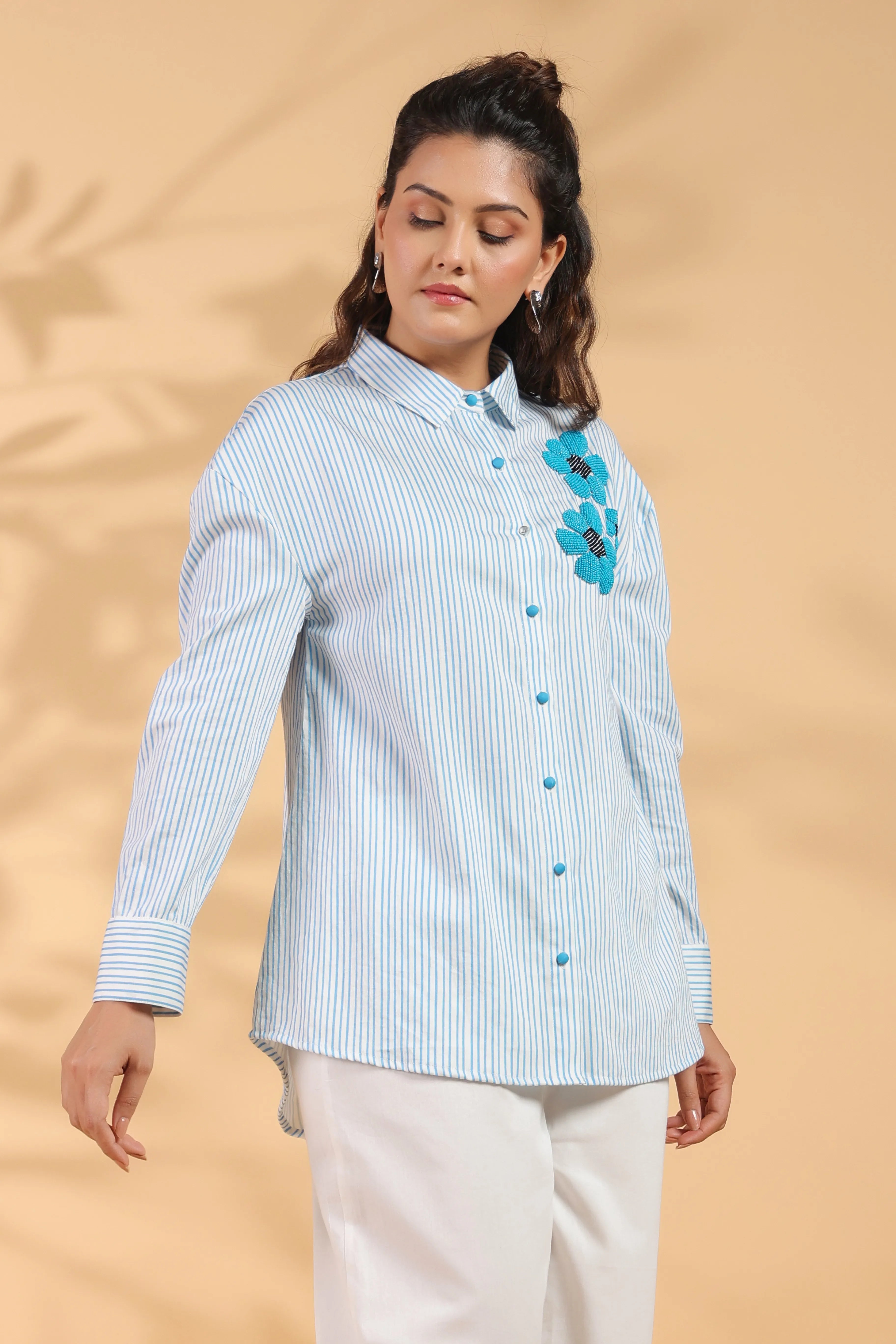 Blue & White Stripe Cotton Beaded Flower Embroidered Shirt