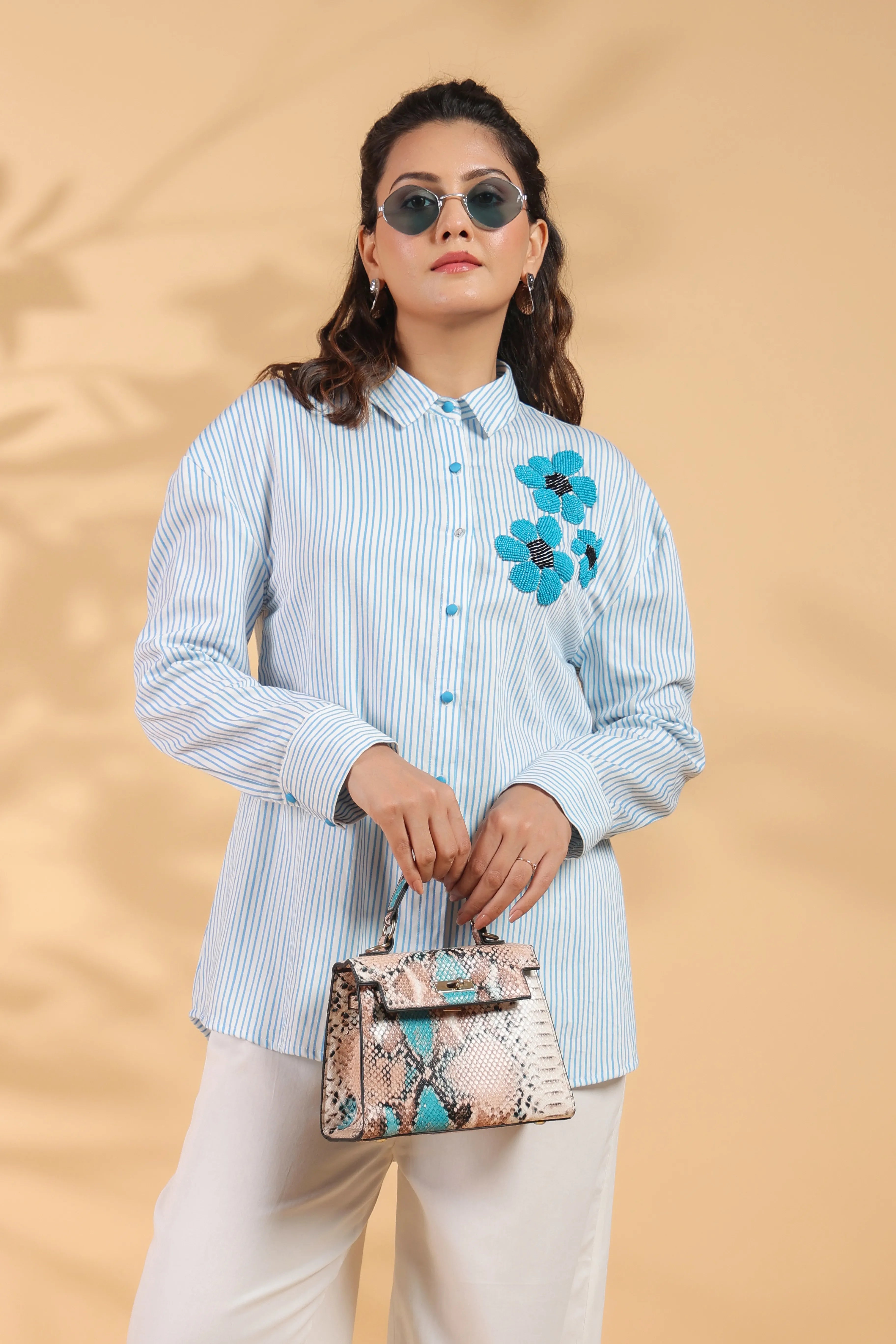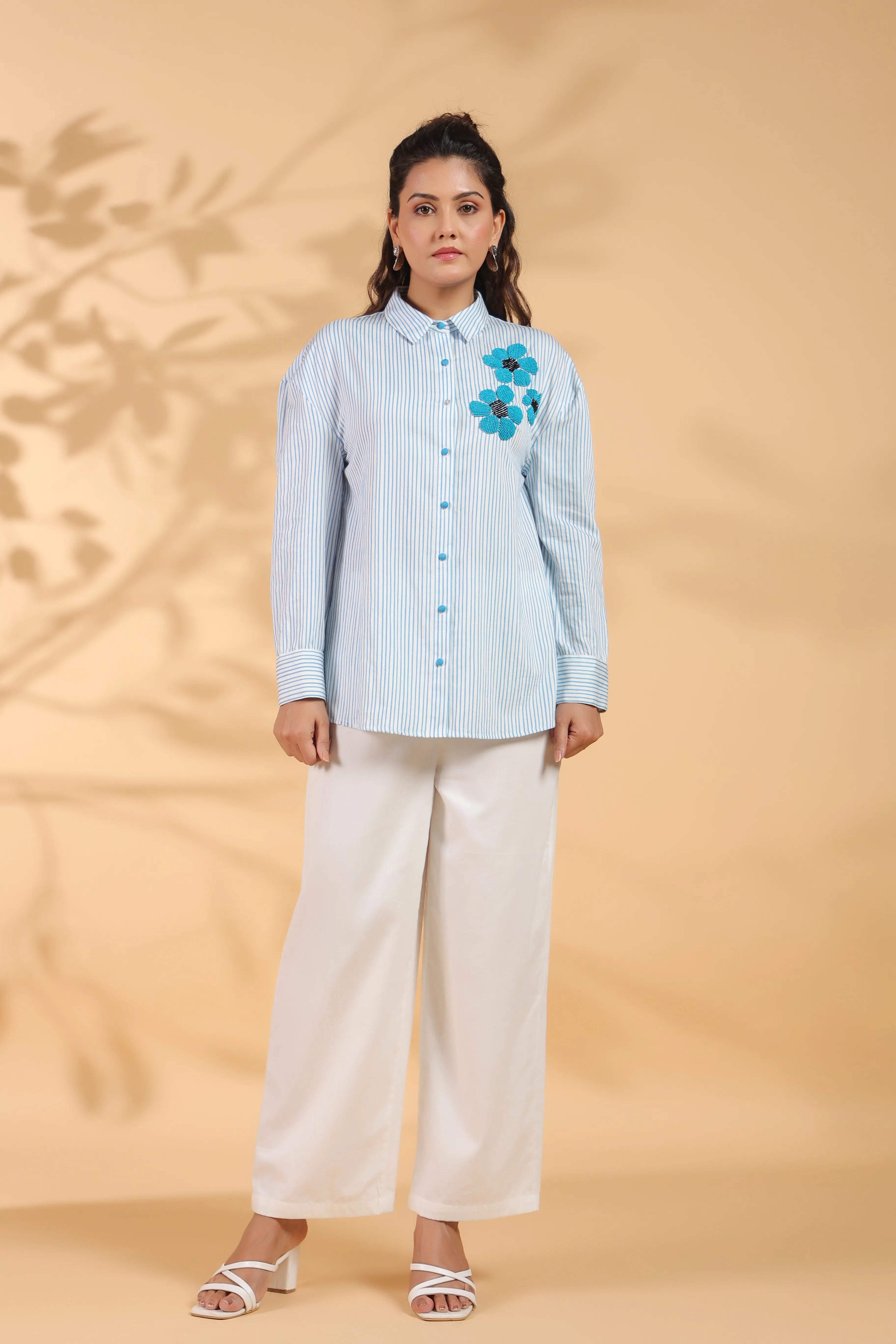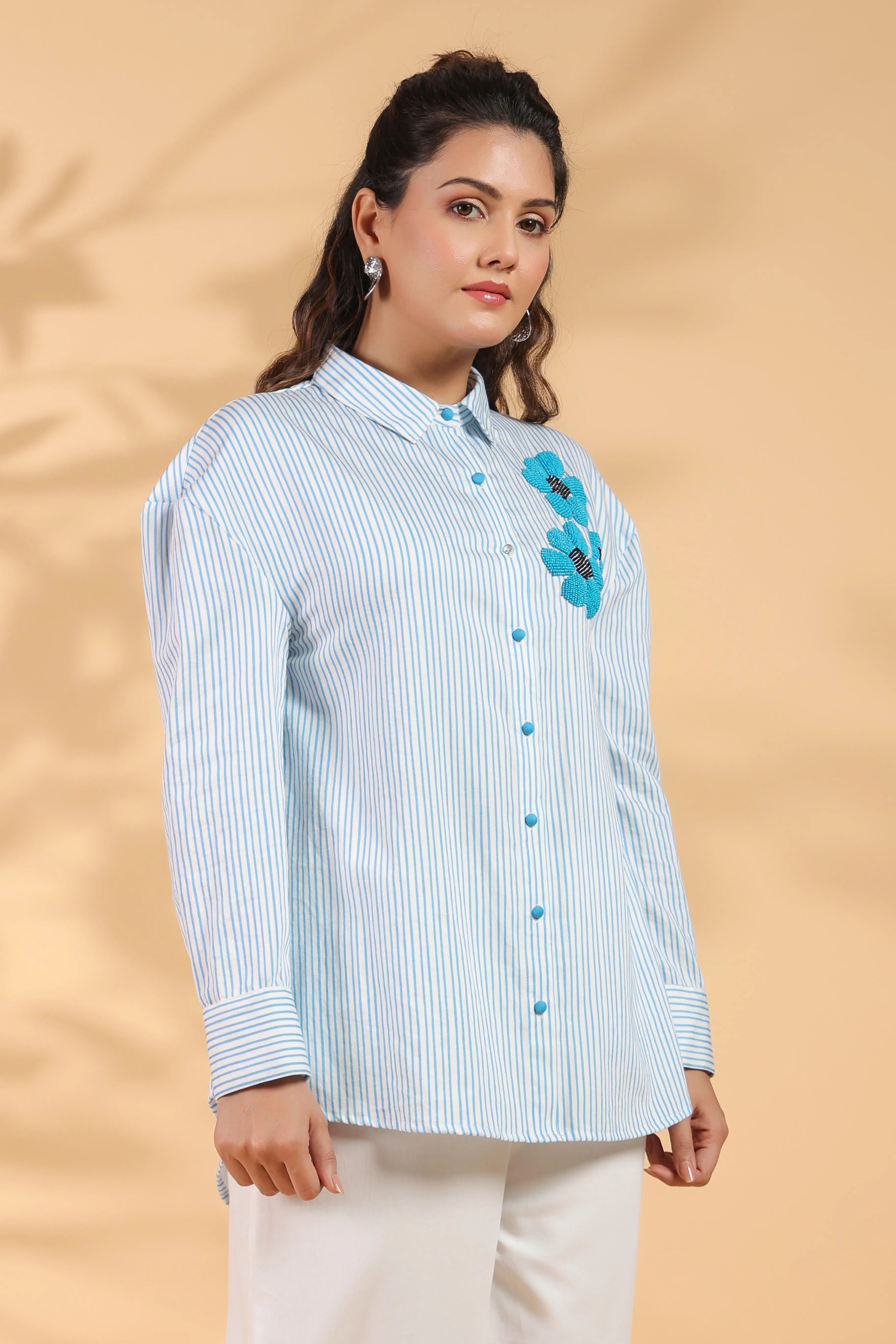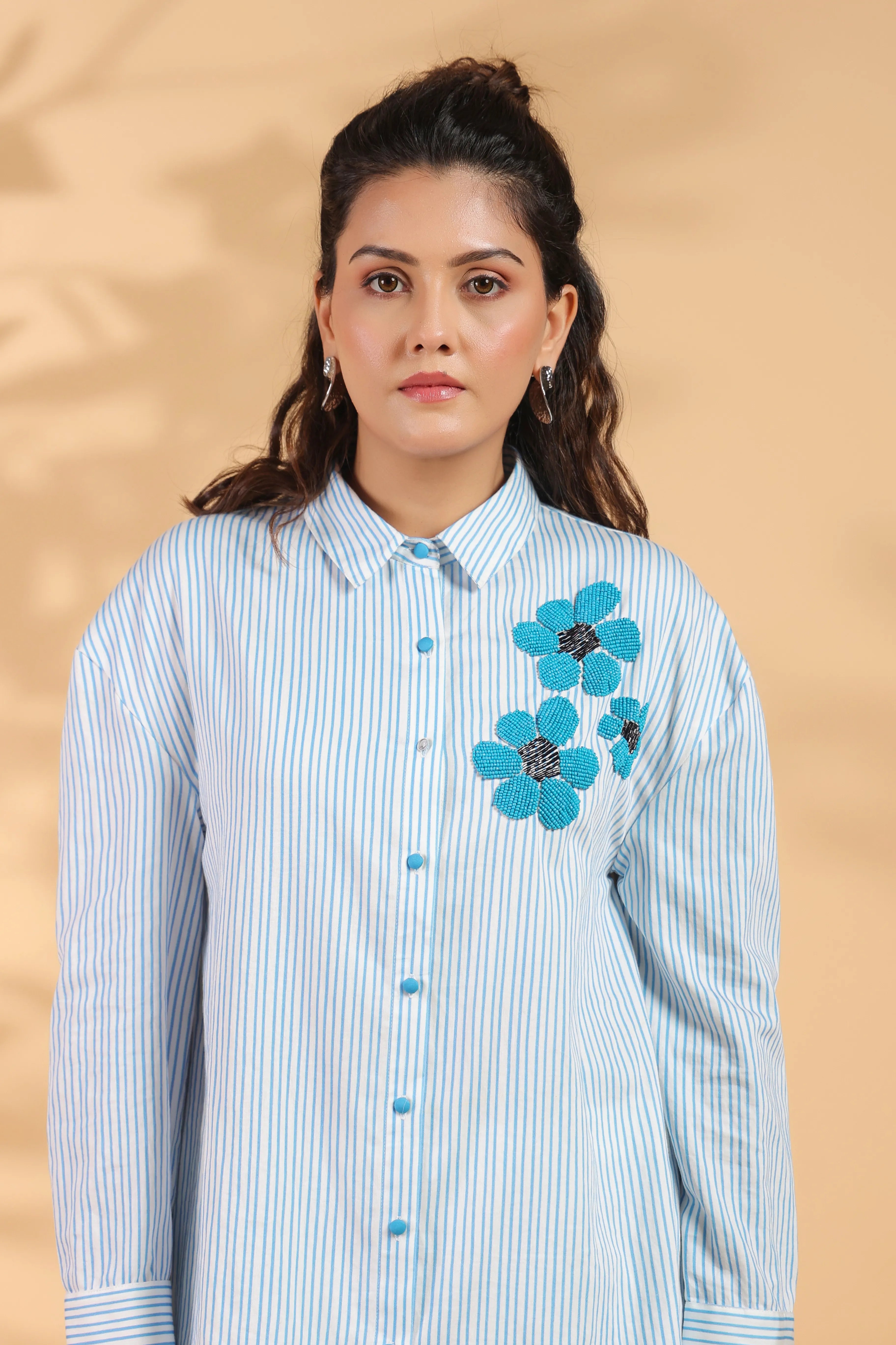 Blue & White Stripe Cotton Beaded Flower Embroidered Shirt