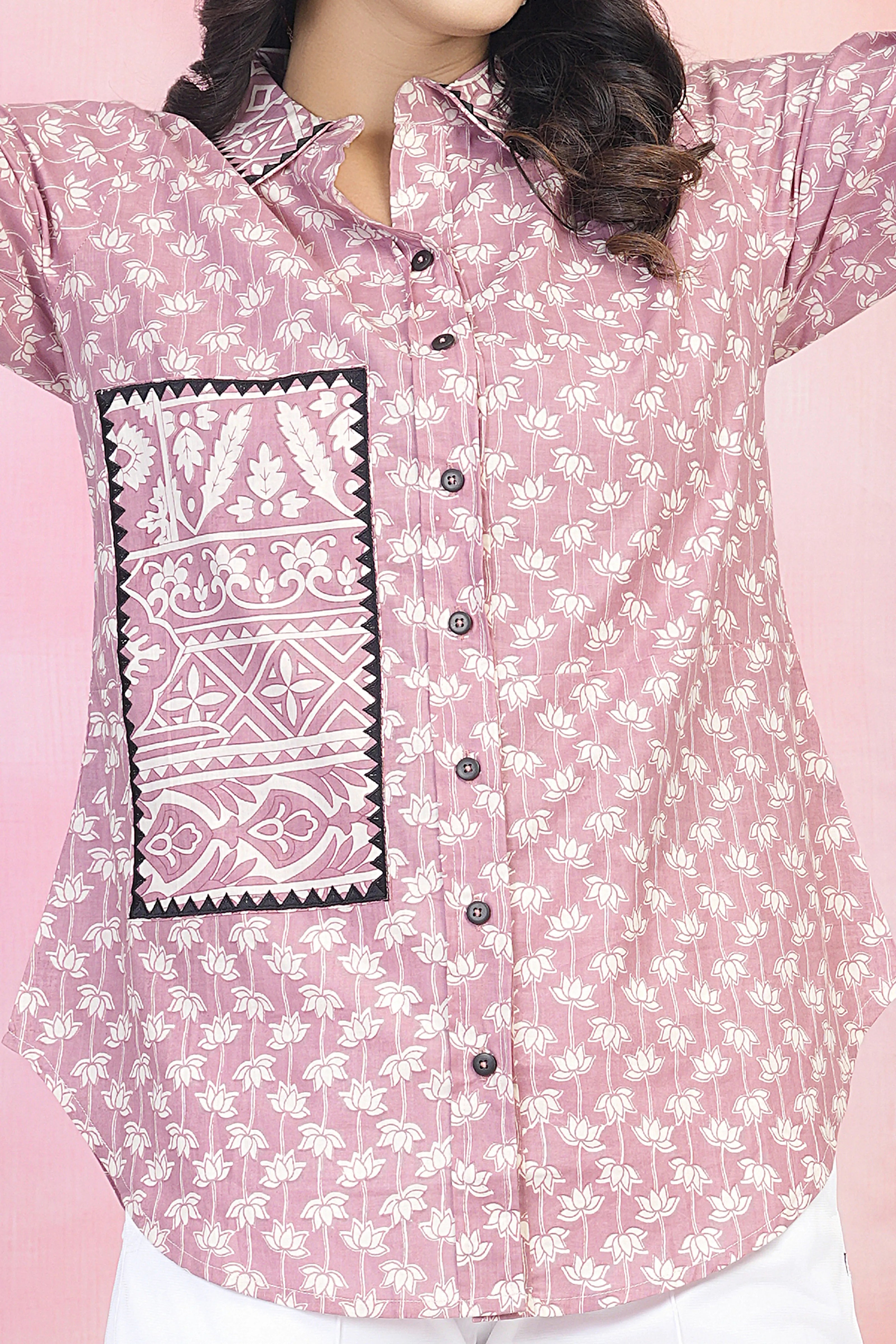 Add a soft, feminine touch to your wardrobe with this Dusty Pink Shirt crafted in breathable cotton cambric. Designed with a lace-trimmed collar, cuffs, and patch pocket, this button-down shirt brings a graceful twist to everyday styling. The round hemline adds to its relaxed yet tailored appeal.