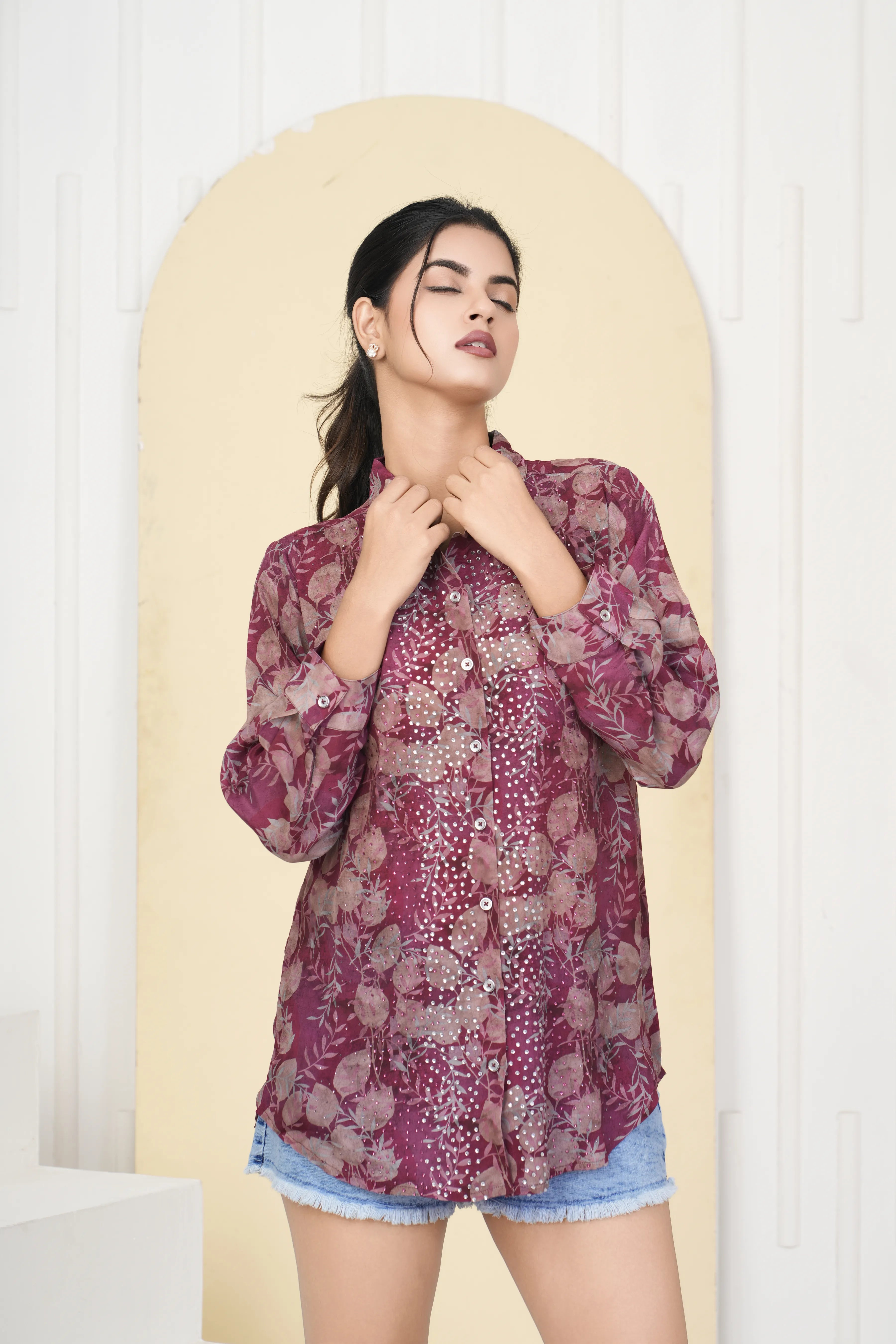Featuring full sleeves, a classic button-front closure, and all-over print, this shirt is elevated with delicate rhinestone detailing, adding a subtle shimmer to its bold and lively hue. Whether you're dressing up for a casual day out or a polished evening look, this versatile piece is a must-have.