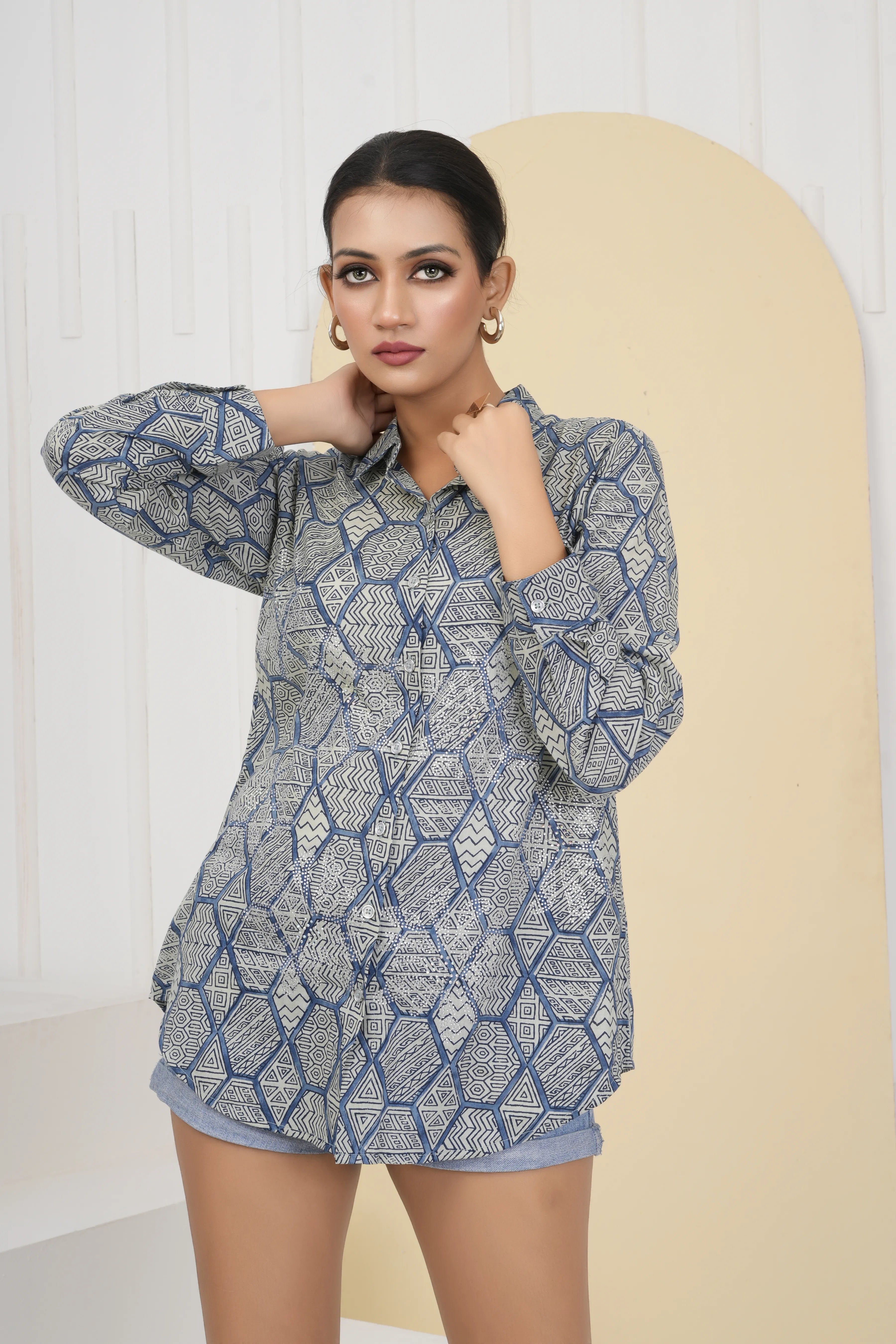 Add a touch of modern elegance to your wardrobe with this Geometric Print Cotton Shirt, designed to blend sophistication with a hint of sparkle. Crafted from breathable, soft cotton, this shirt ensures all-day comfort while keeping you effortlessly stylish.