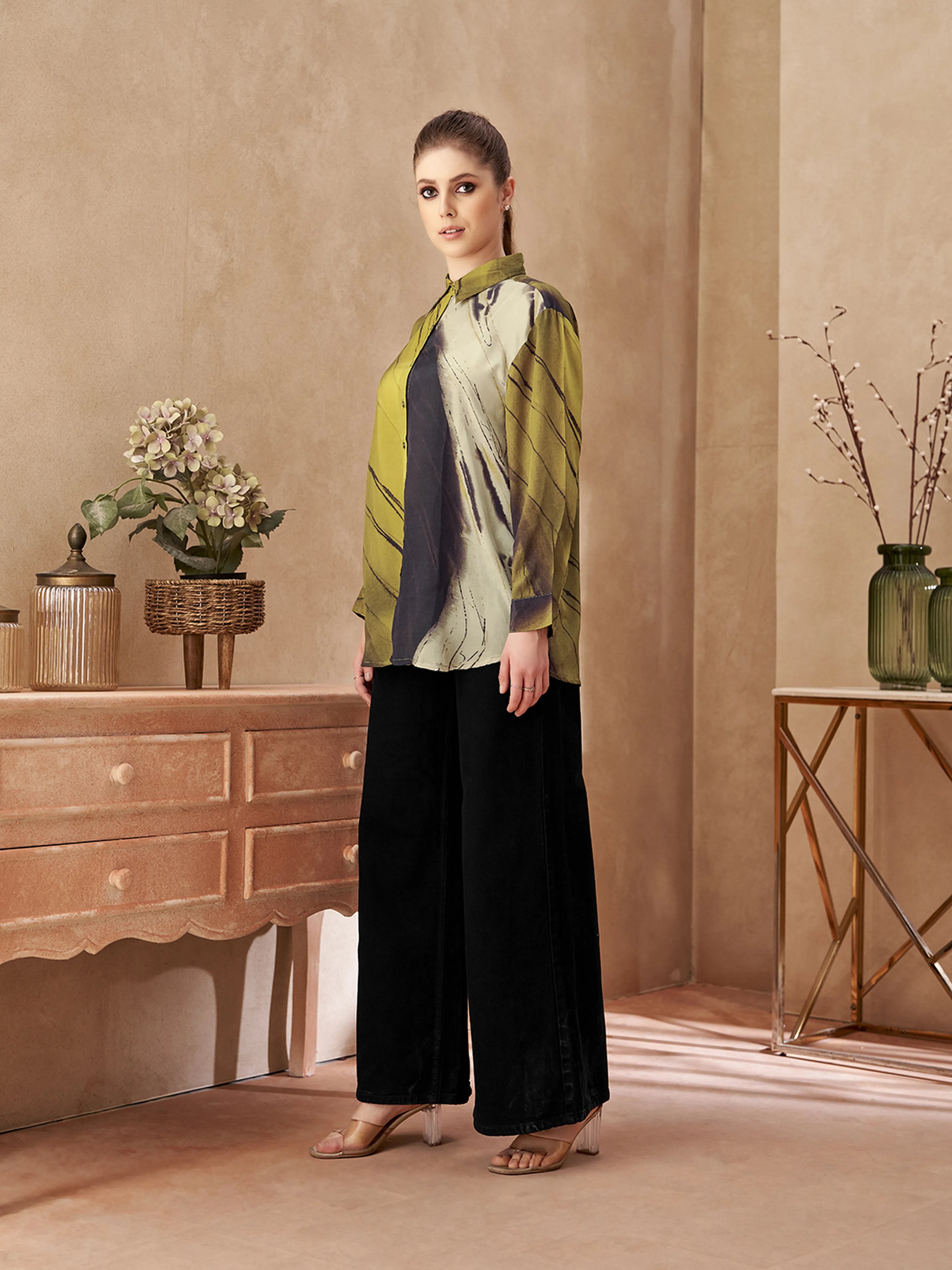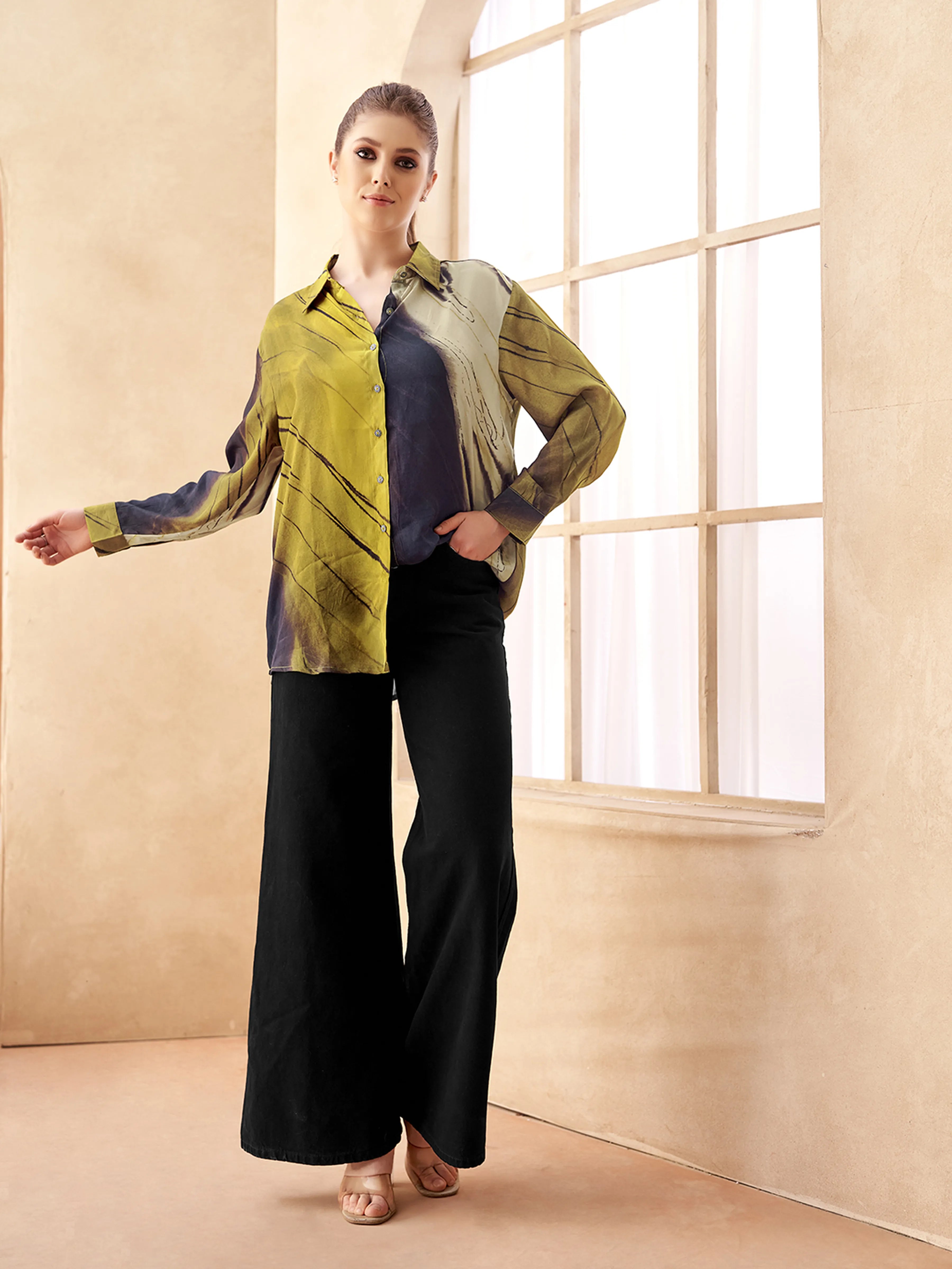 Key Features: • Fabric: Lightweight, premium crepe with a soft sheen • Color: Brown and golden yellow marble-effect pattern • Design: Full sleeves with cuffs, shirt collar, metal button-down fastening • Fit: Relaxed yet structured fit for versatile styling