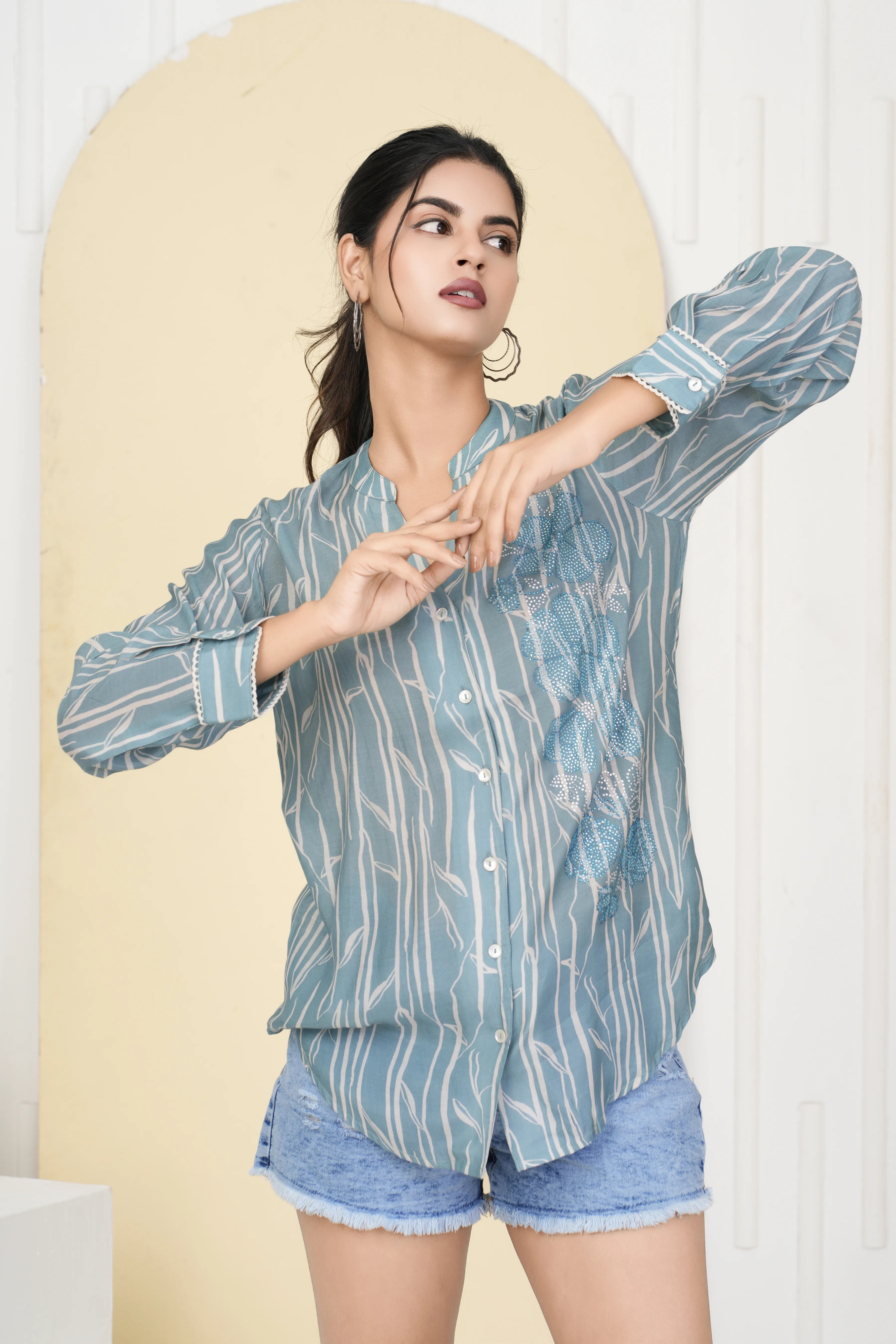 Step into effortless elegance with this Ice Blue Printed Shirt, designed with a mandarin collar and delicate rhinestone embellishments for a refined touch. The floral motif print, paired with shell buttons and lace detailing, creates a look that is both sophisticated and feminine. Crafted from lightweight viscose fabric, this shirt ensures comfort while maintaining a polished appearance, perfect for both casual and semi-formal settings.