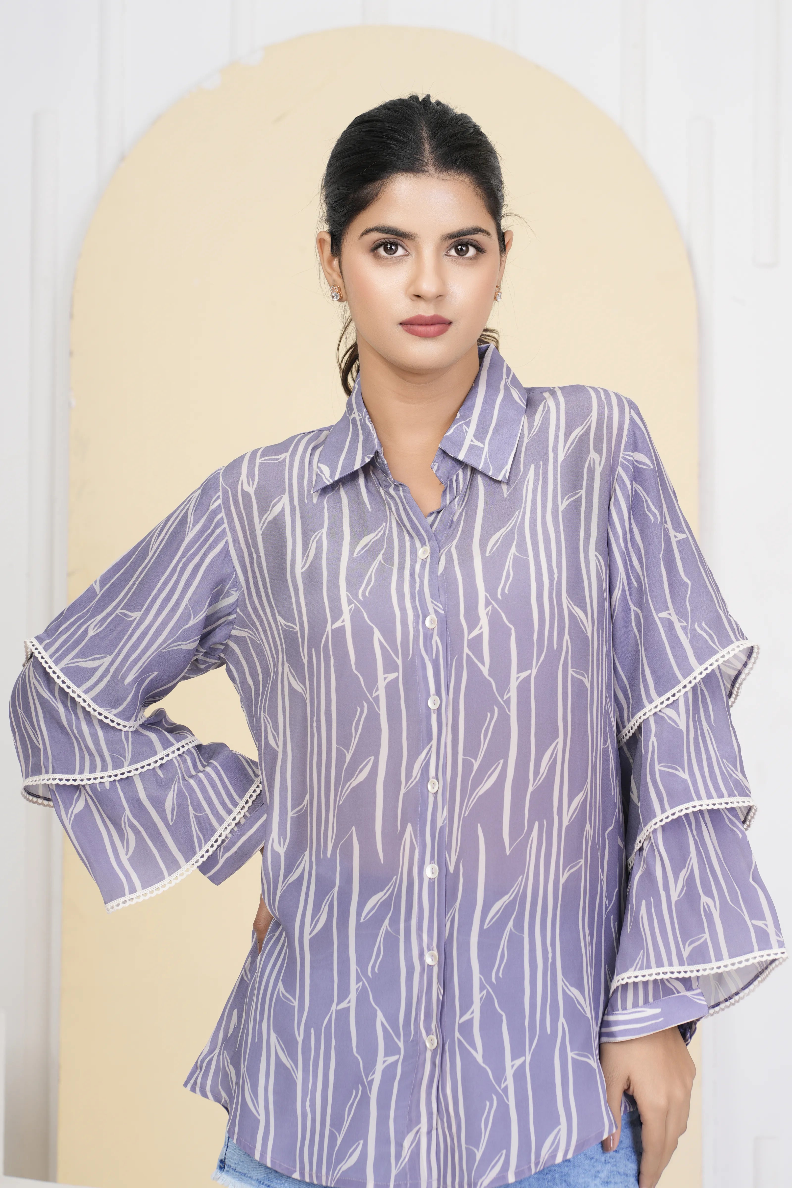 Iris Purple Viscose Flared Shirt with Lace Detailing & Full Sleeves