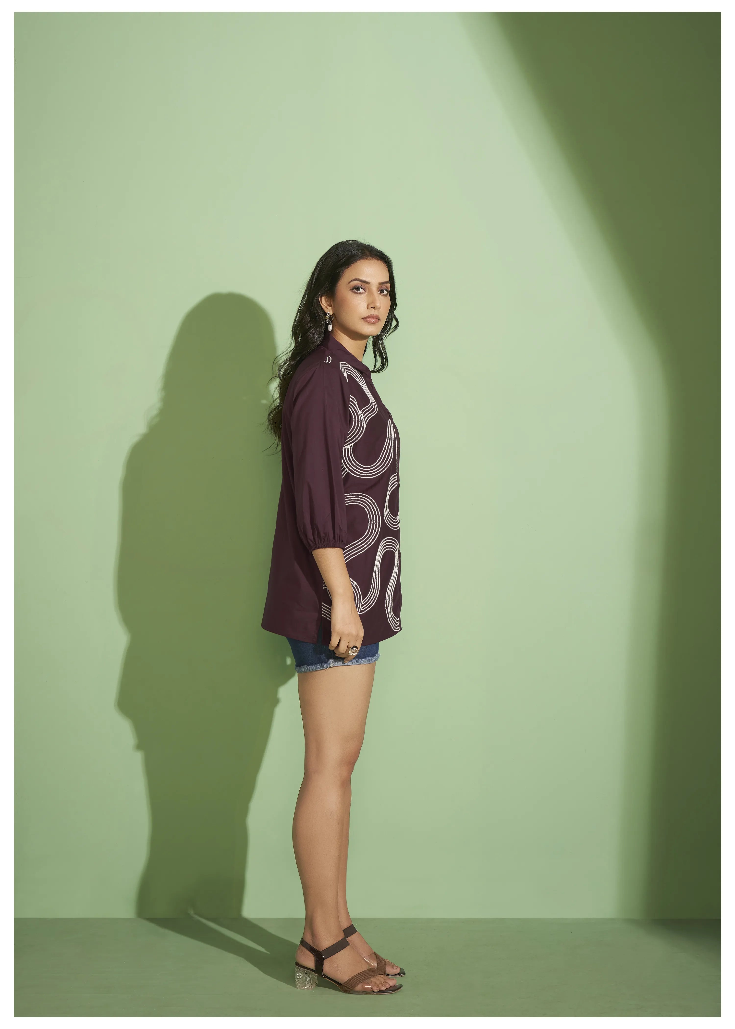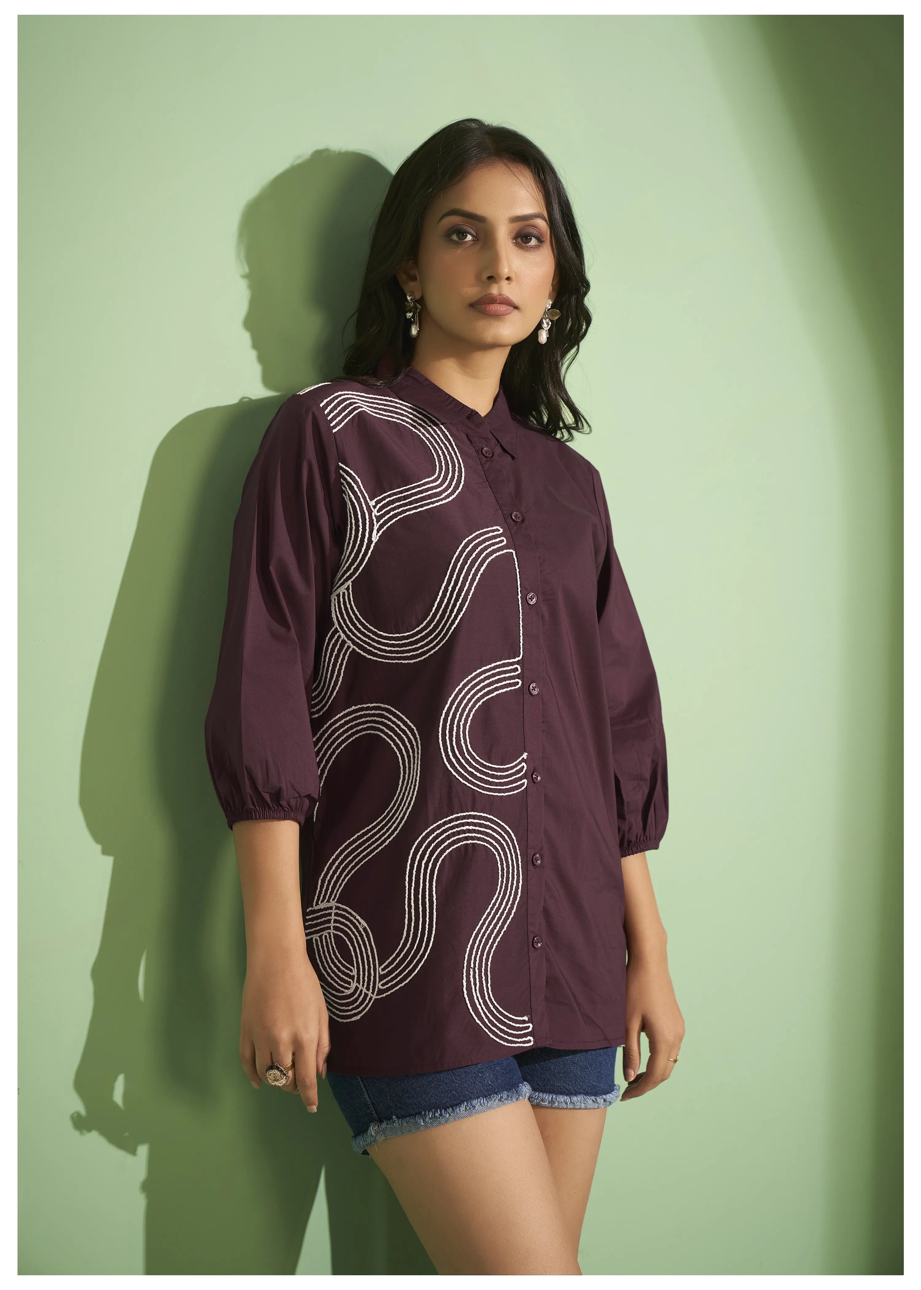 Add a touch of sophistication to your wardrobe with this maroon cotton poplin shirt, beautifully crafted with detailed cord embroidery. The classic collar and 3/4th elasticized sleeves create a flattering silhouette, while the intricate embroidery adds a refined, artistic element to the design.