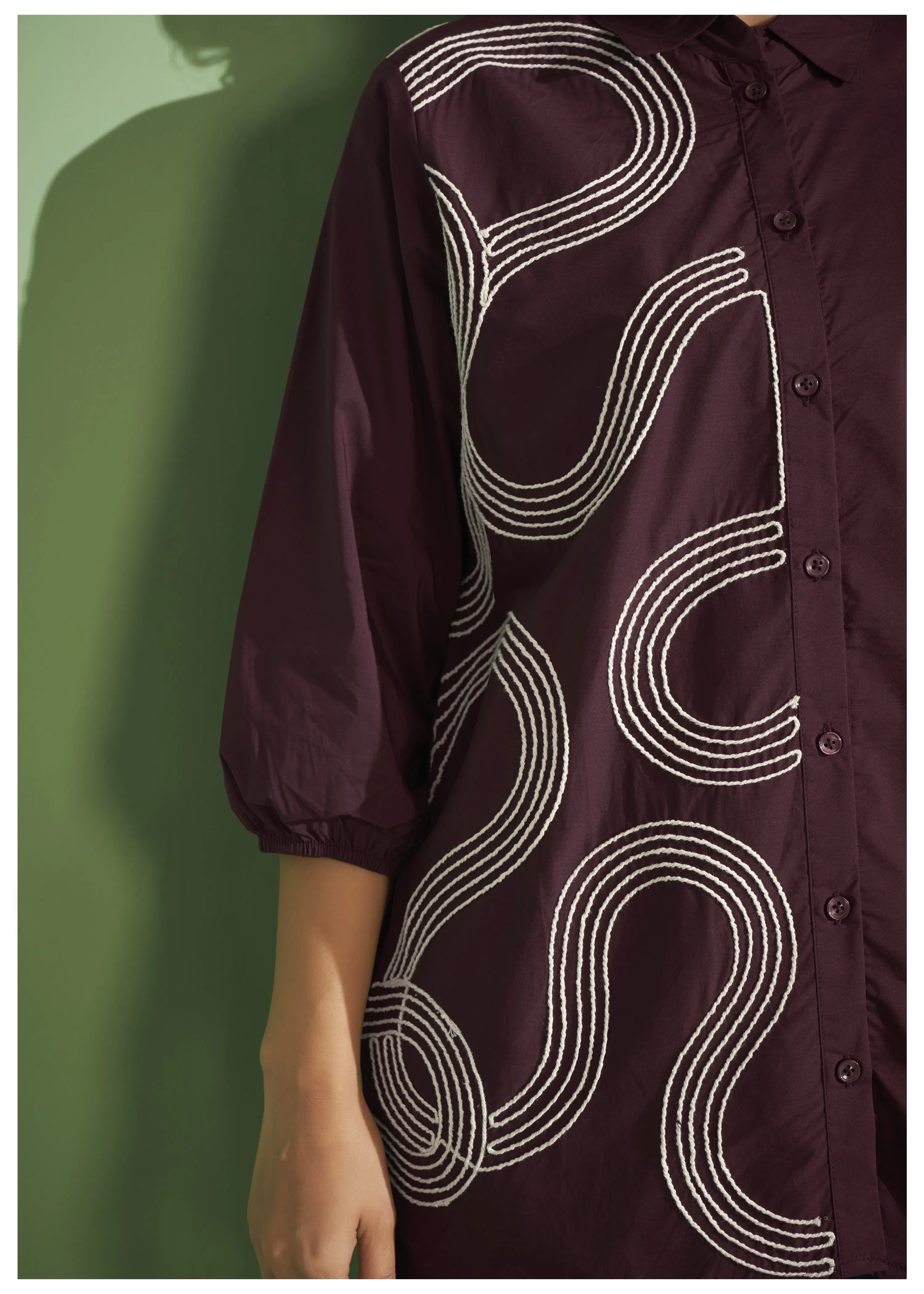 Make this maroon cotton poplin shirt with cord embroidery a versatile and elegant addition to your wardrobe for effortless style.